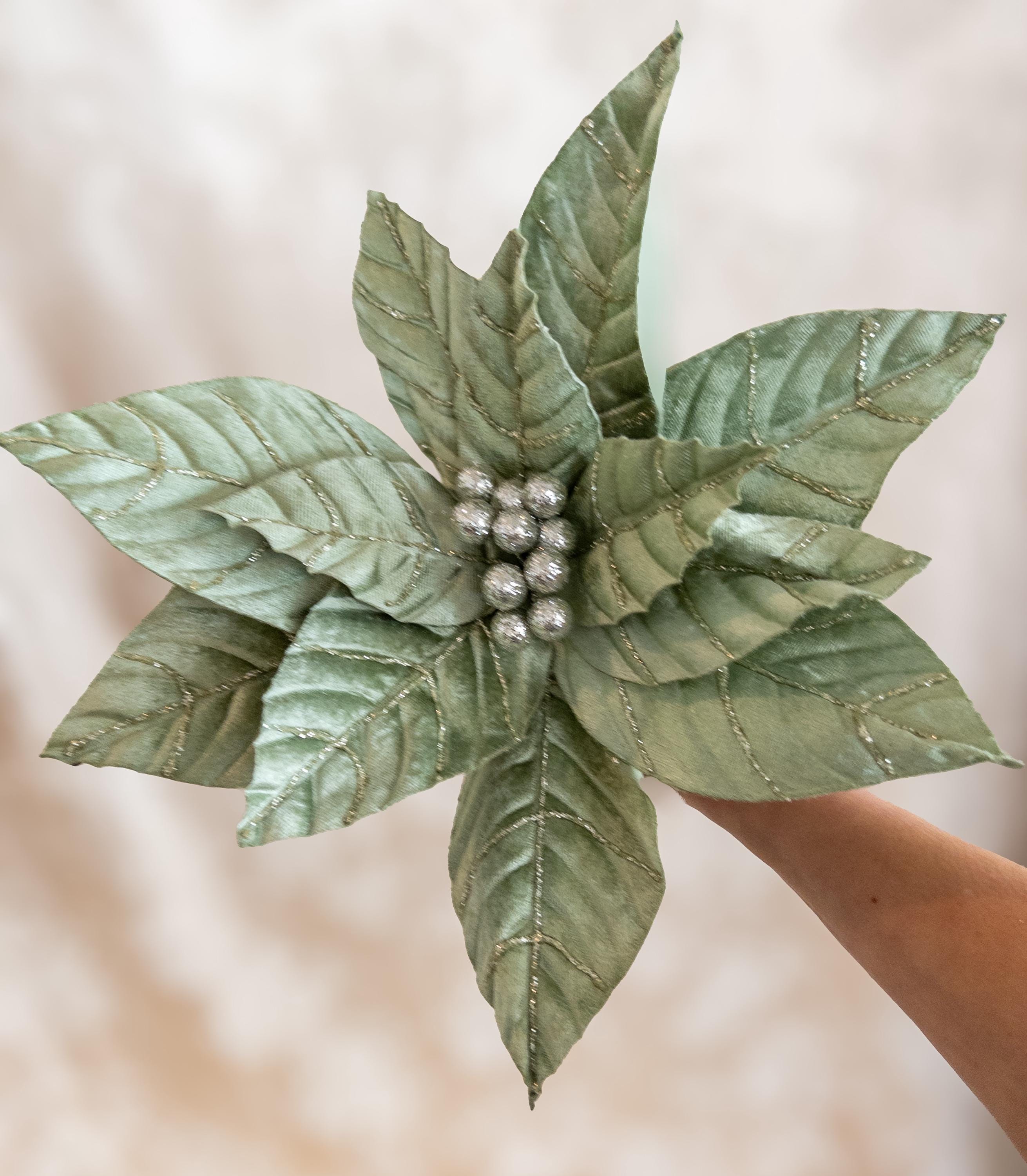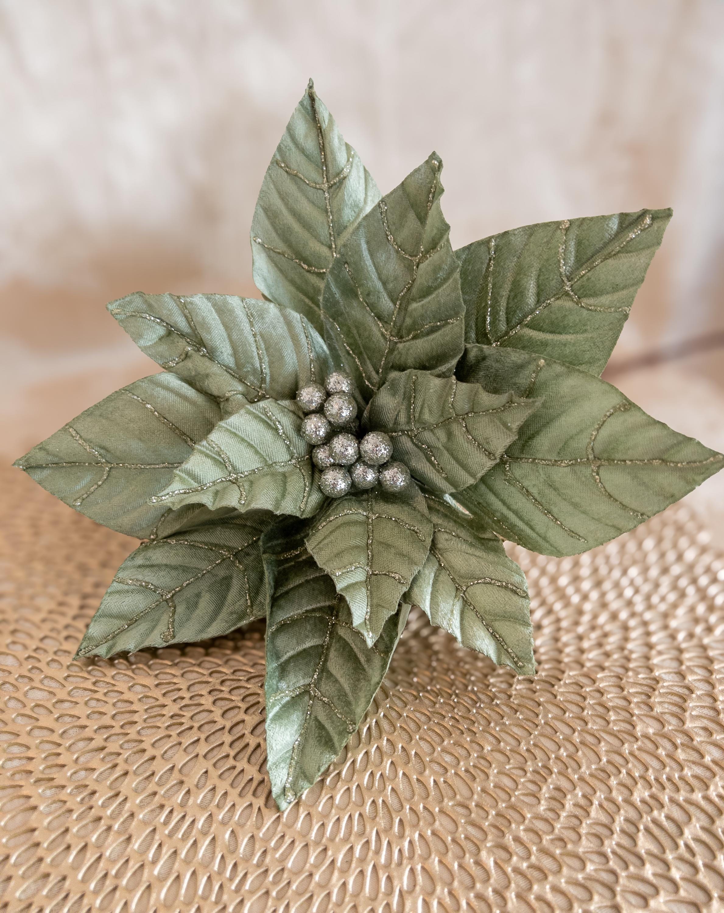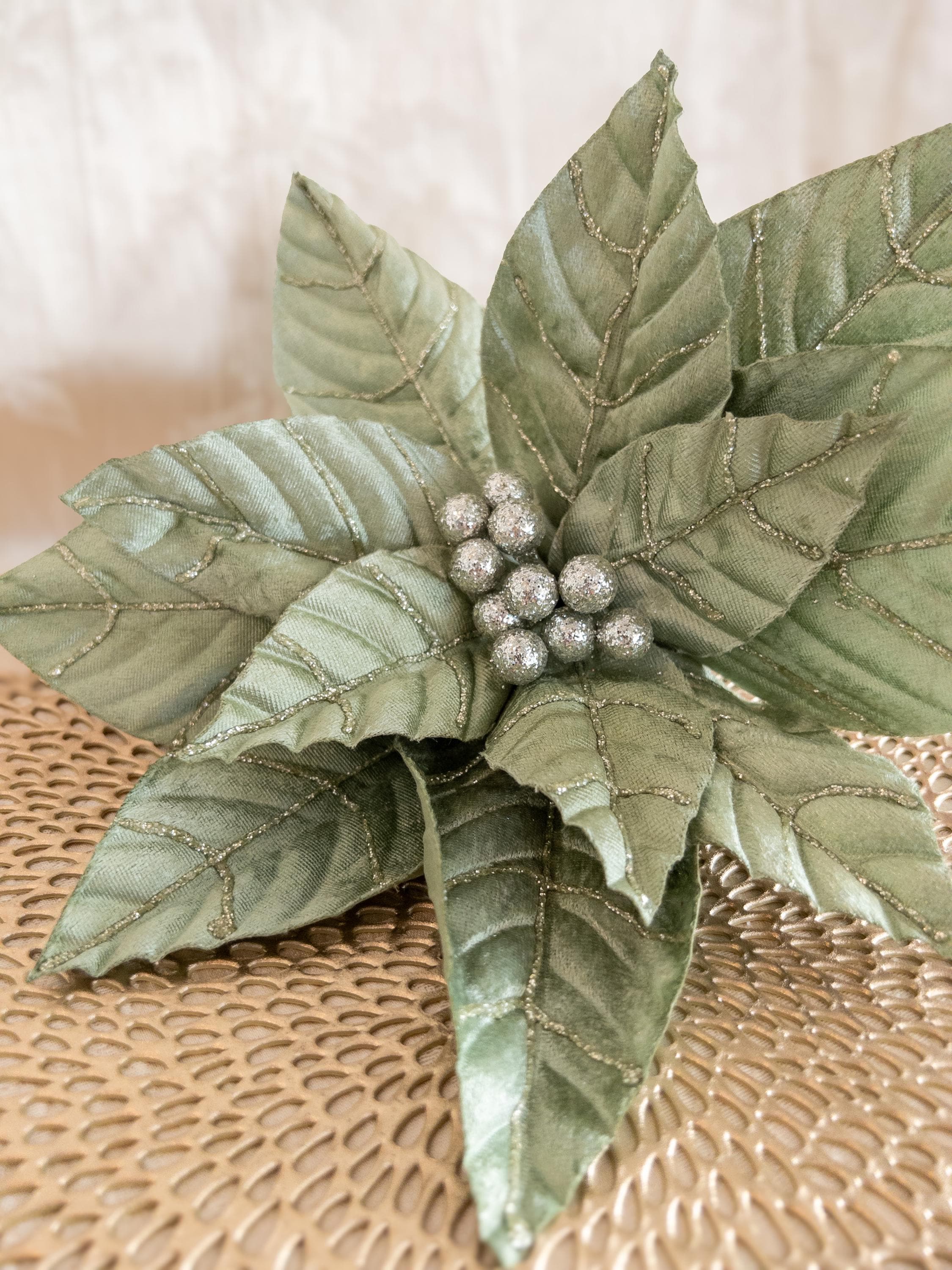 Bring a touch of refined holiday elegance to your décor with this Sage Green Velvet Poinsettia Stem. Measuring approximately 25 inches long, this stem features a beautifully detailed velvet poinsettia bloom about 12 inches across, accented with delicate glittered veining and sparkling silver berry clusters at the center.