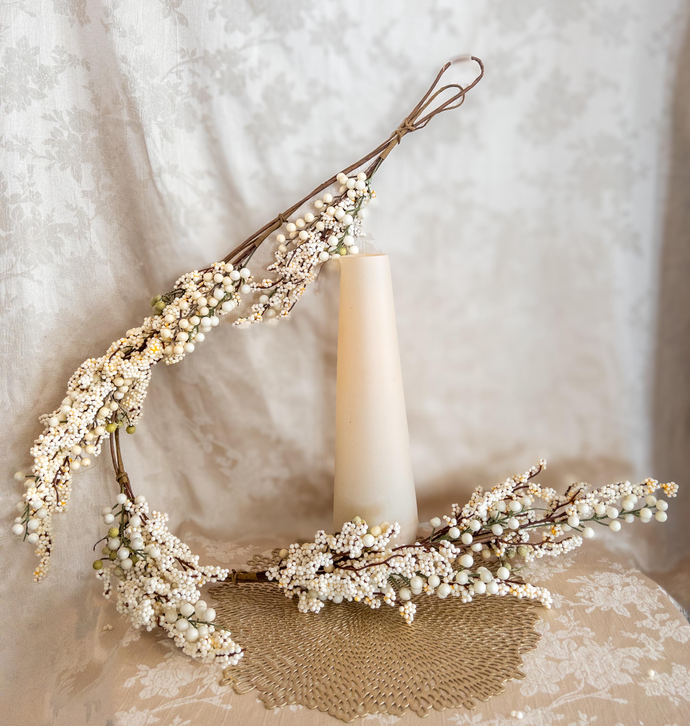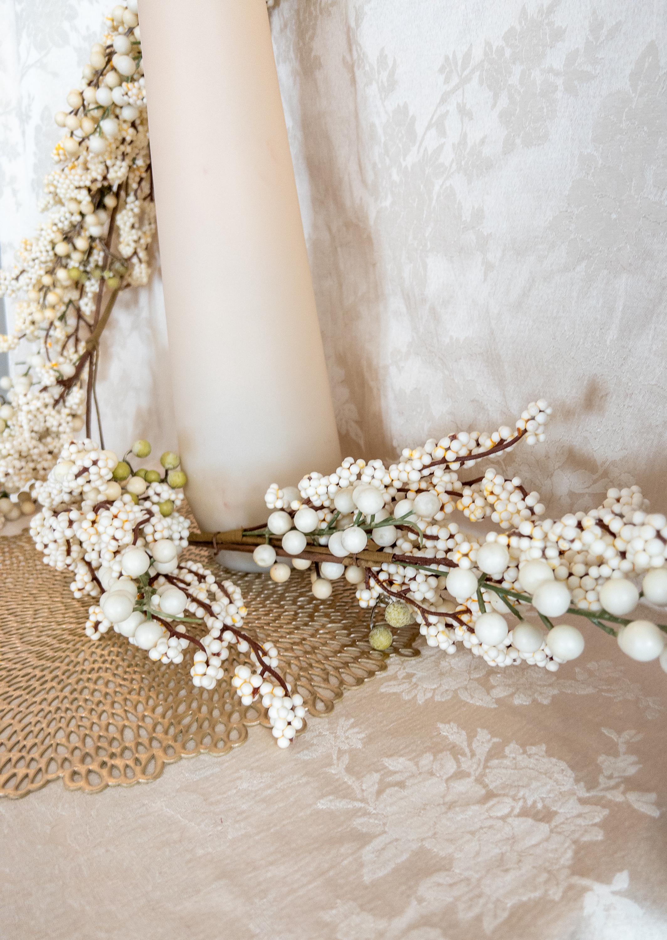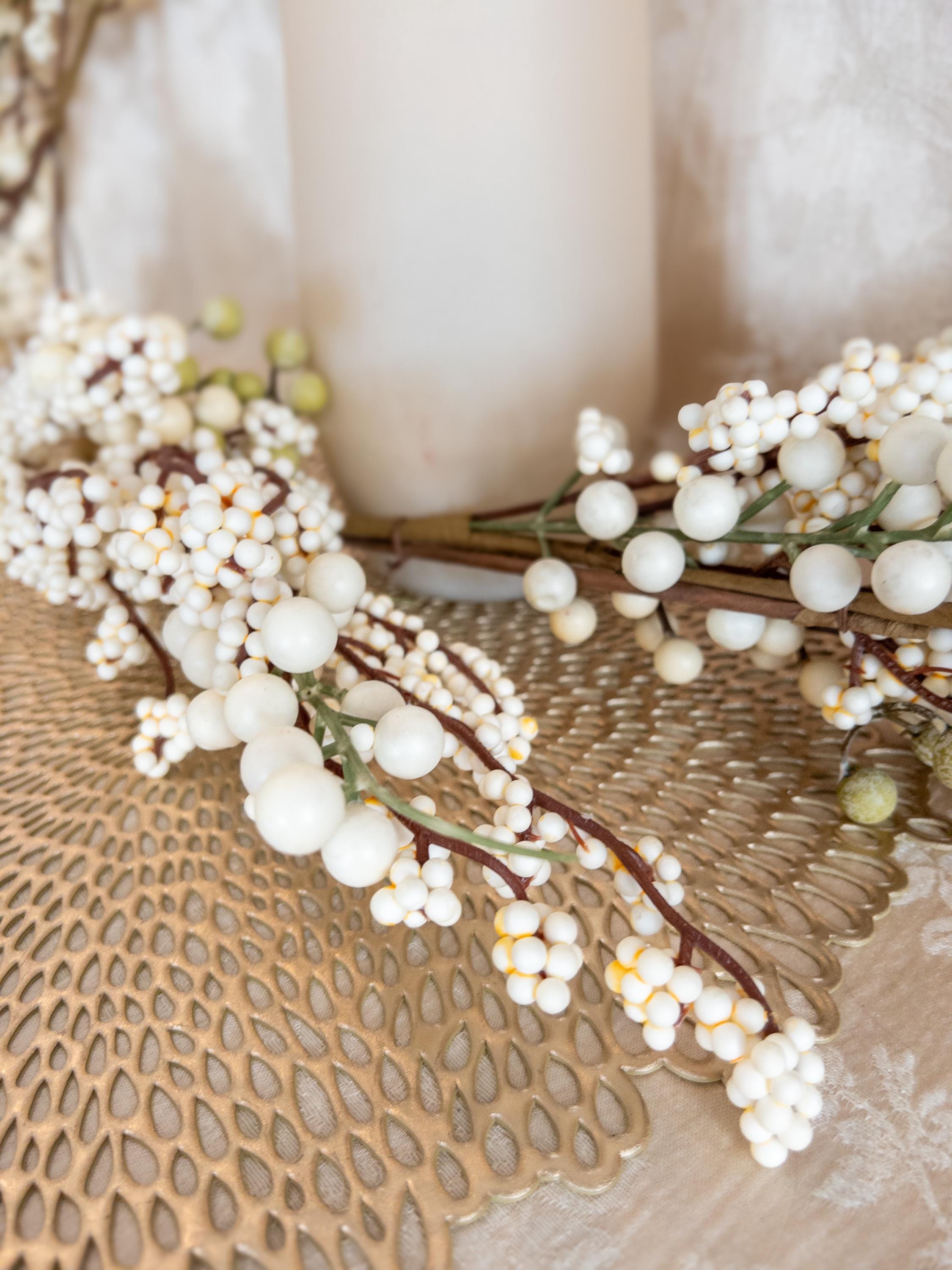Bring a soft, timeless touch to your décor with this Cream Berry Garland, featuring clusters of delicate ivory and pale green berries arranged along natural brown stems. Measuring approximately 60 inches long, this garland offers a beautifully full and flexible design that drapes effortlessly across mantels, shelves, or dining tables.