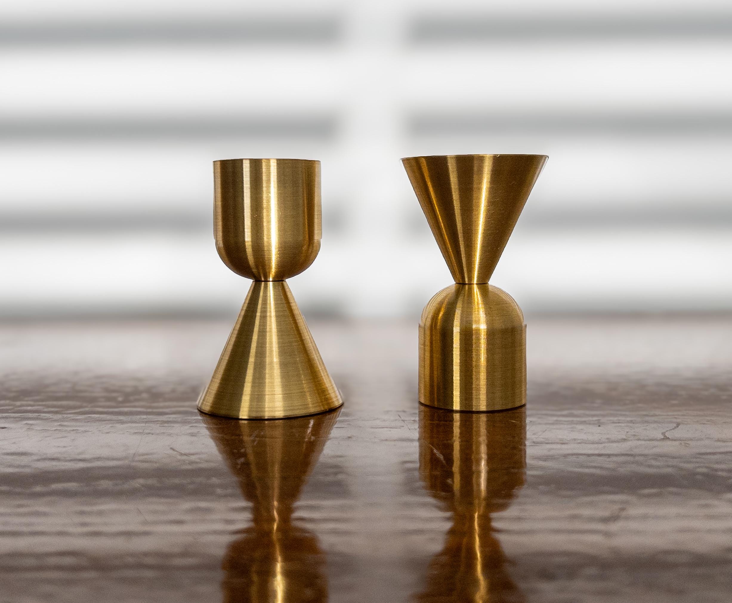 Elevate your tablescape with these sculptural brass-colored reversible taper candle holders. Each piece features clean, modern lines and a warm brushed-metal finish, giving your décor a polished, contemporary touch.