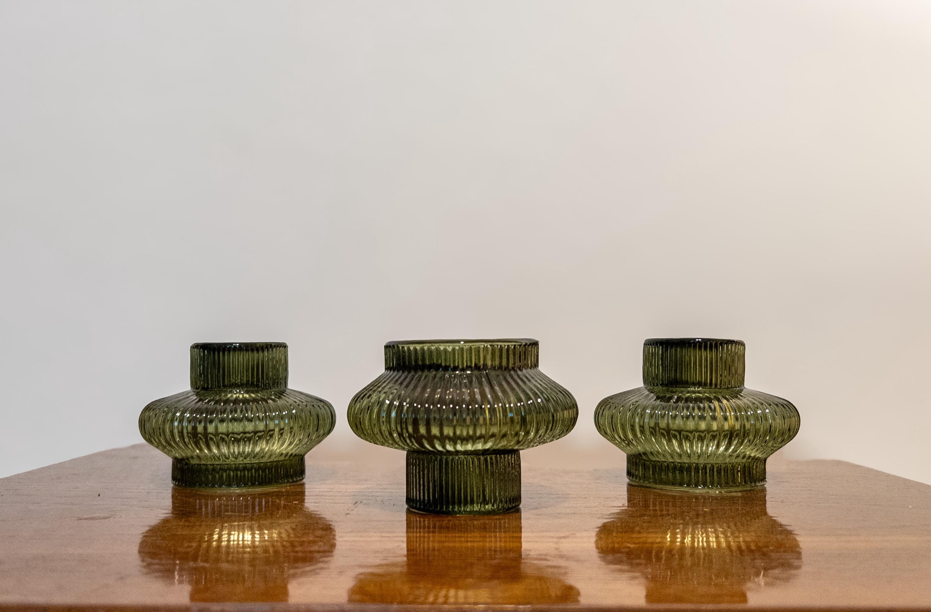 Crafted in a rich olive-green glass with vertical ribbing, these pieces add texture, dimension, and subtle retro flair to mantels, dining tables, shelves, and wedding décor. Whether you use a single holder or group several together, their sculptural silhouette creates a stunning warm glow.
