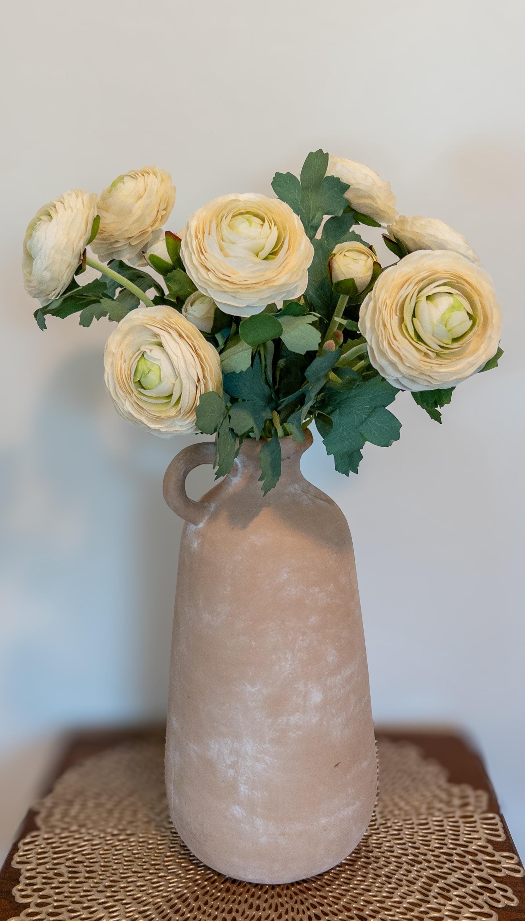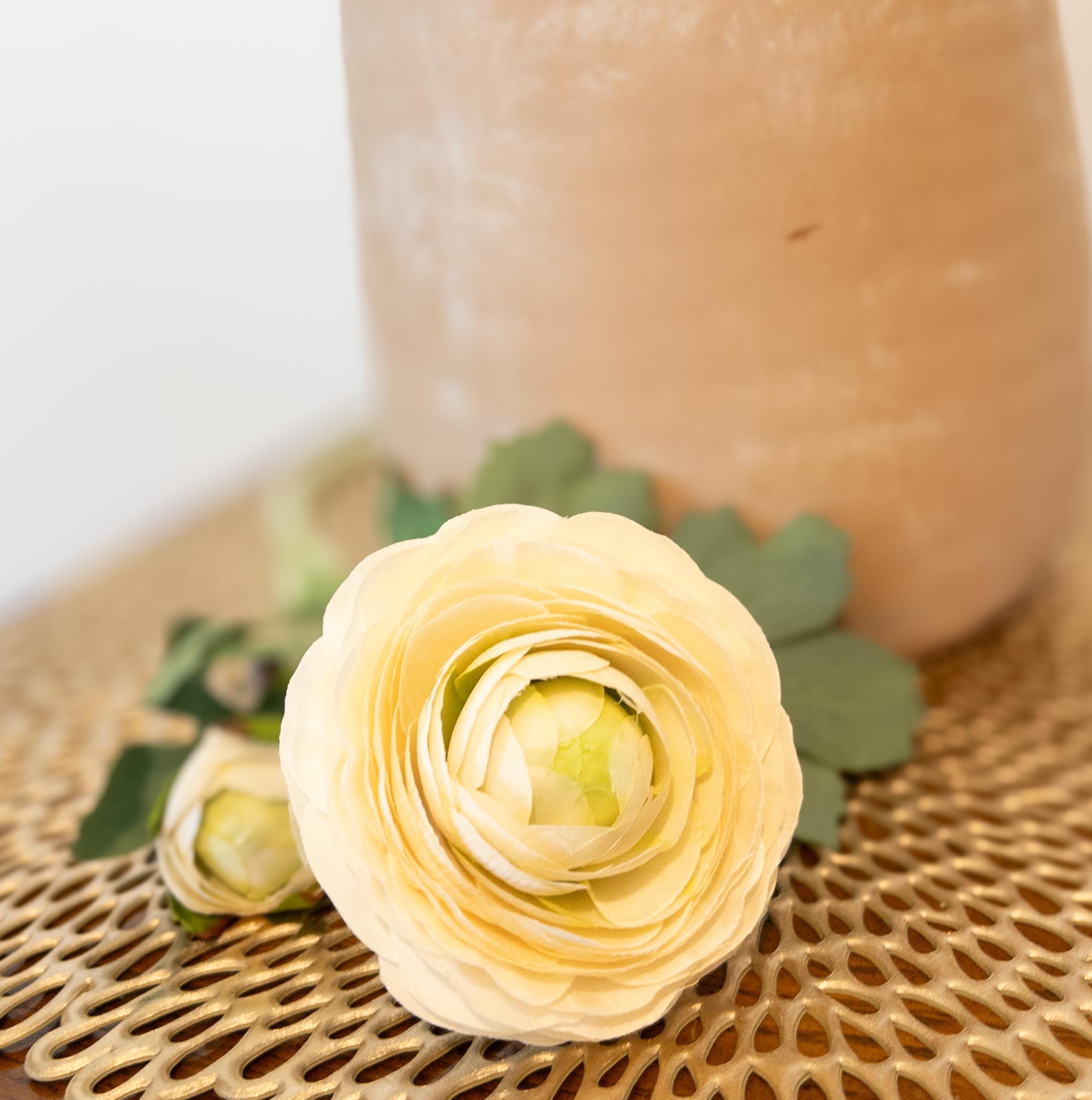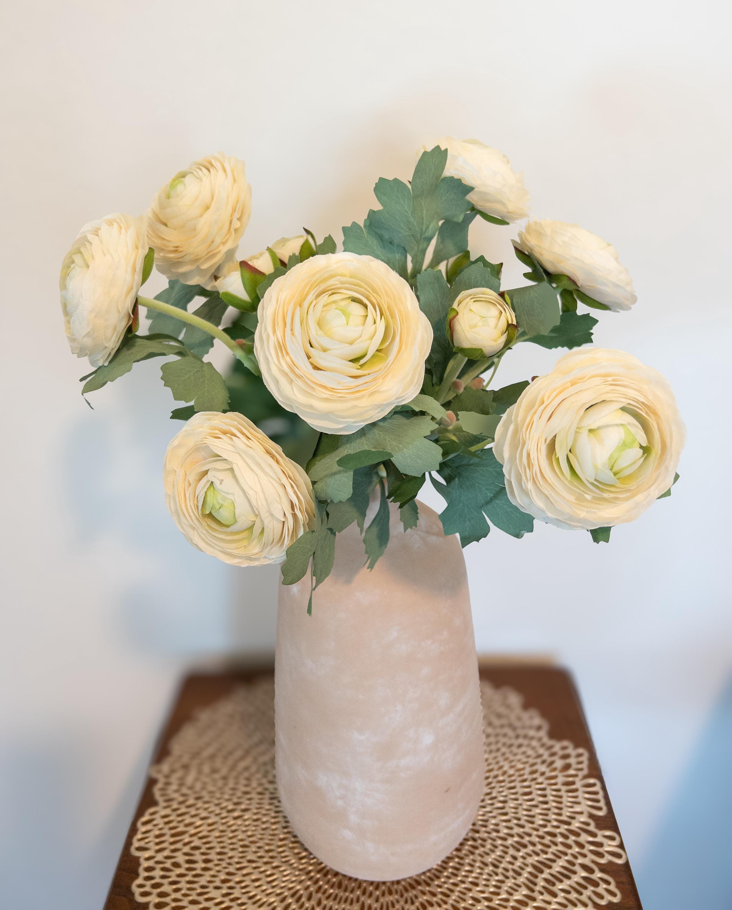 These gorgeous cream ranunculus blooms are so lifelike, their soft, layered petals and pale green centers will have you doing a double-take. Designed with incredible attention to detail, each bloom mimics the delicate, paper-thin layers of real ranunculus—perfect for adding timeless elegance to your floral styling.