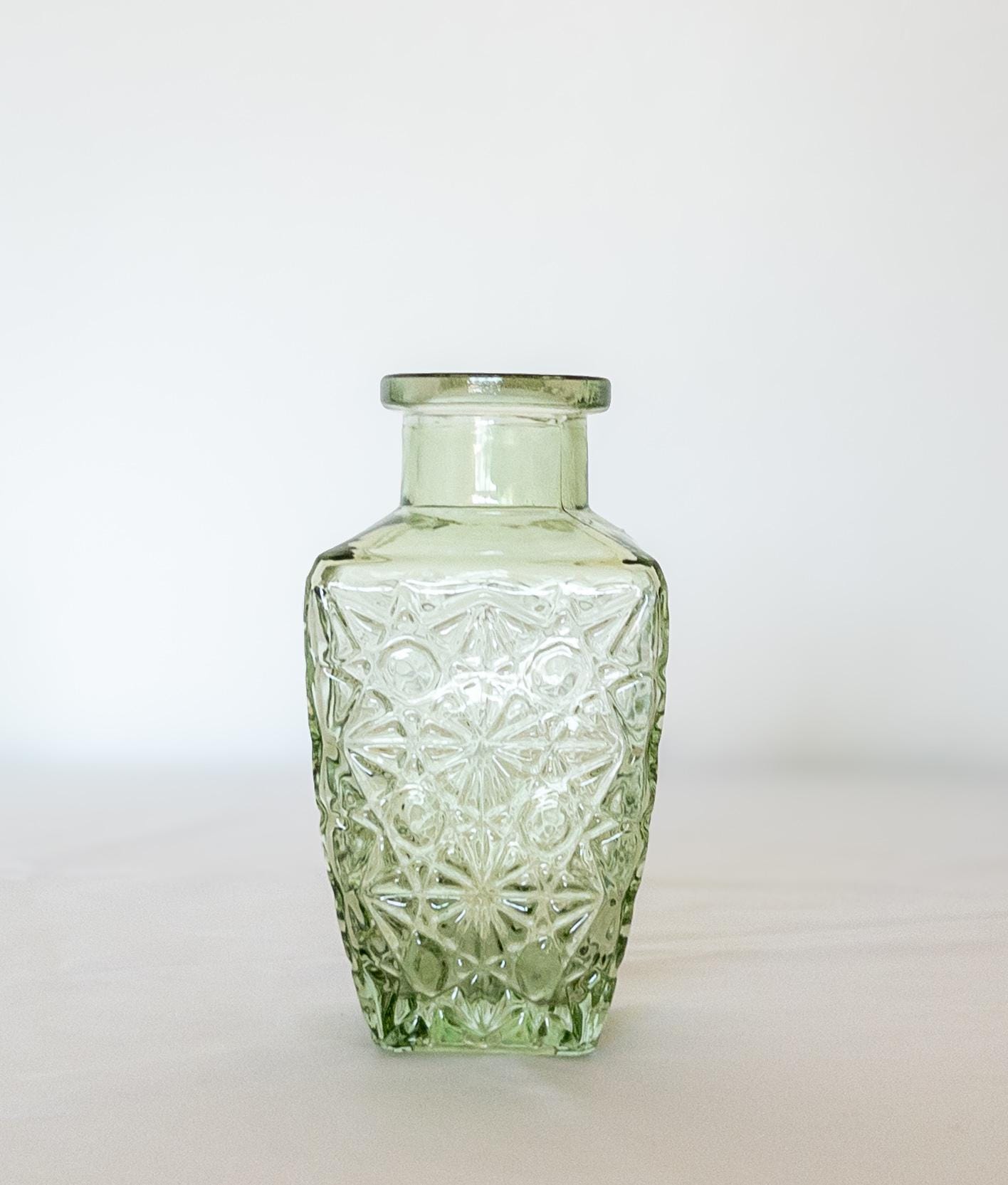 A lovely assortment of green glass bud vases, each featuring a distinct silhouette and textured detailing inspired by vintage glassware. These petite vases are perfect for showcasing a single bloom, a few clipped garden stems, or styled on their own as decorative accents throughout your home.