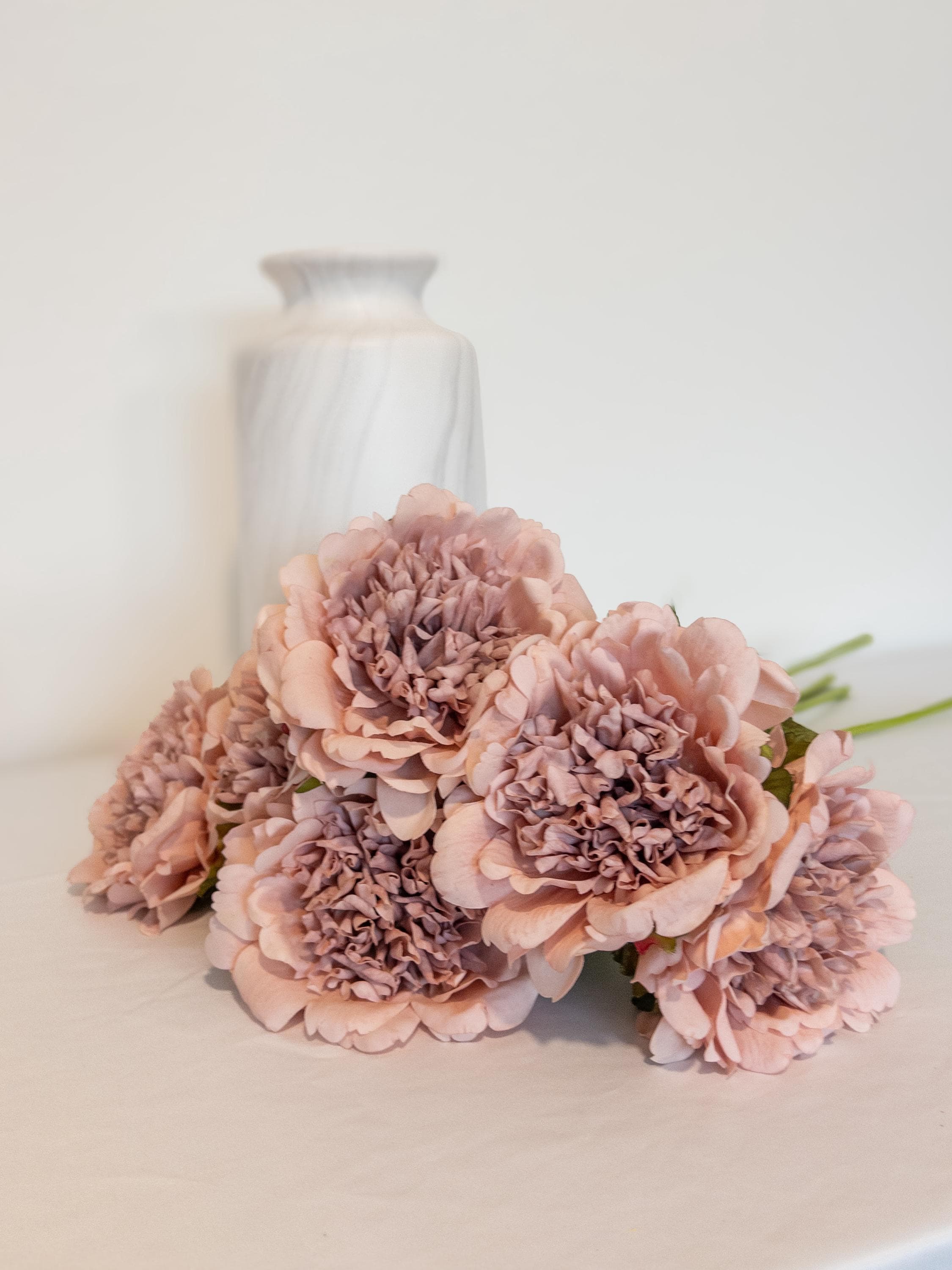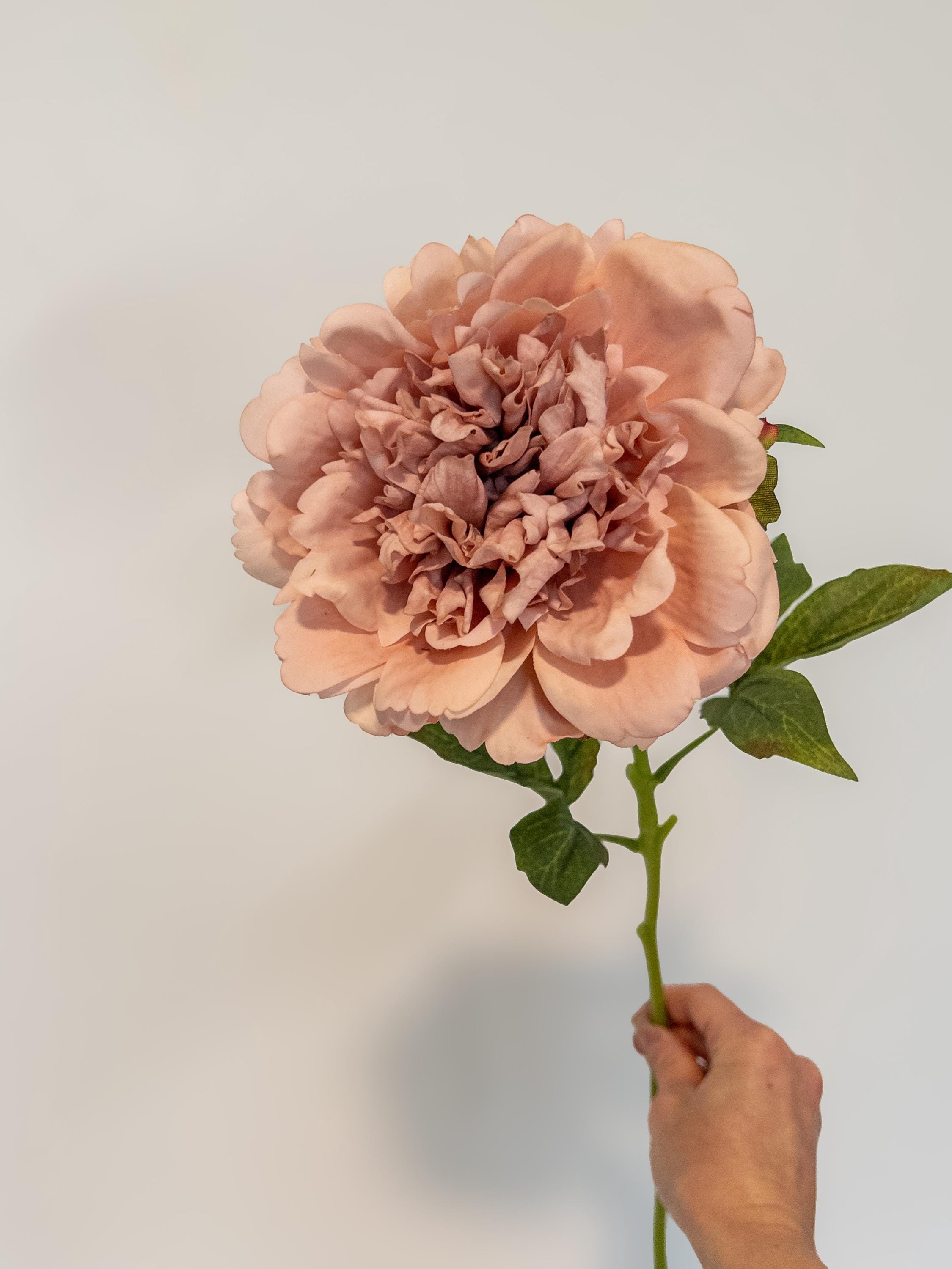 The petals have a lightly moisturized, velvety touch that mimics fresh blooms, while the sturdy yet flexible stem allows for easy shaping and effortless styling. Whether displayed as a single statement flower or layered into a lush arrangement, this peony adds softness and sophistication to any space.