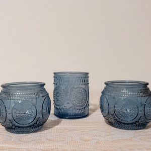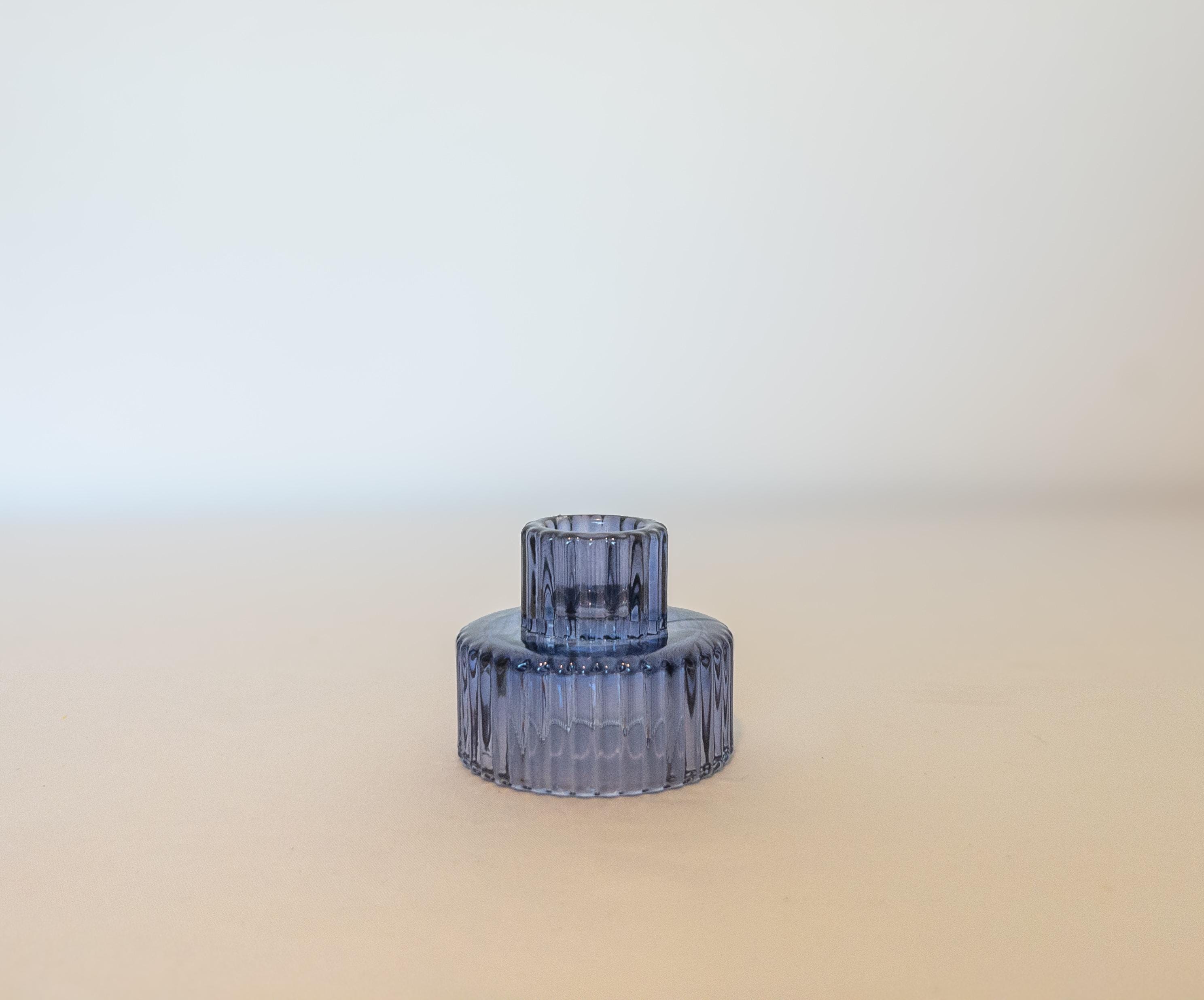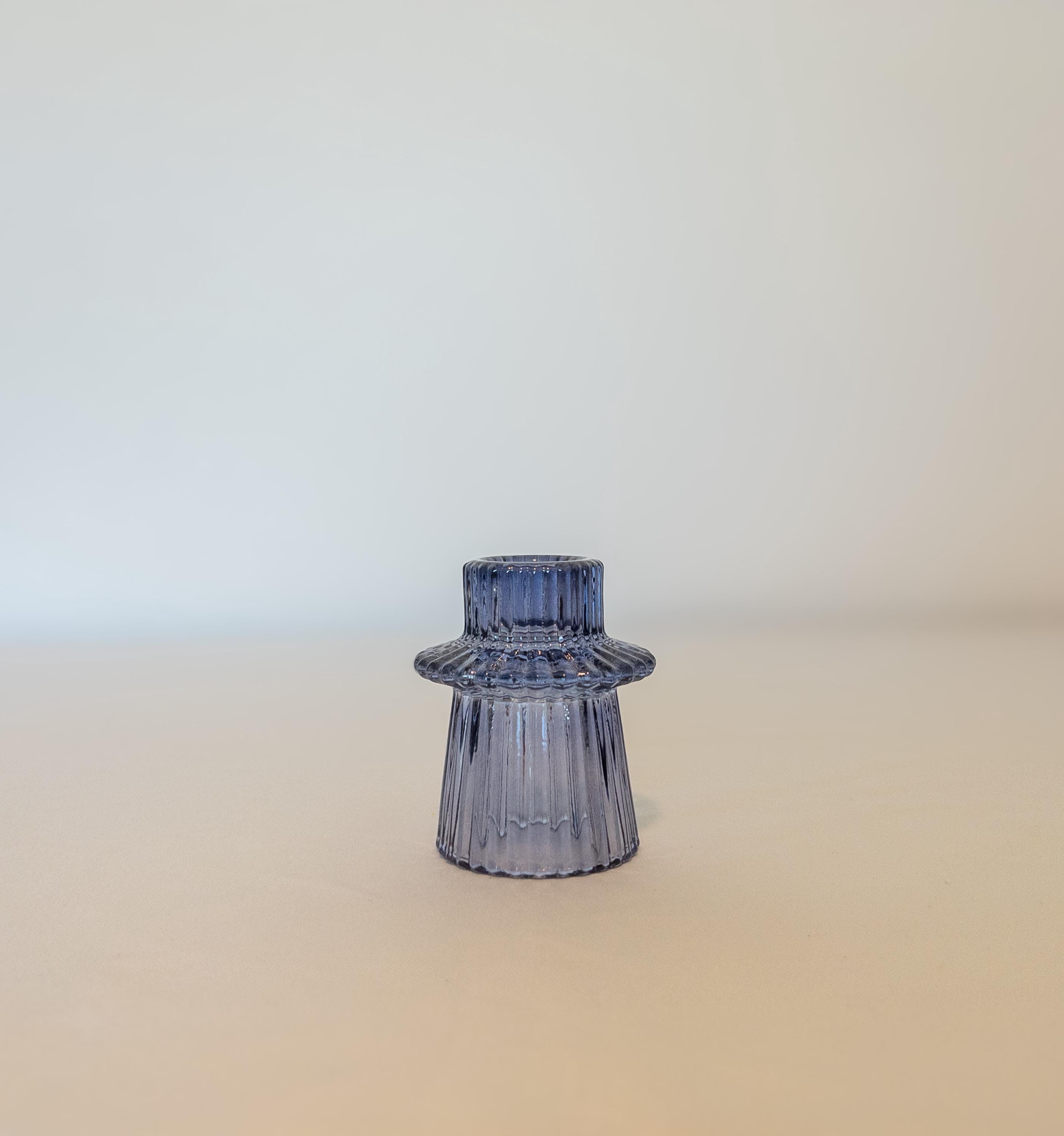 Smoky slate blue glass, softly ribbed and timeless in form.