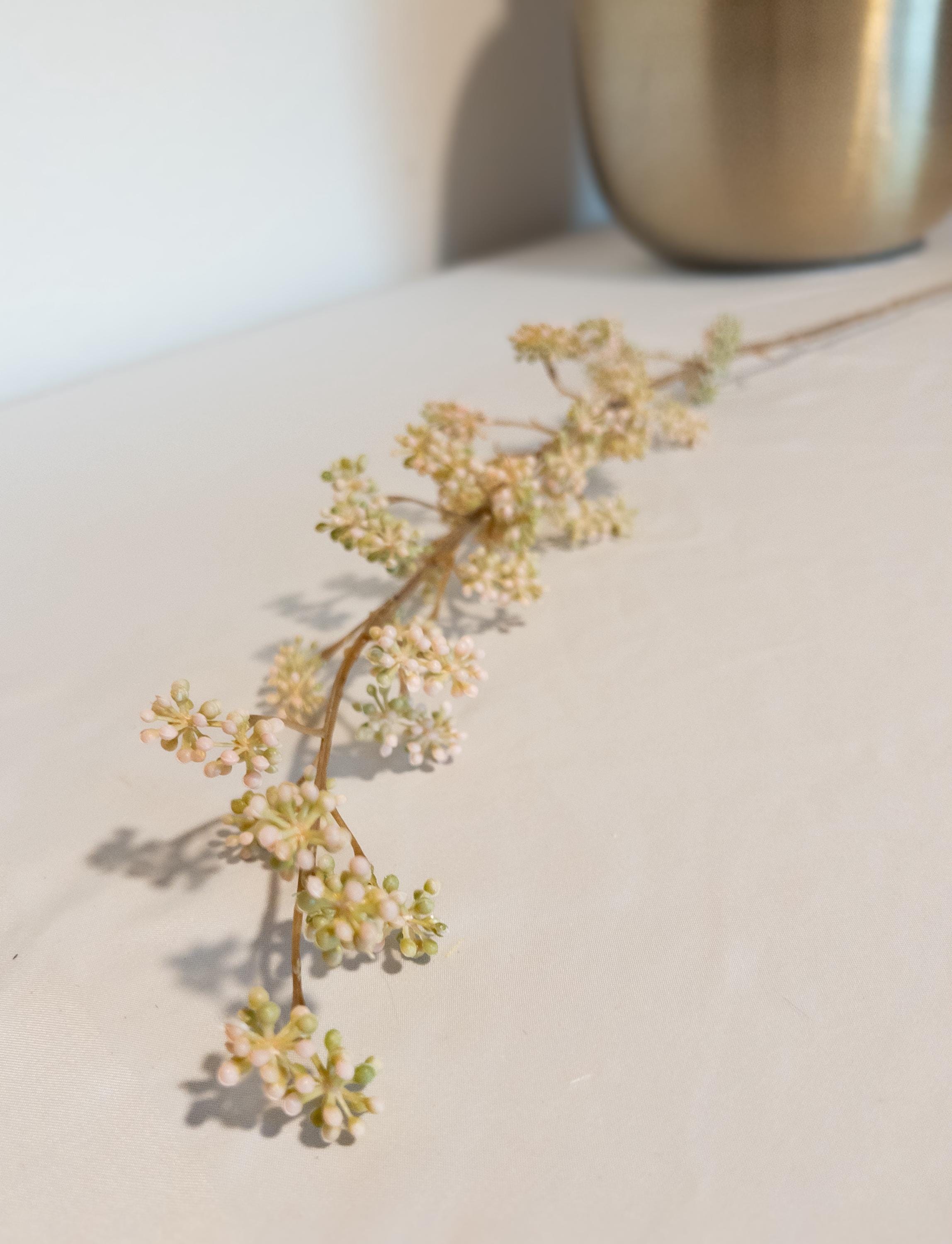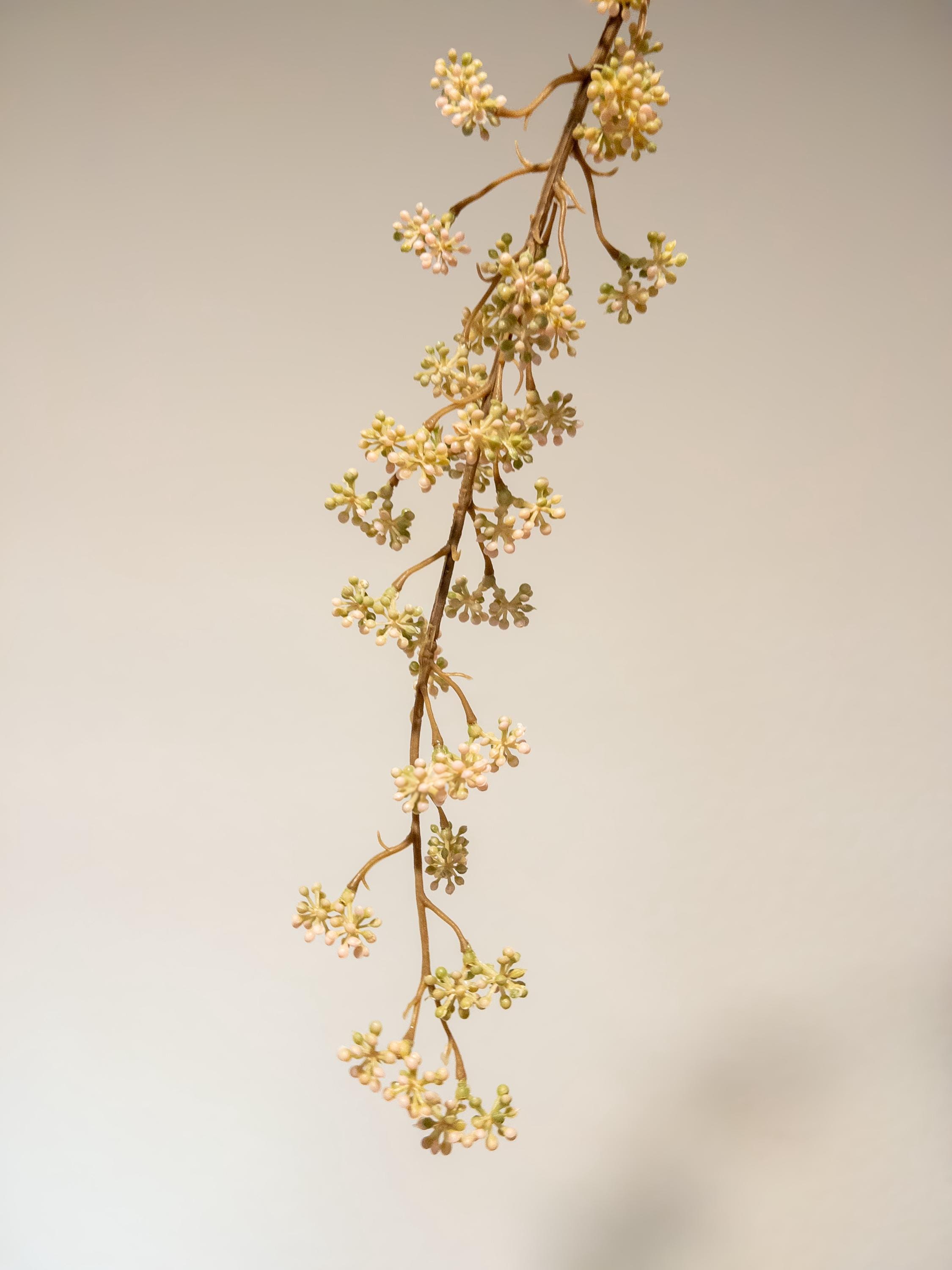 Add a whisper of spring to your home with this pink and green berry stem - featuring tiny, clustered buds in the softest blush tones with fresh hints of green. Delicate, airy, and full of movement, this stem brings a natural, budding-branch look to any arrangement.