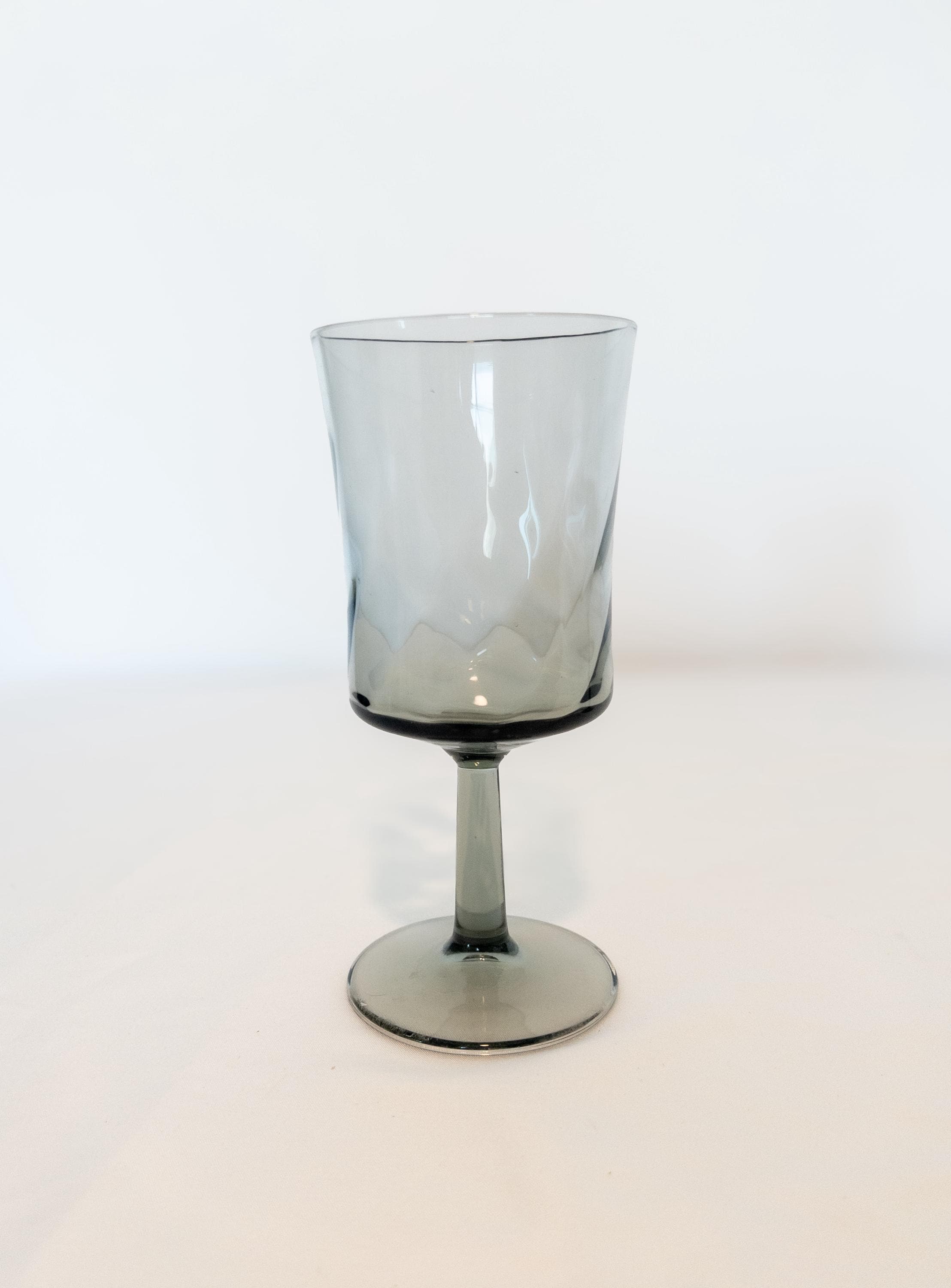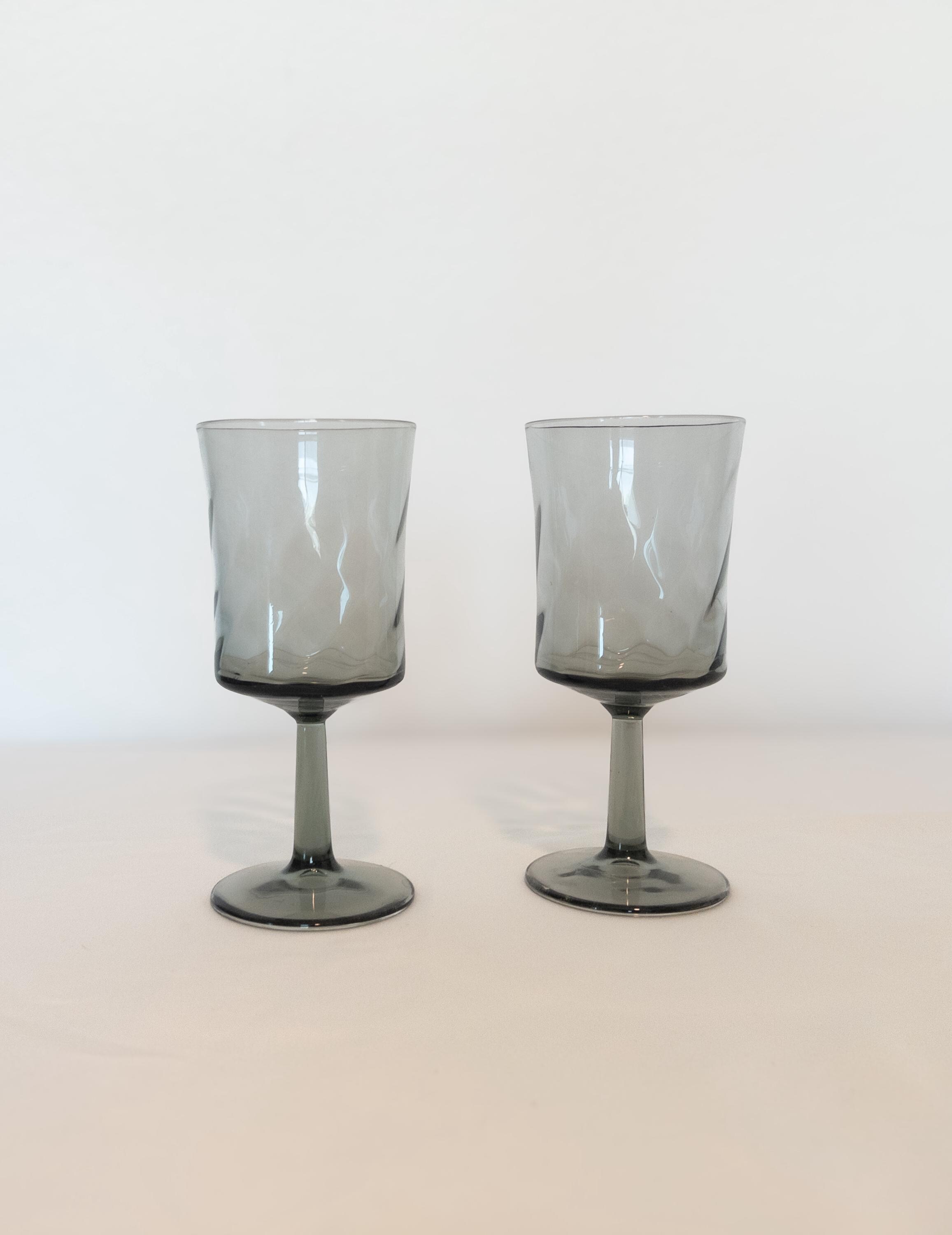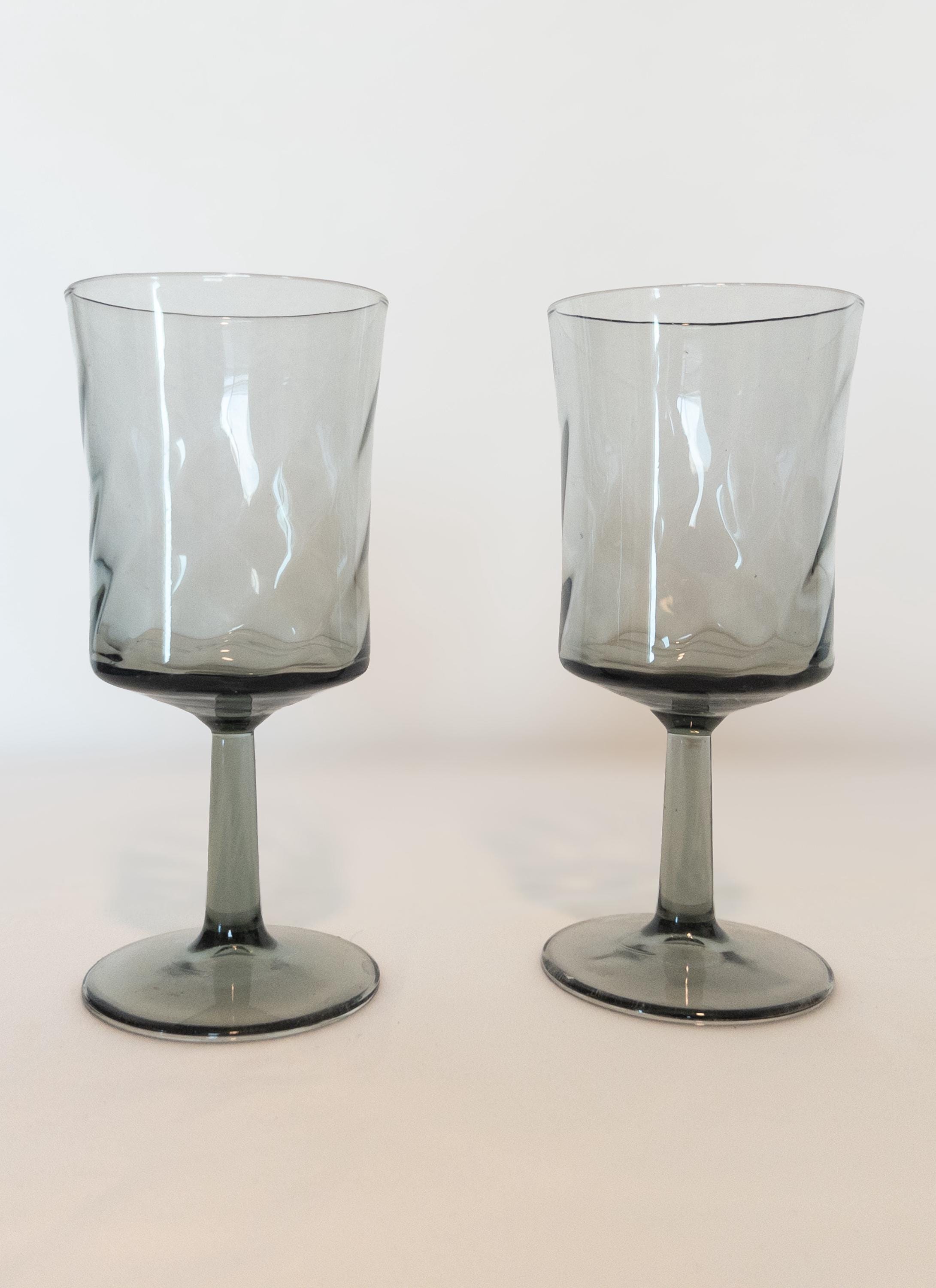 Raise a glass in vintage style with this beautiful set of smoky gray wine glasses, featuring a truly unique silhouette and an elegant swirl pattern in the glass.