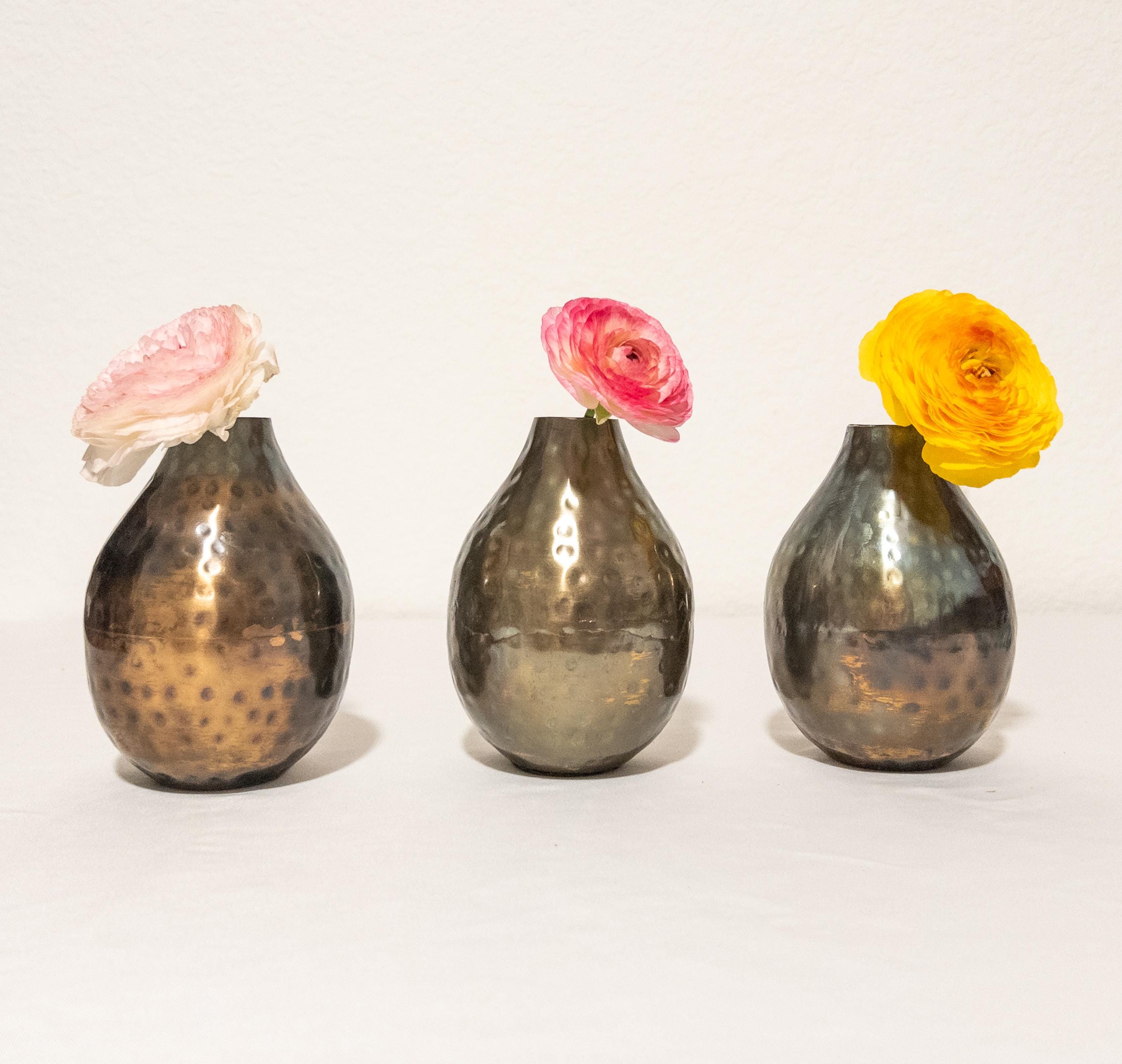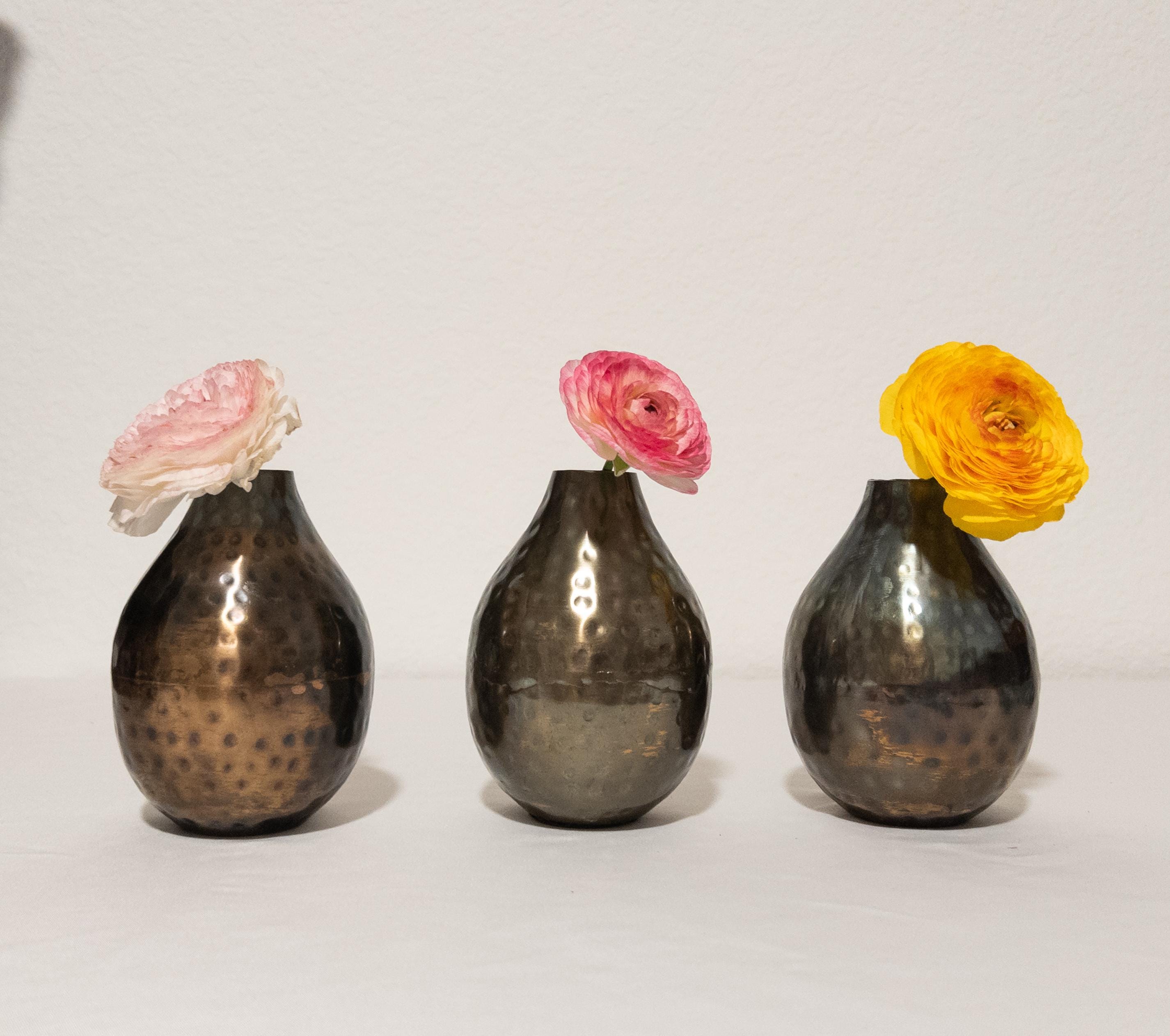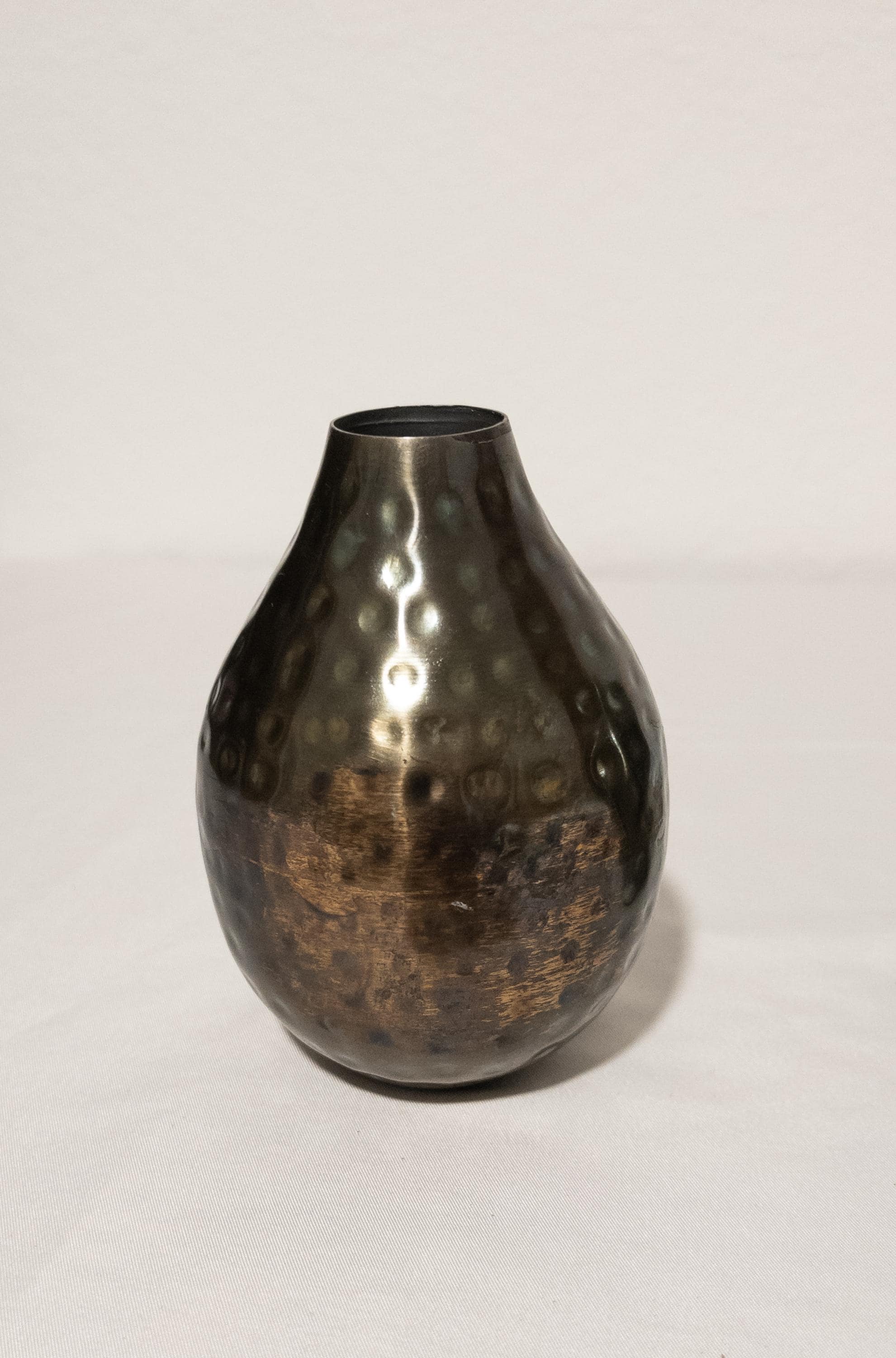 Moody, warm, and beautifully textural — this hammered metal bud vase features a softly rounded bottle silhouette with an antiqued bronze finish and subtle dimpled detailing.