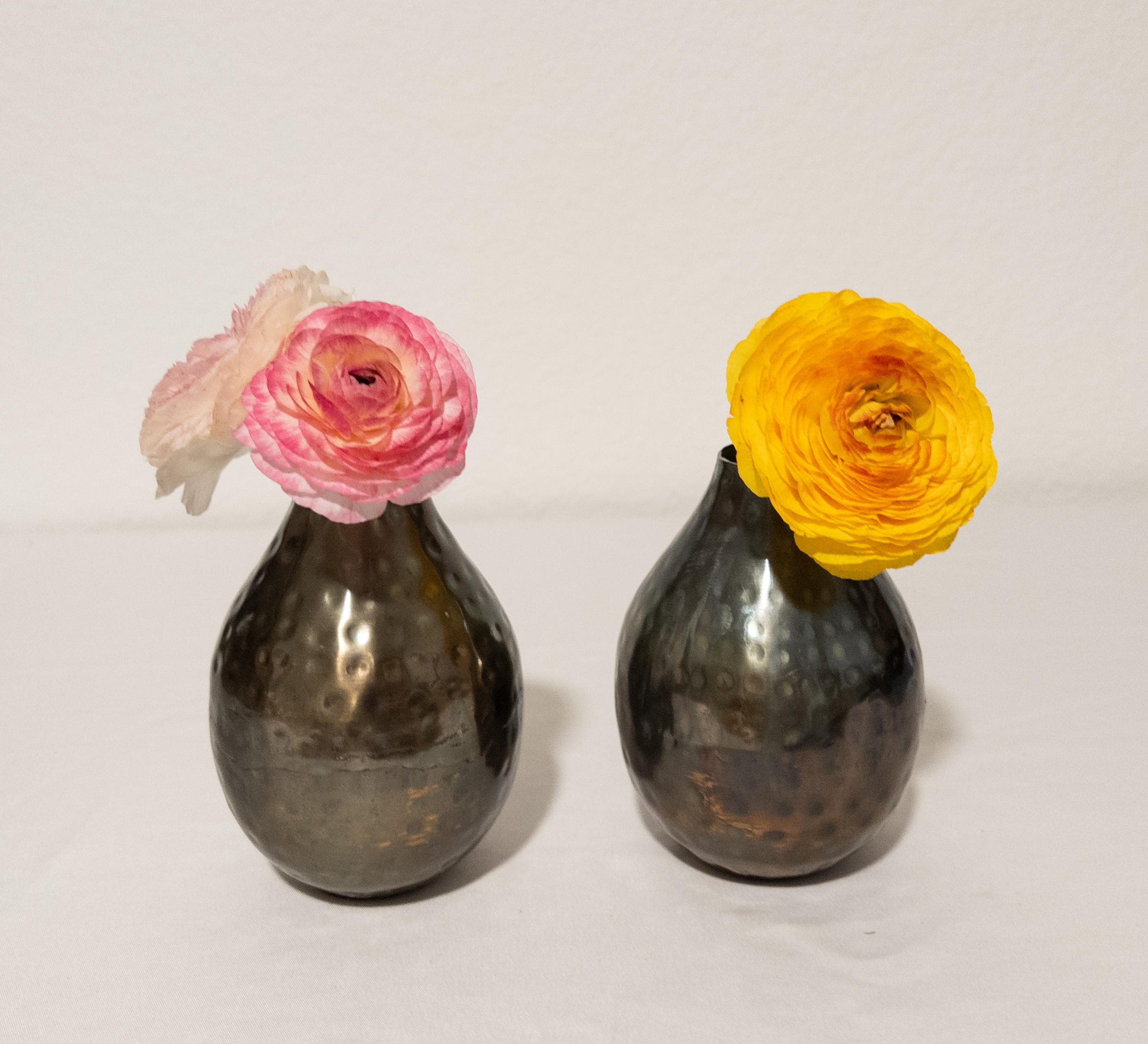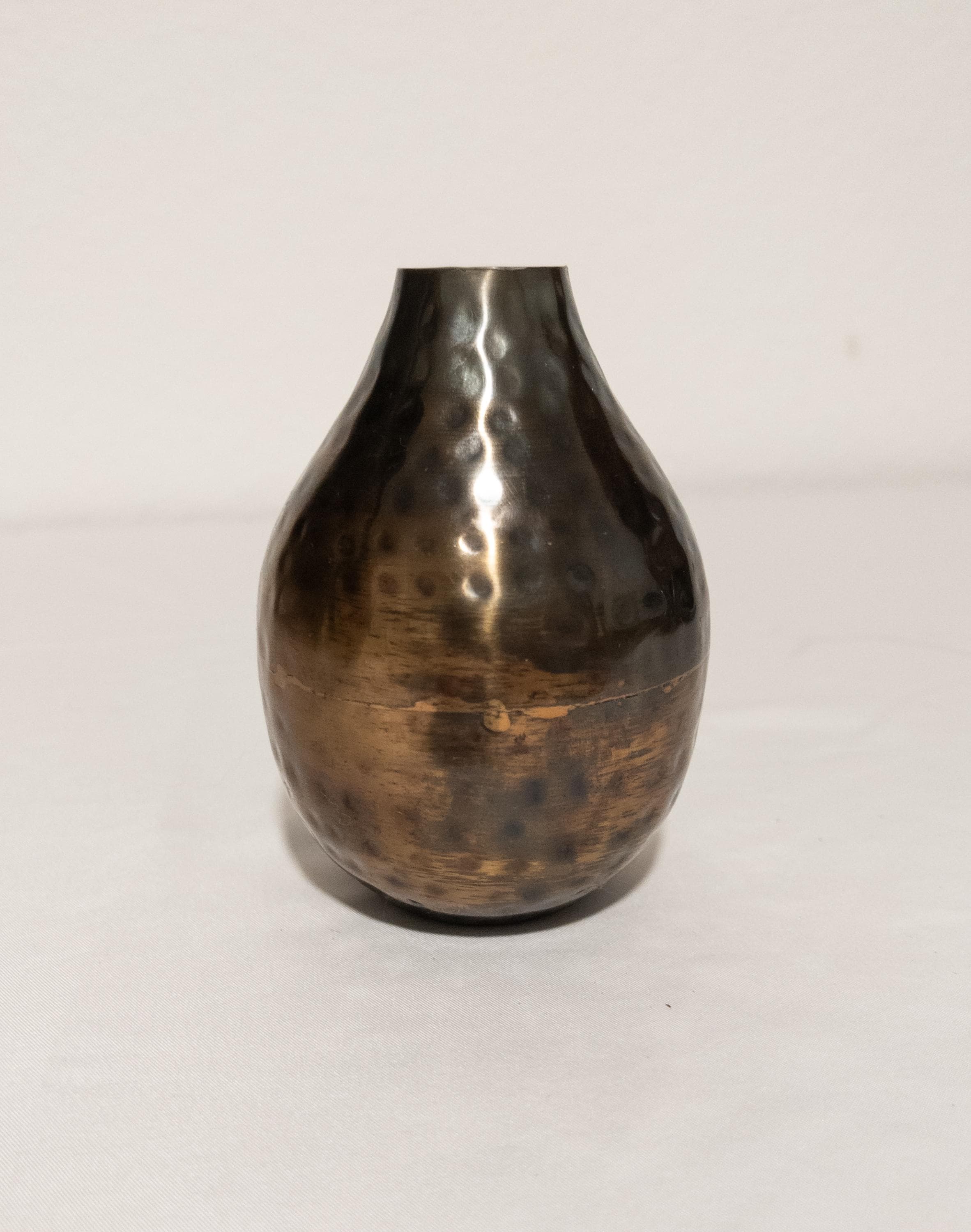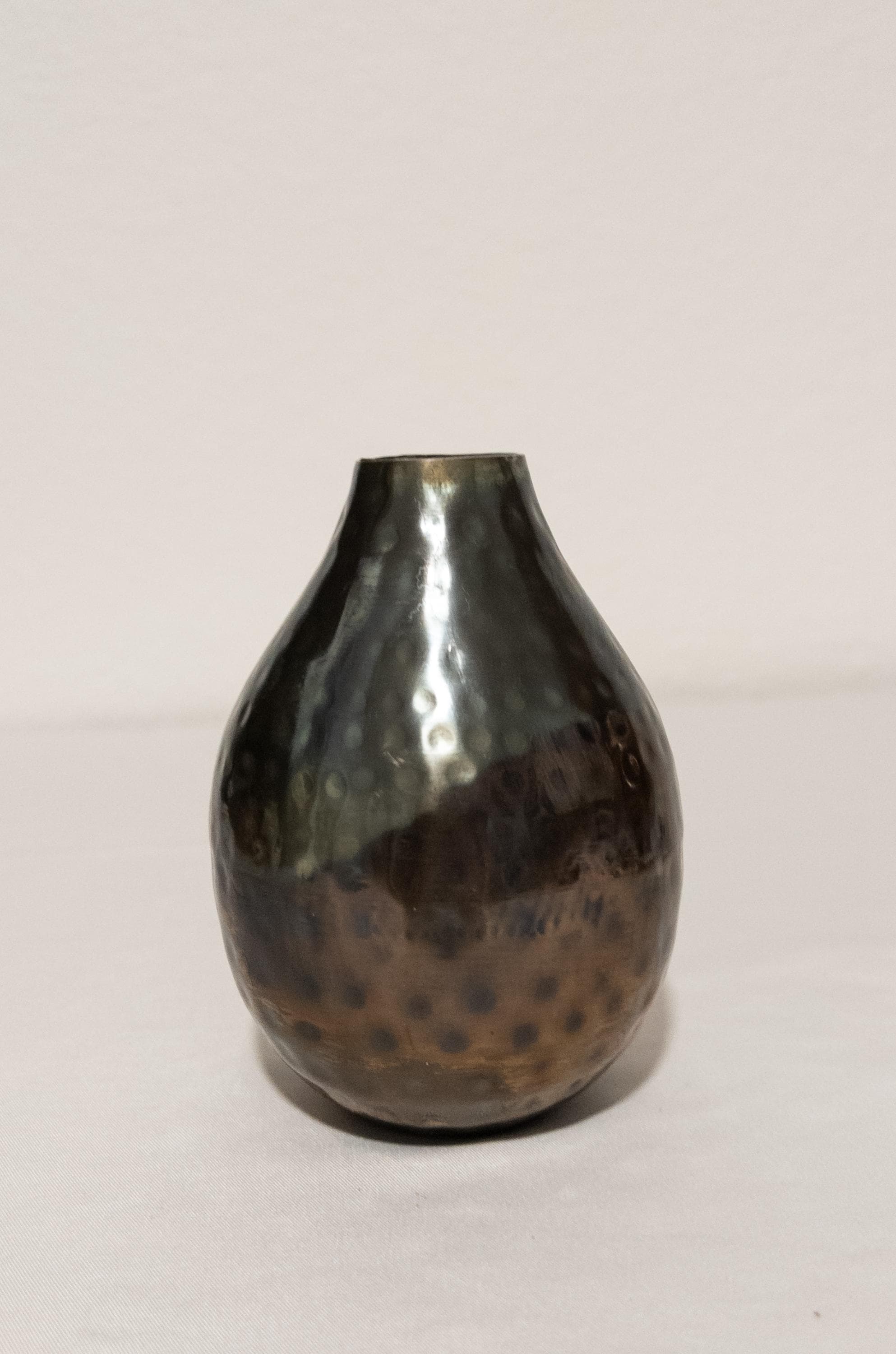Moody, warm, and beautifully textural — this hammered metal bud vase features a softly rounded bottle silhouette with an antiqued bronze finish and subtle dimpled detailing.