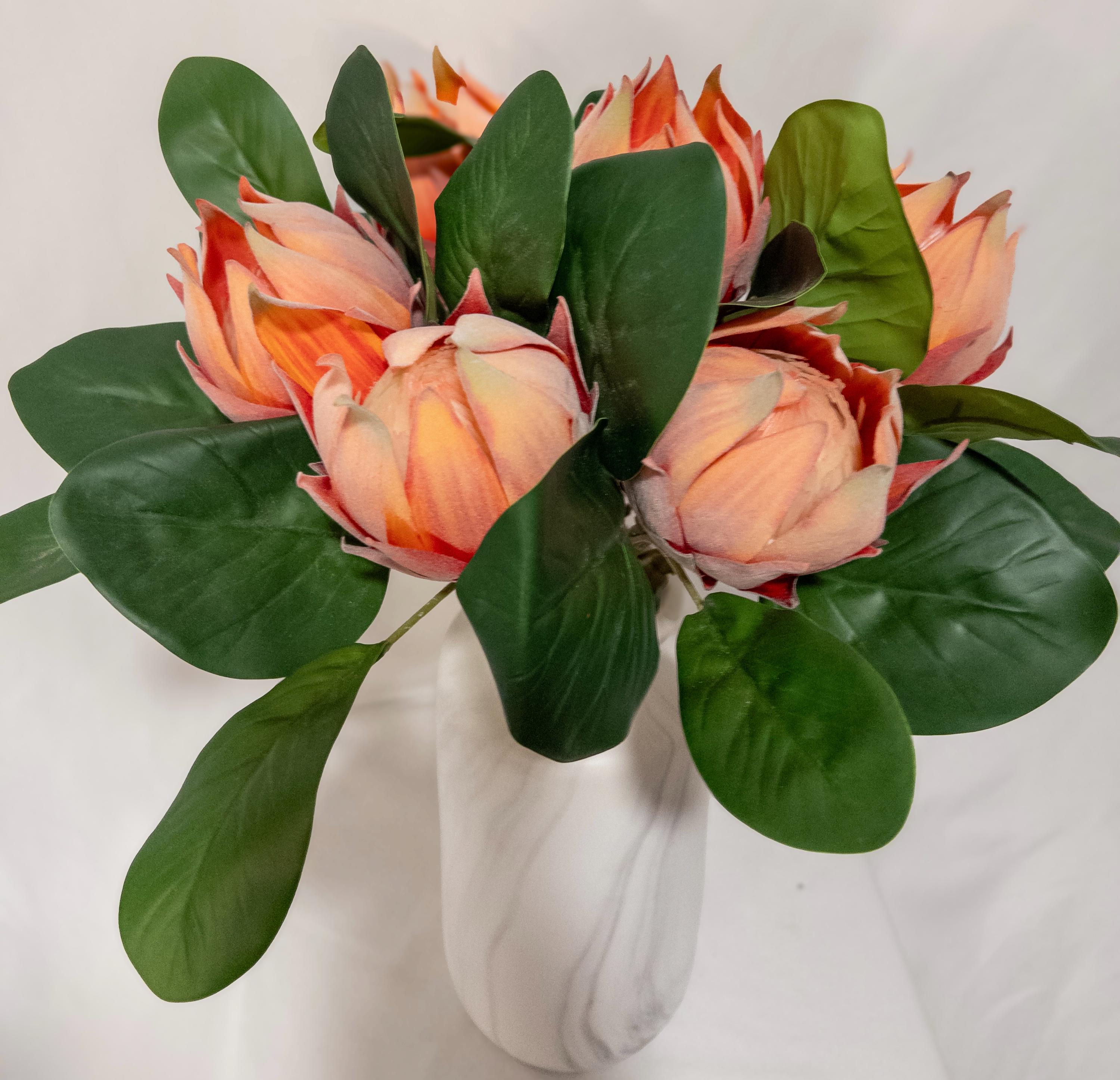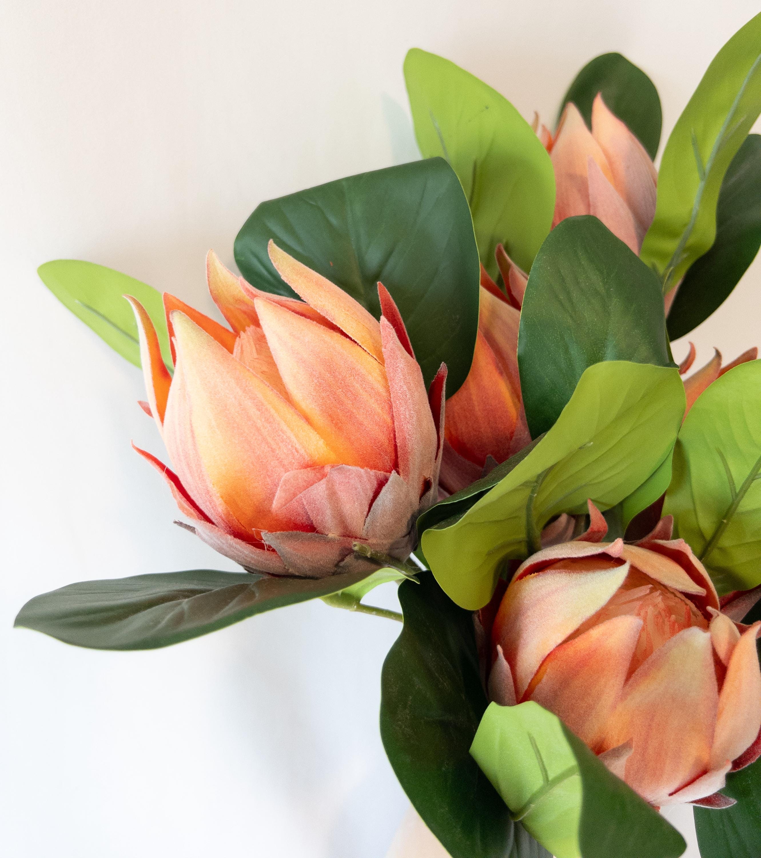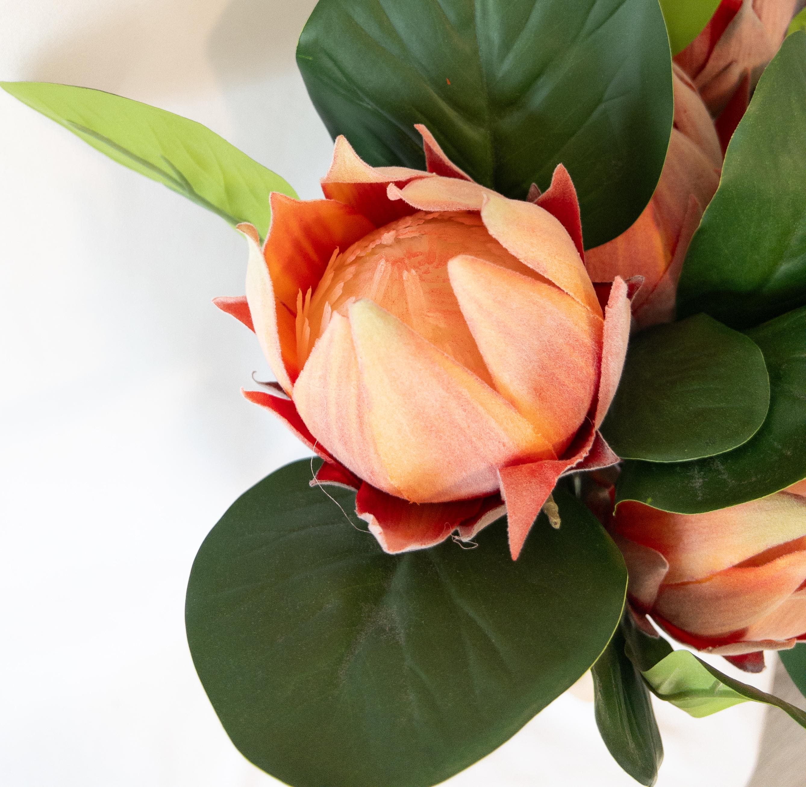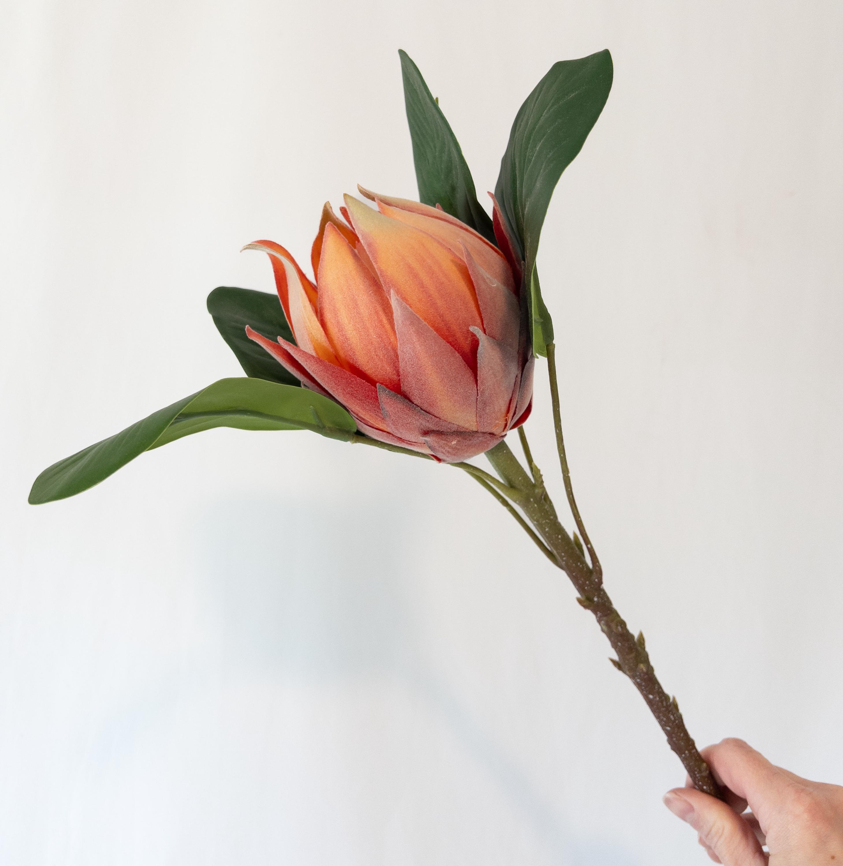 This faux protea features layered petals in warm coral, peach, and soft blush tones with subtle shading that gives it incredible depth. The petals have the same soft, velvety texture you’d expect from a real protea, adding to its realistic feel and high-end look.