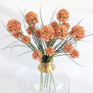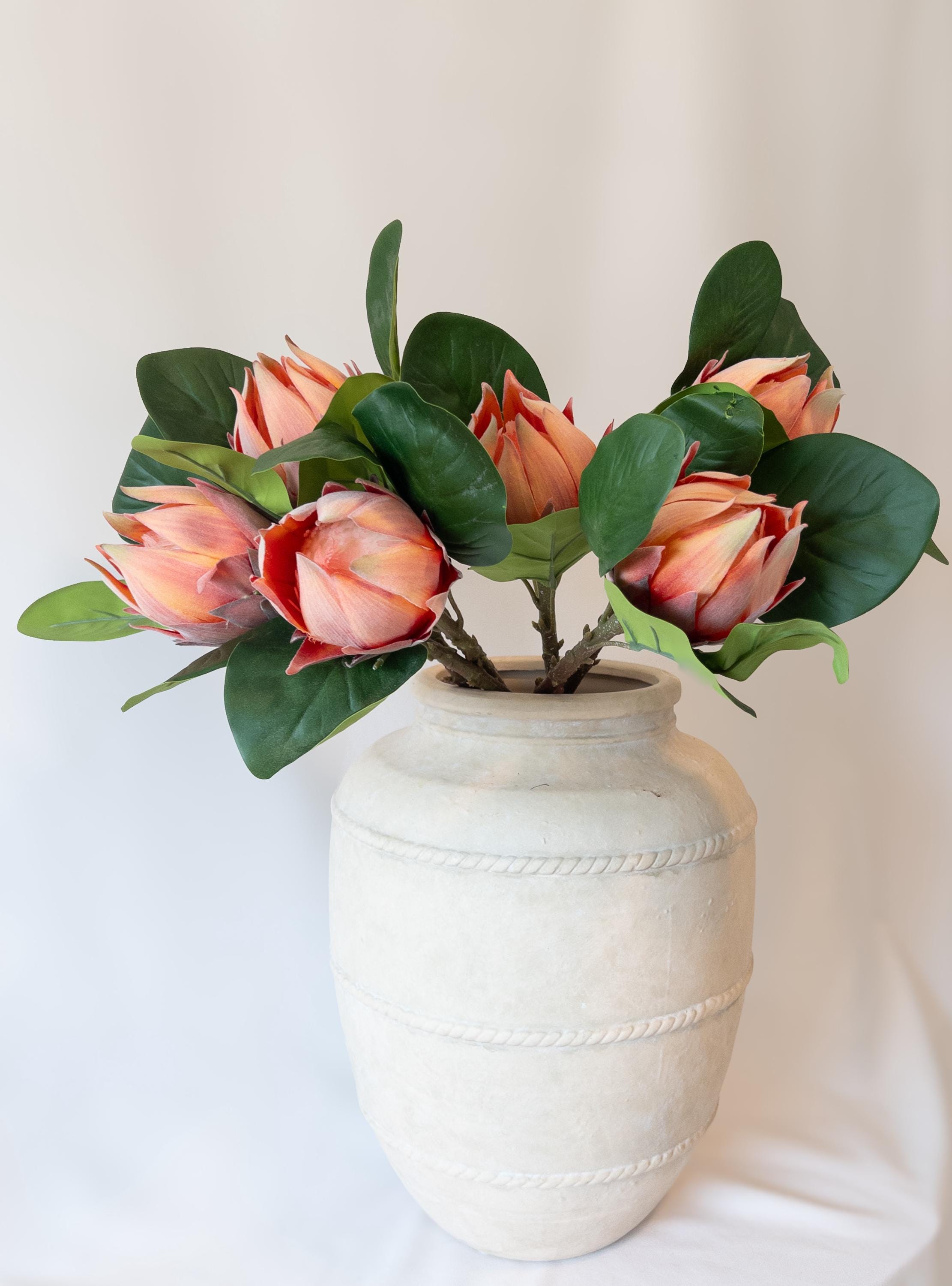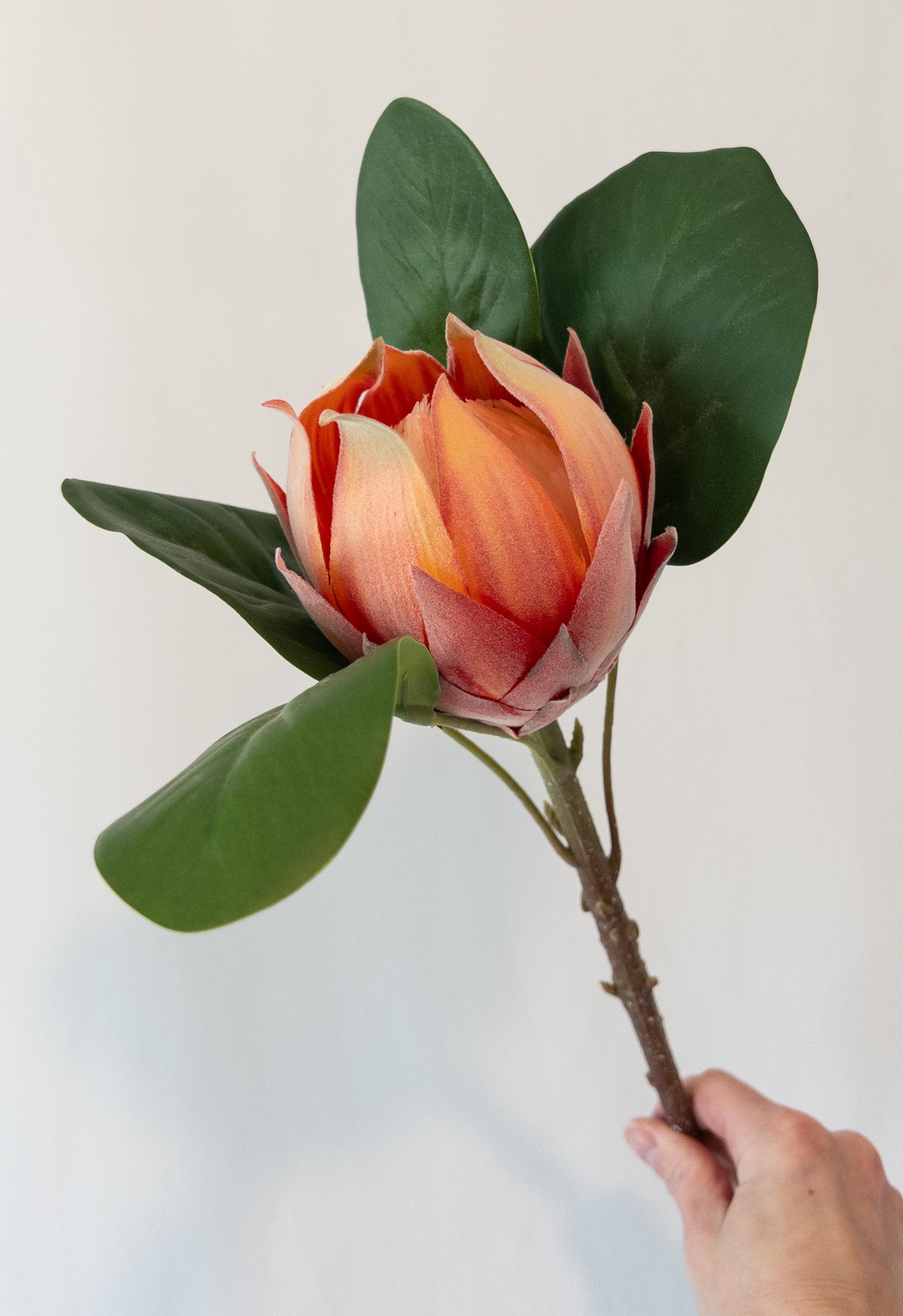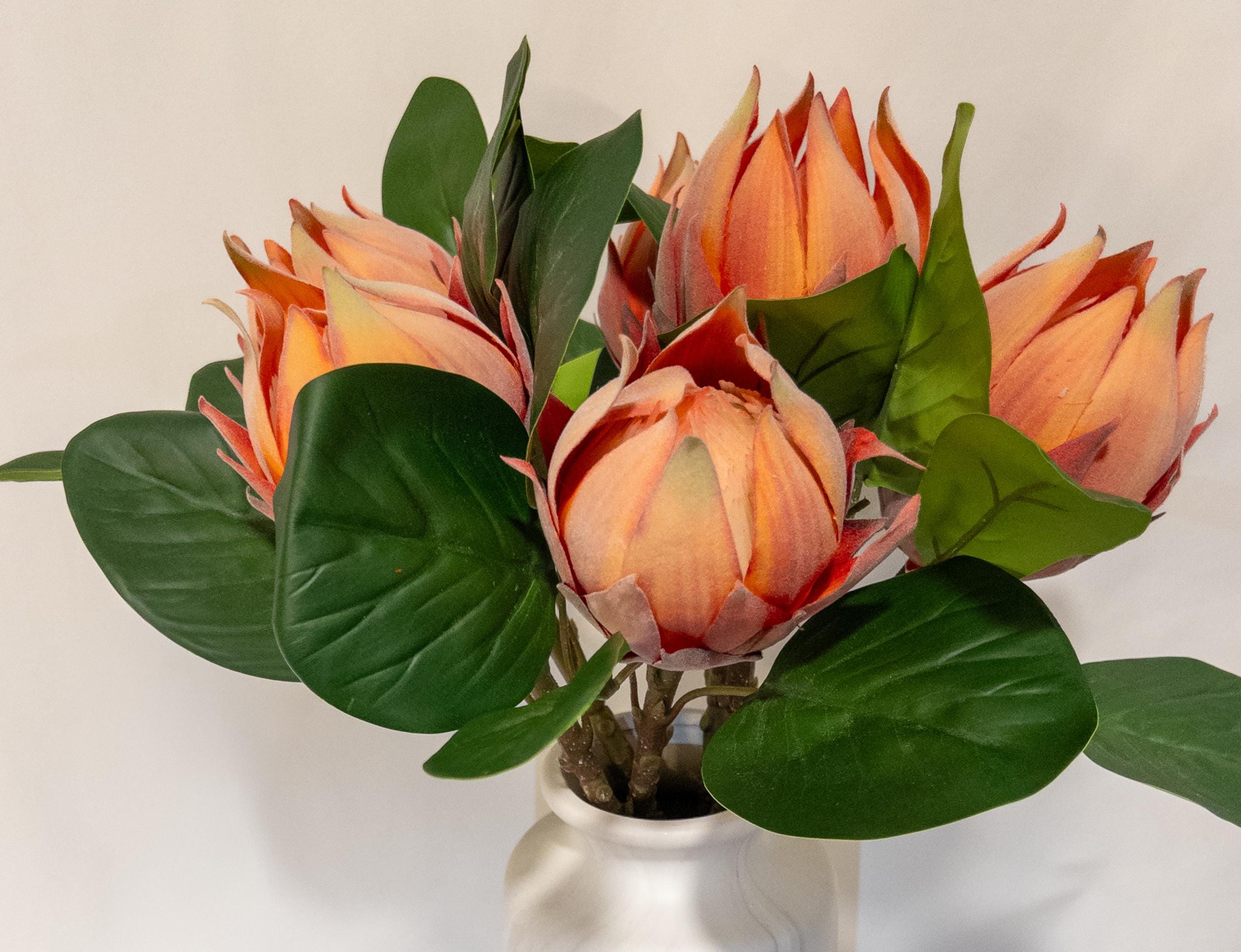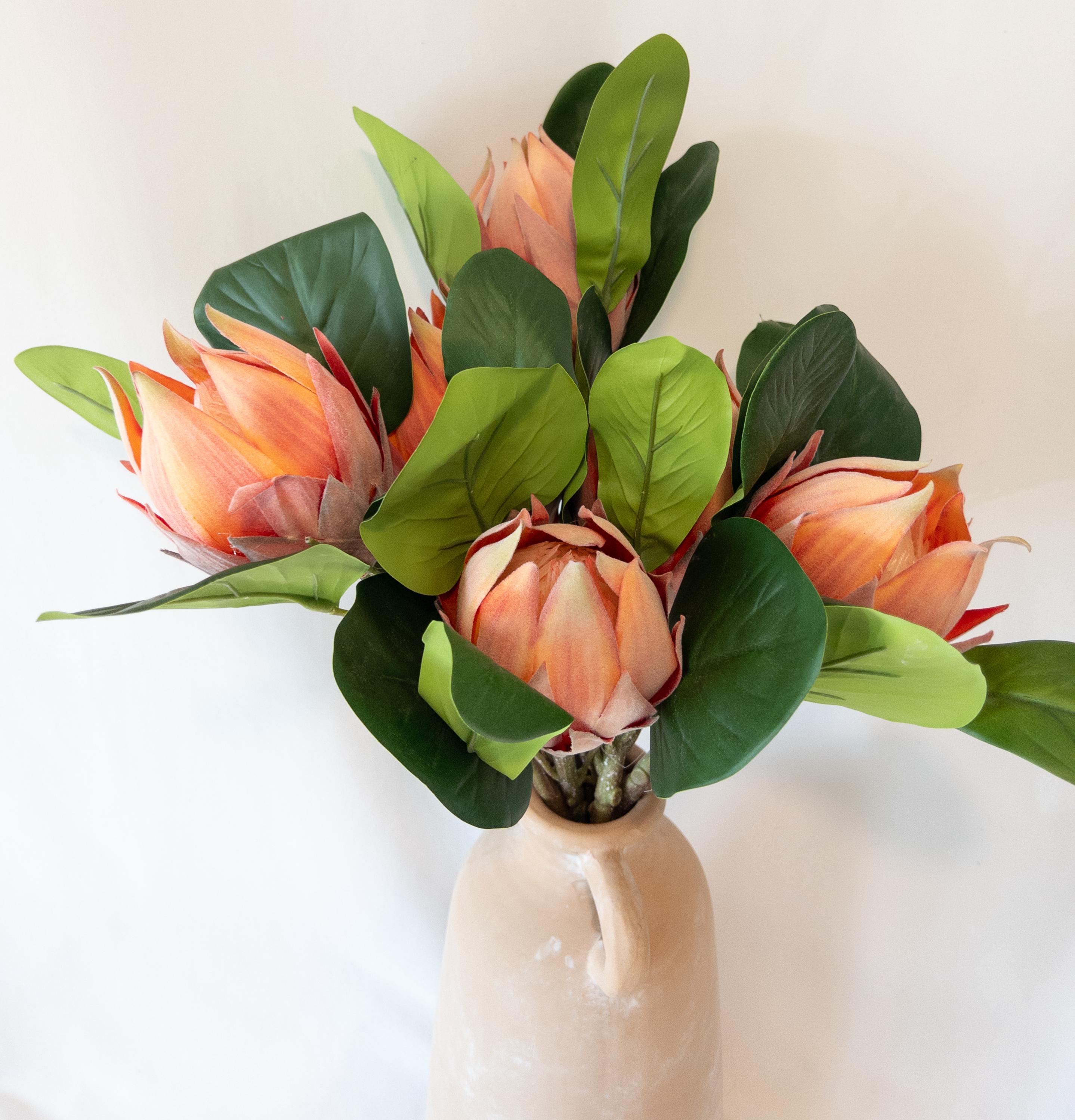 This faux protea features layered petals in warm coral, peach, and soft blush tones with subtle shading that gives it incredible depth. The petals have the same soft, velvety texture you’d expect from a real protea, adding to its realistic feel and high-end look.