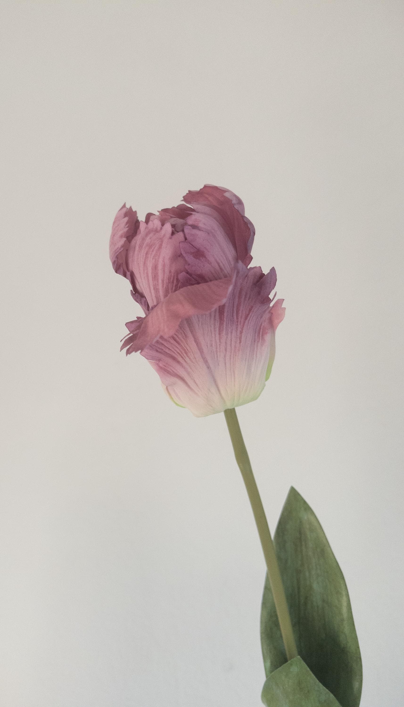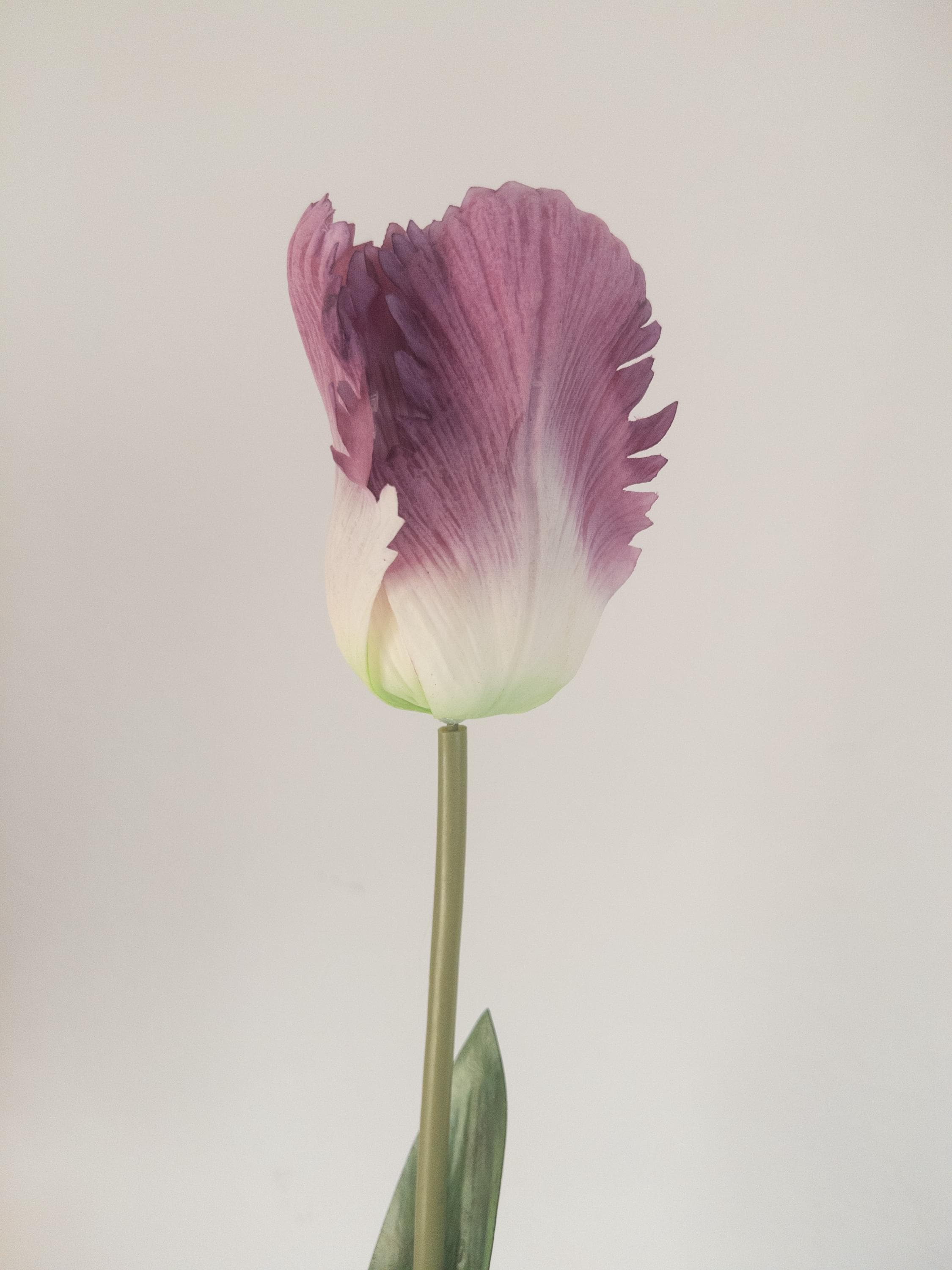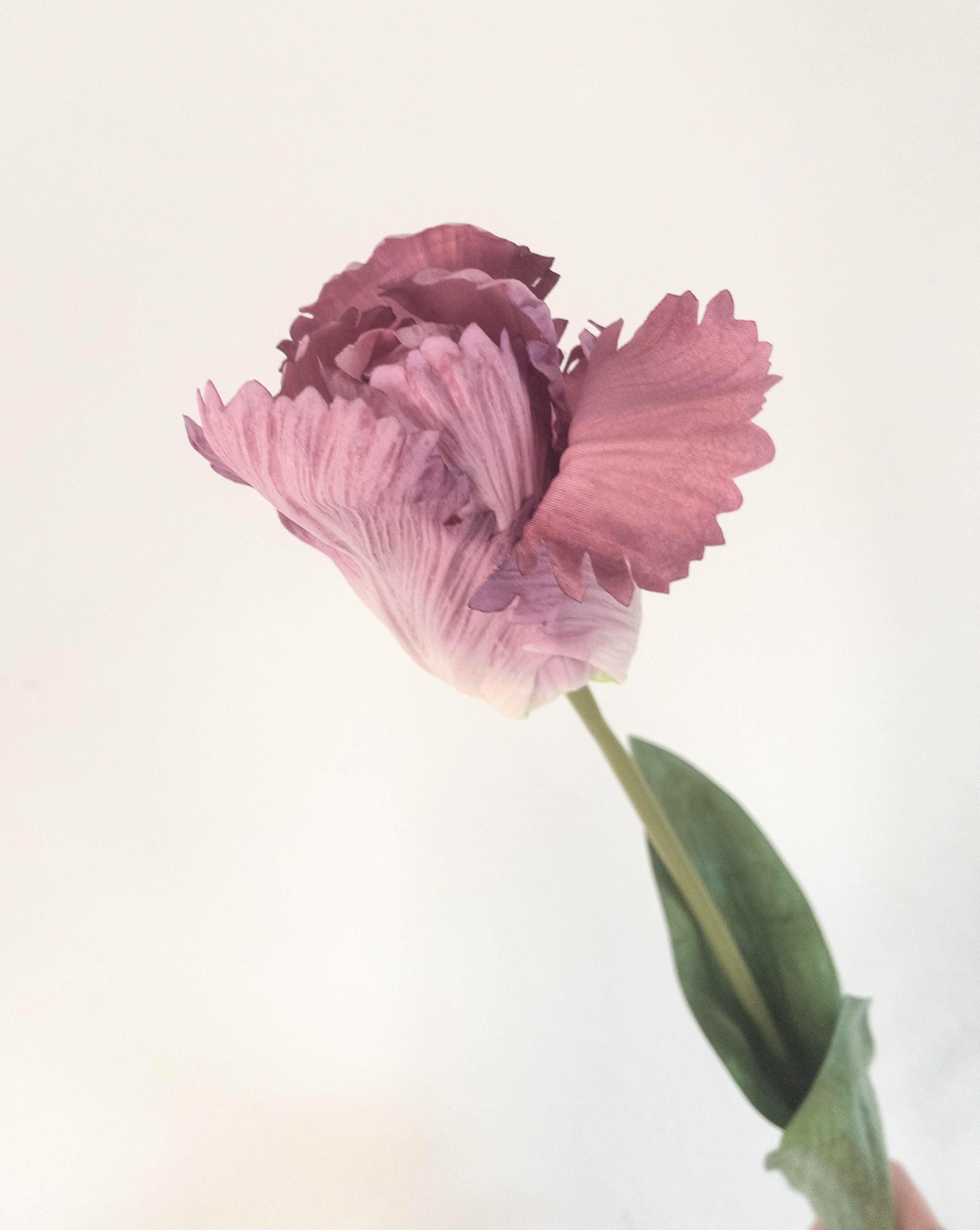 Each 28-inch stem features a softly ruffled bloom with layered, feathered petals in a dusty lavender tone that melts into a creamy green base. The parrot-style petals add movement and texture, making this stem feel artful and organic rather than uniform.