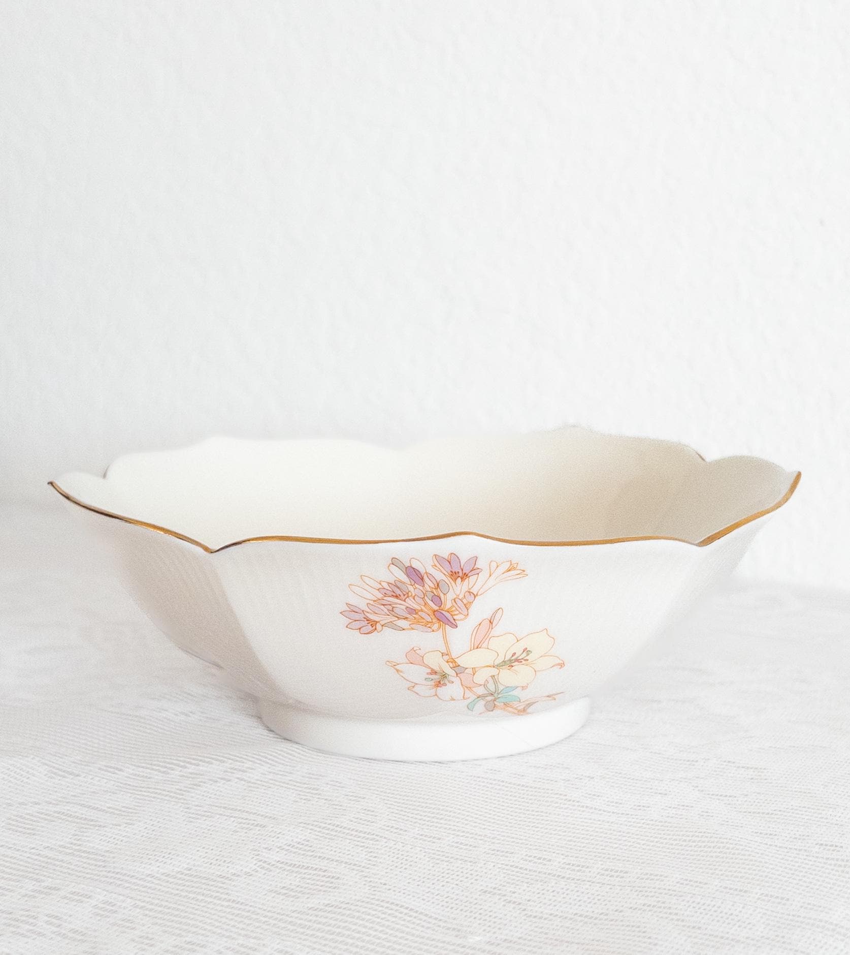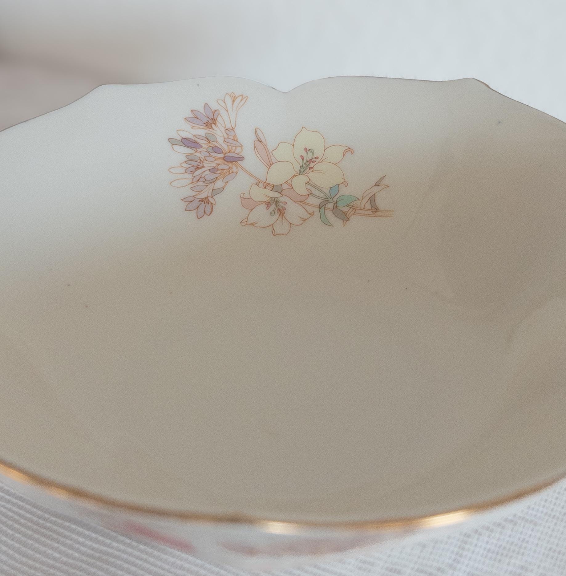 This piece has that beautiful mid-century export charm — airy, feminine, and quietly elegant. The shape resembles an open lotus blossom, with softly curved edges and fine fluted detailing along the sides. The floral motif is rendered in muted peach, blush, lavender, and soft blue tones against a warm ivory porcelain ground.