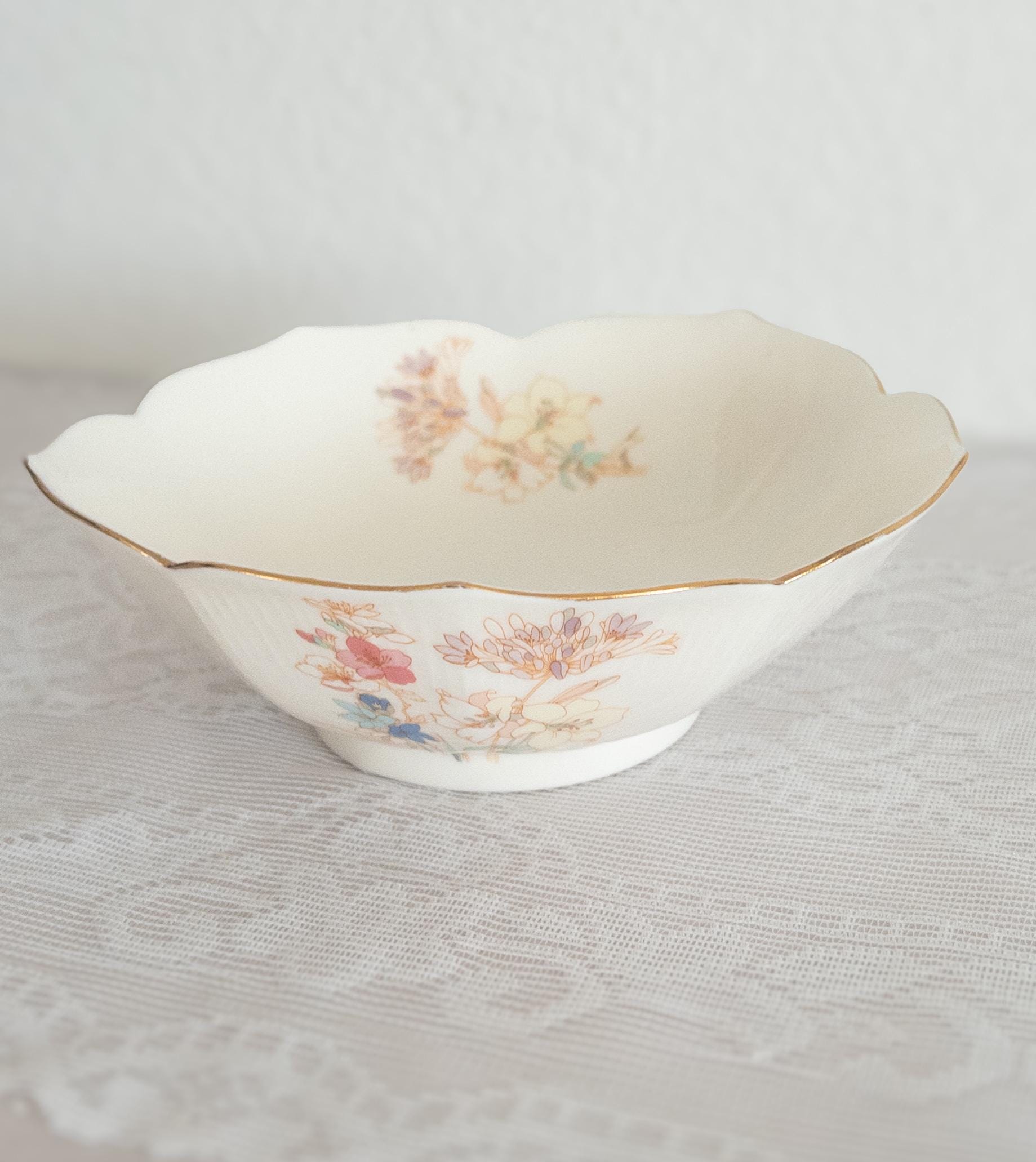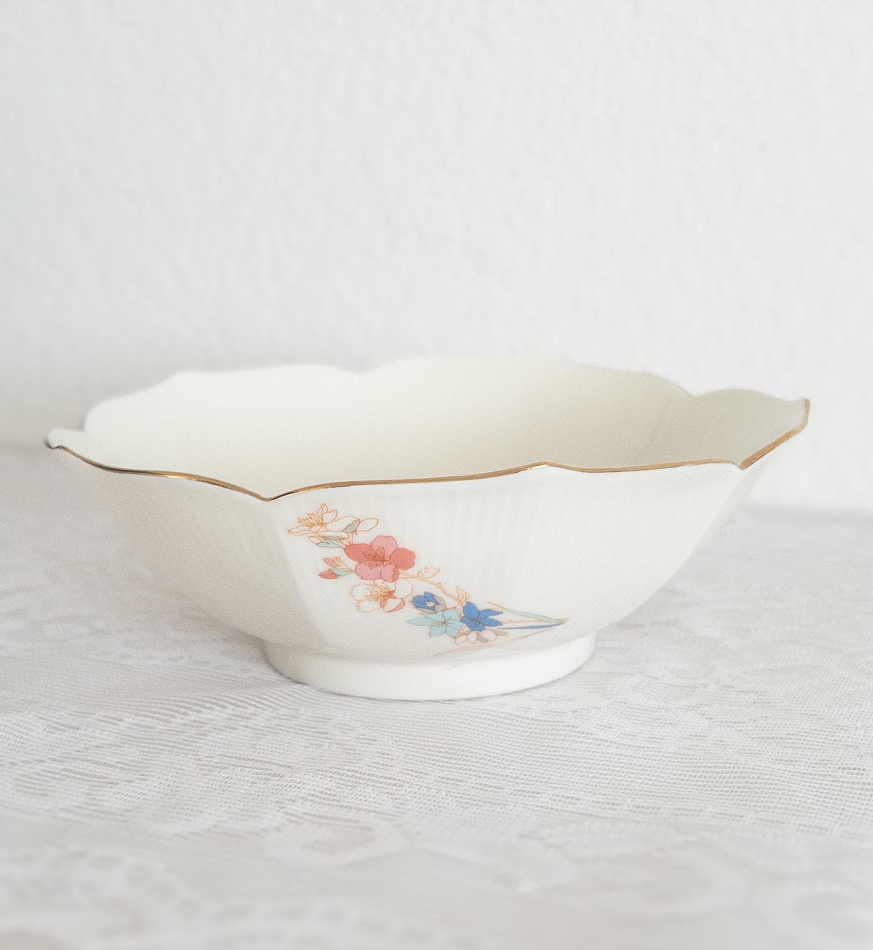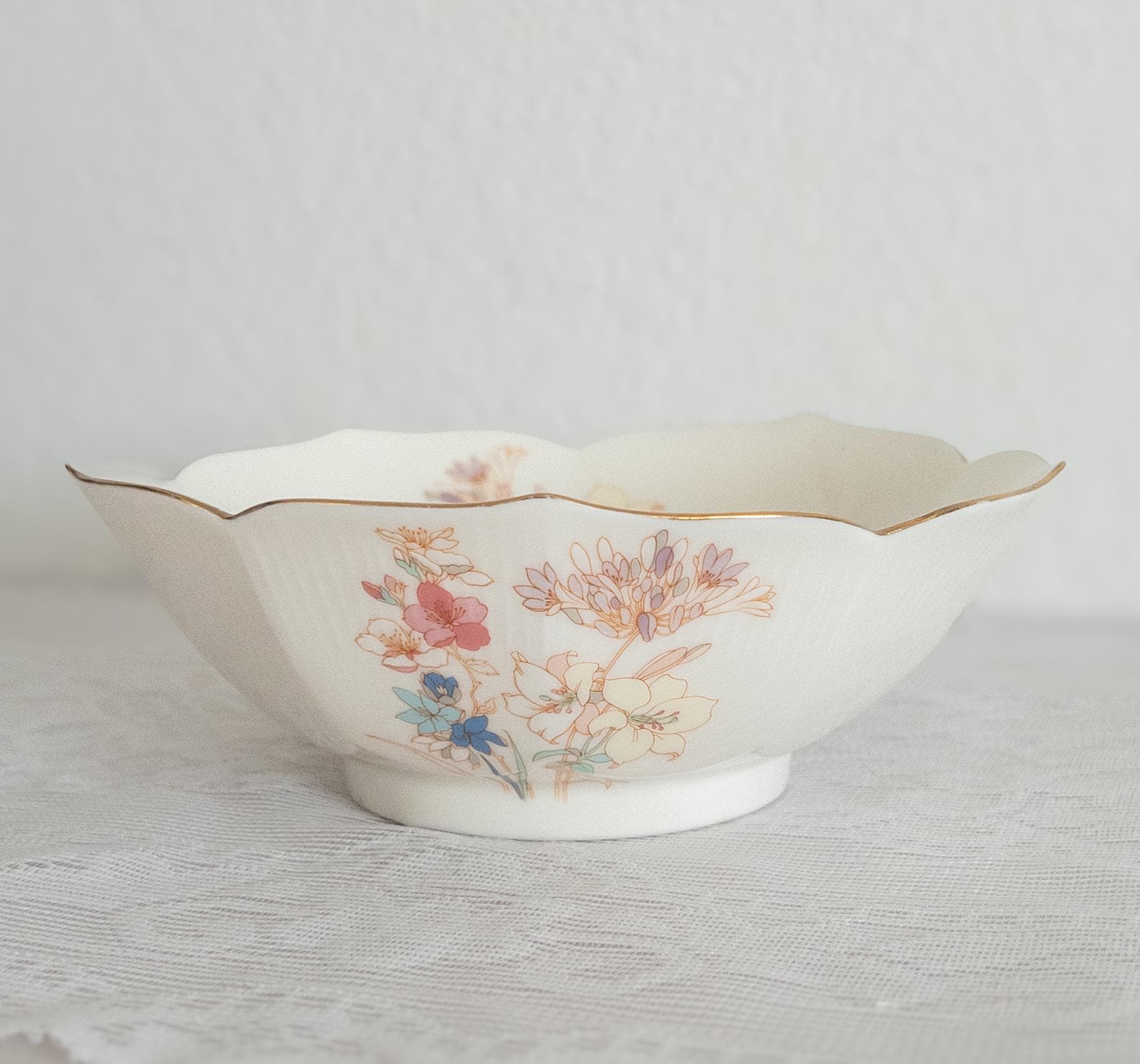 A delicate vintage Japanese porcelain lotus bowl featuring soft pastel florals and a gently scalloped, gold-gilt rim.