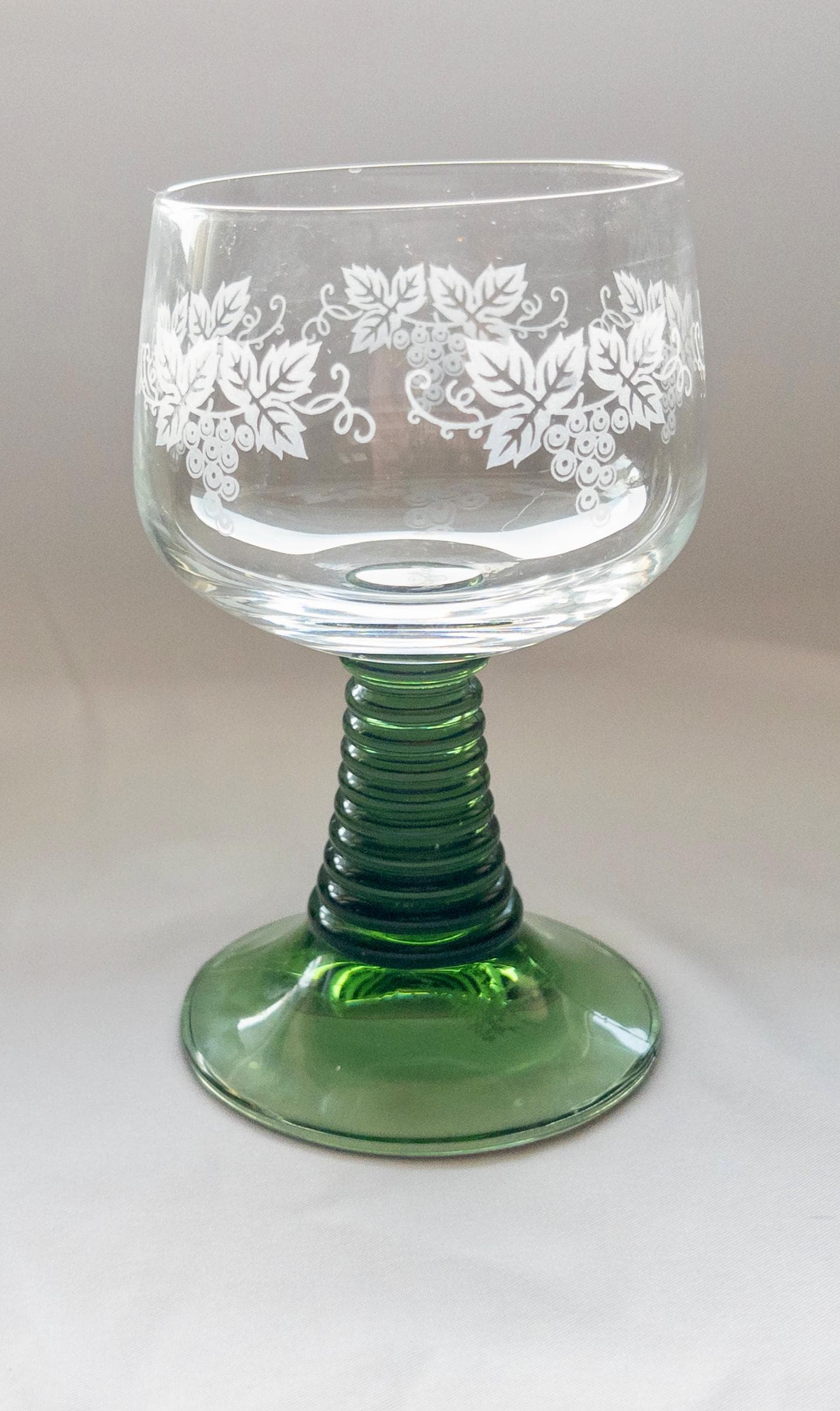 • Color: Clear bowl with white etching, green ribbed stem