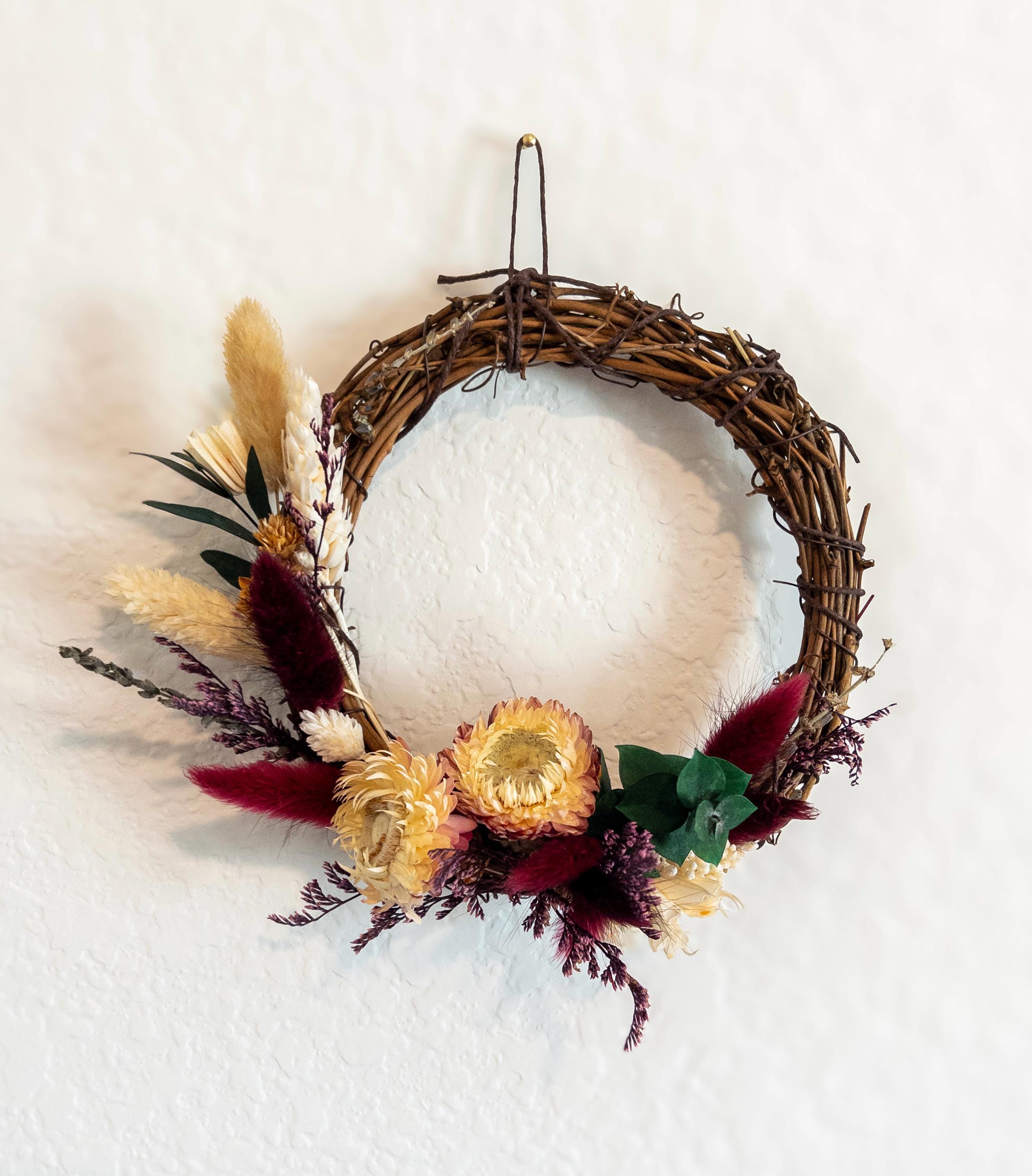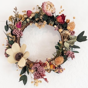 Style A – Burgundy Floral This wreath features rich burgundy accents paired with cream strawflowers and soft neutral botanicals. The deep tones create a romantic, vintage-inspired look perfect for cozy cottage or boho decor.