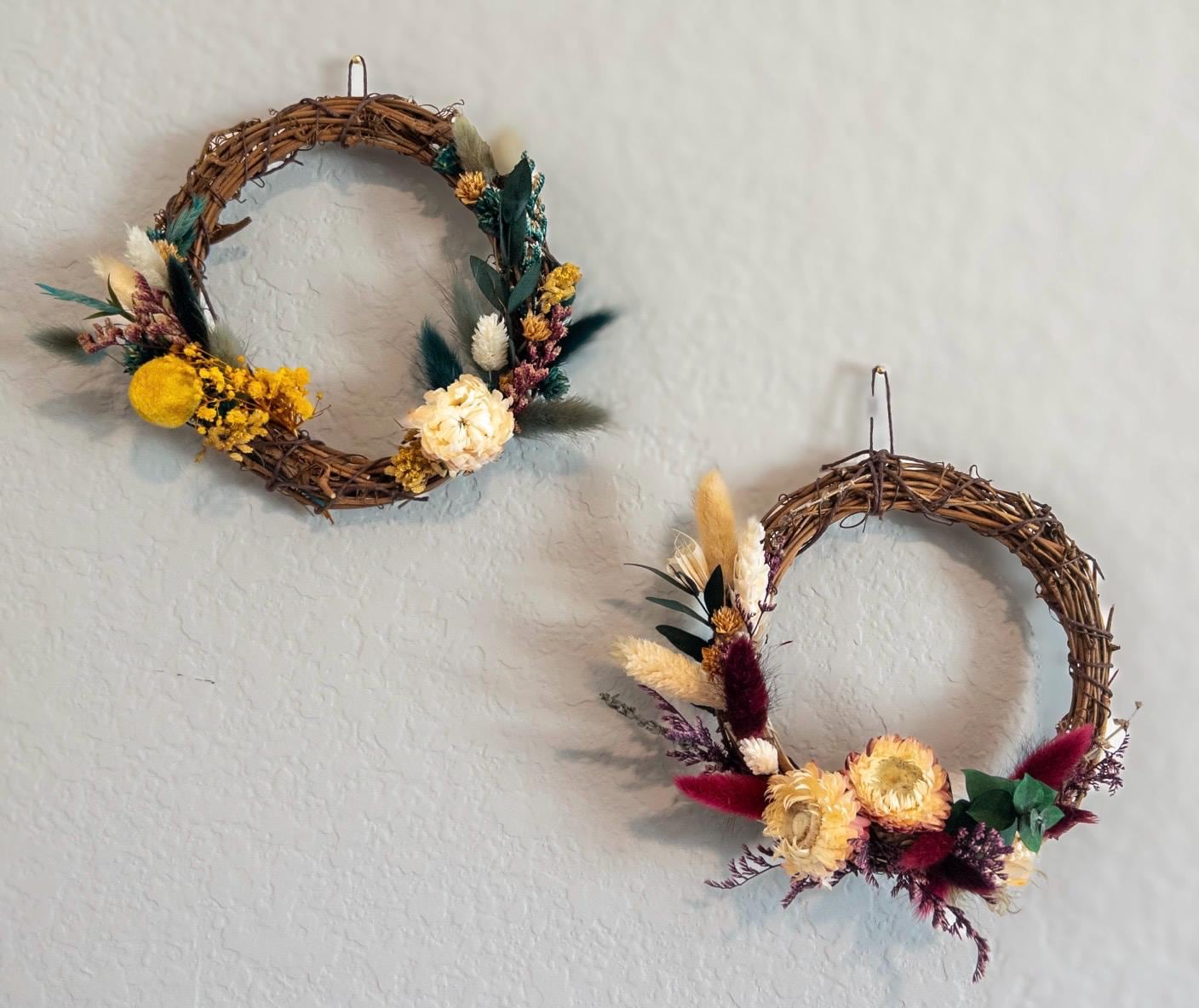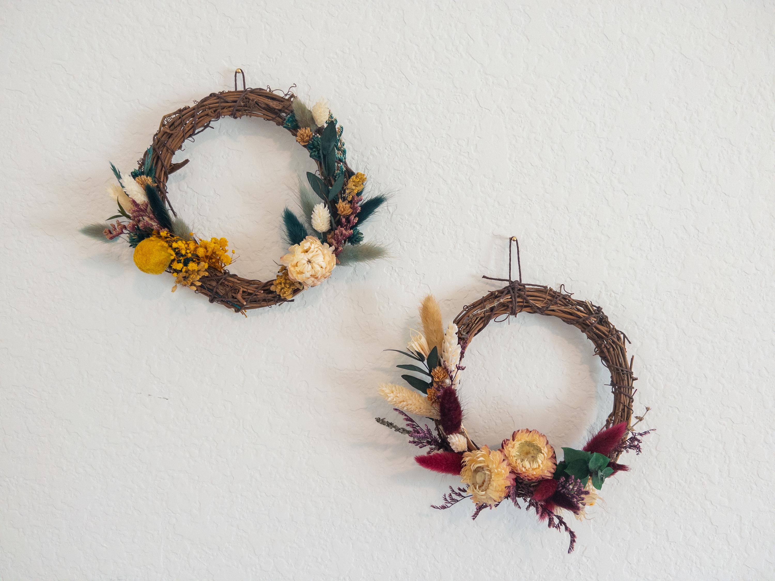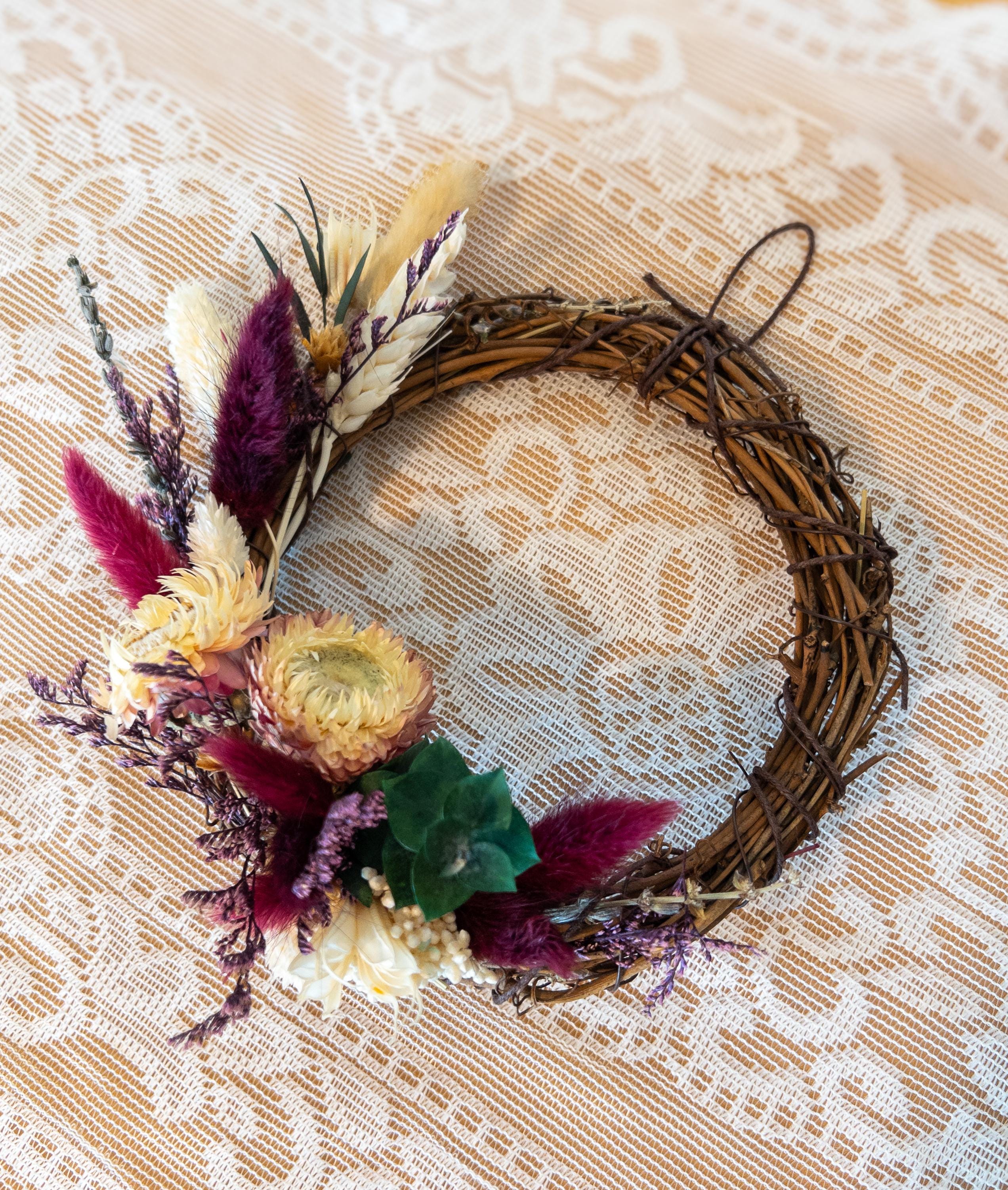 These small wreaths make a lovely accent for gallery walls, shelves, entryways, or seasonal decorating. Their delicate dried florals and natural textures add warmth and charm to any space.