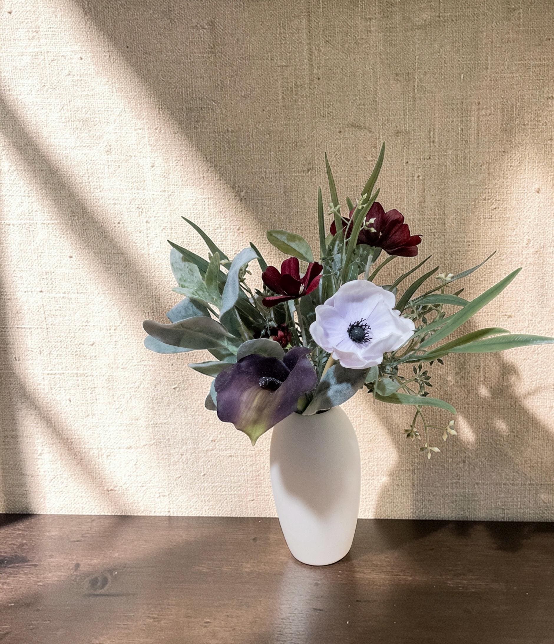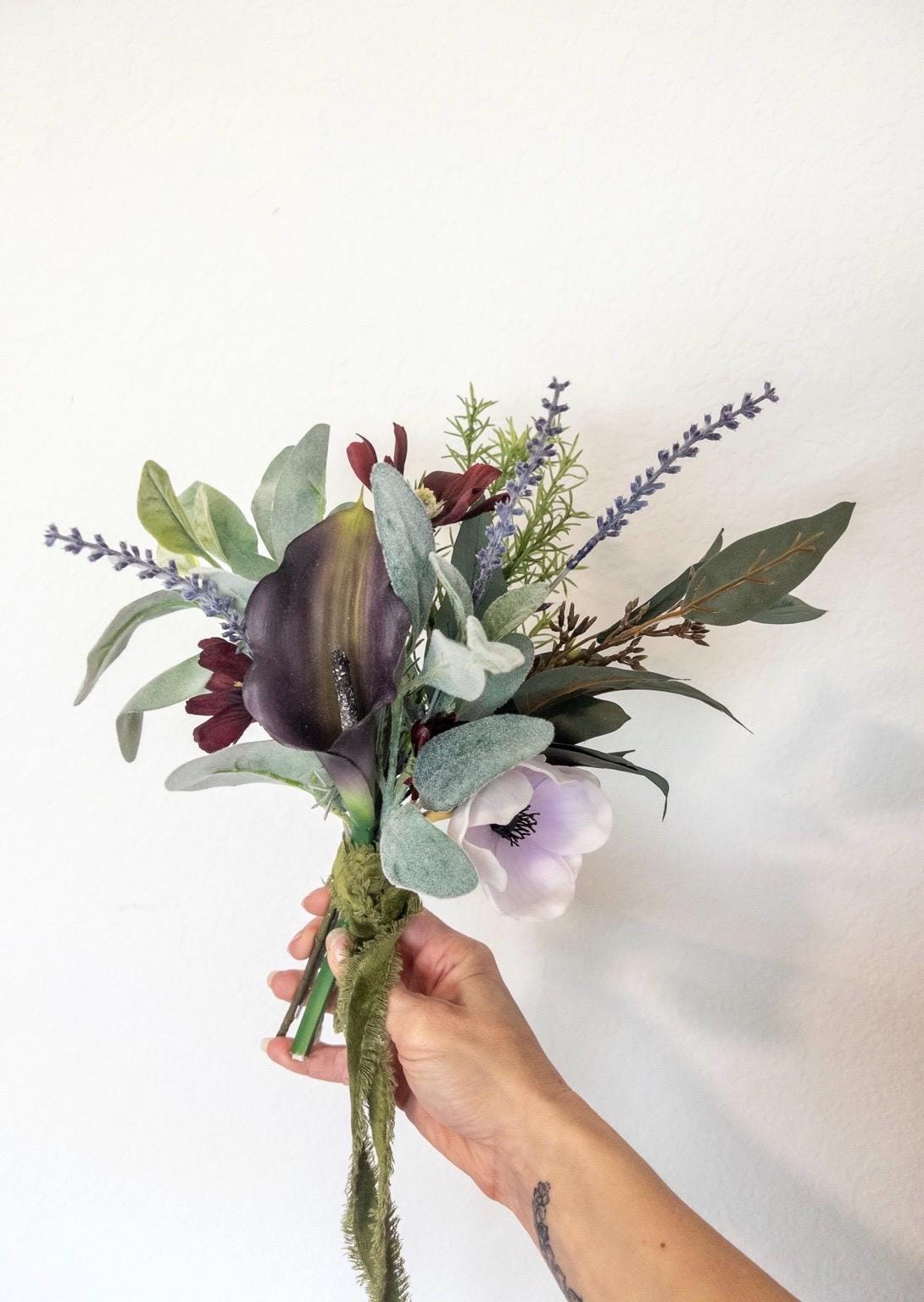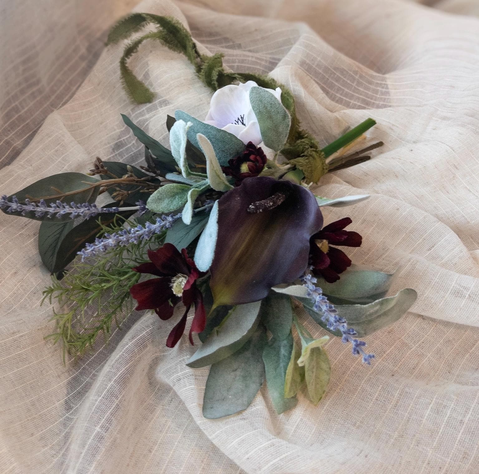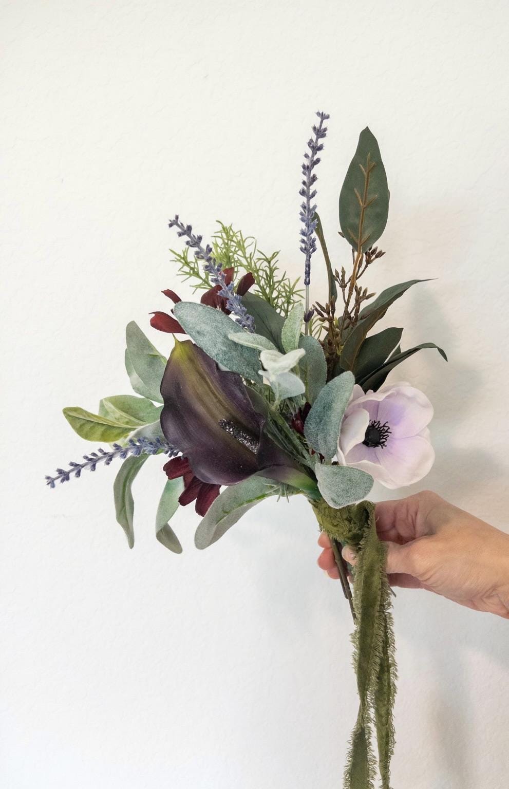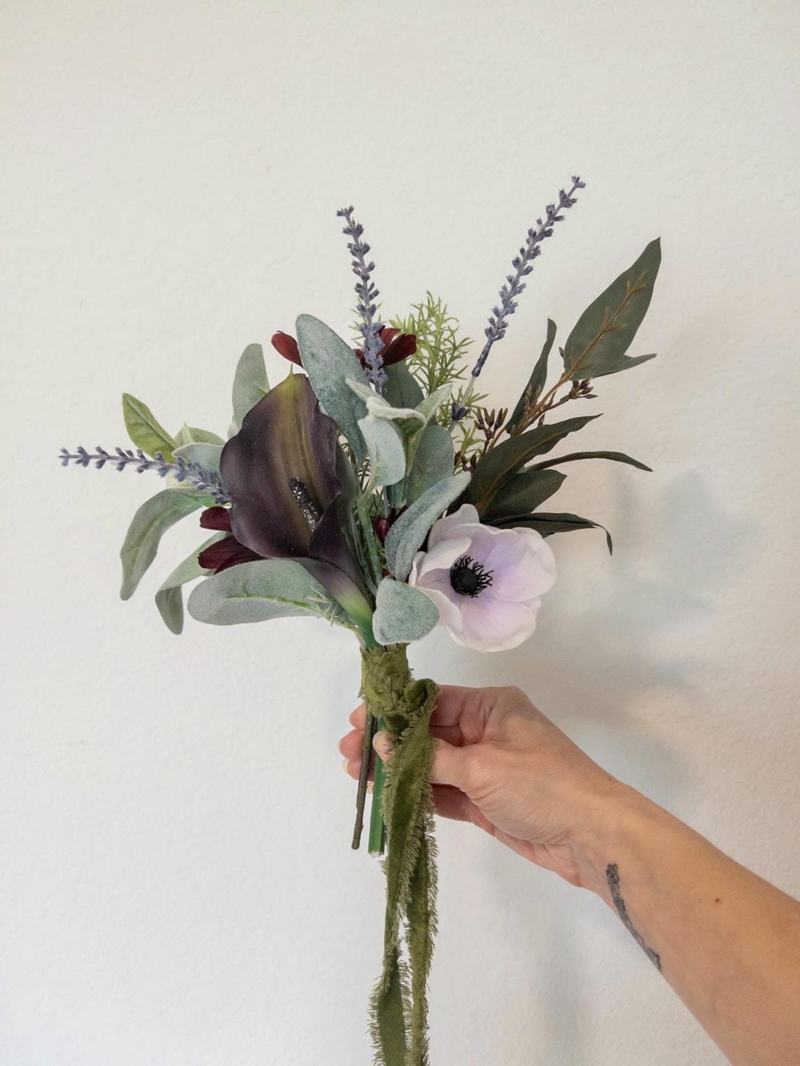 Inspired by soft countryside mornings and quiet refinement, this romantic bouquet features a plum calla lily, soft lavender anemone, and layered greenery. Airy yet dimensional, Colette carries depth through subtle burgundy accents — grounding the palette without overpowering its softness. Designed in a moody mauve color palette, this hand-tied bouquet brings depth, texture, and timeless elegance to shelves, tables, and small vases.