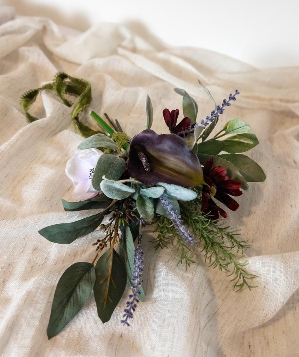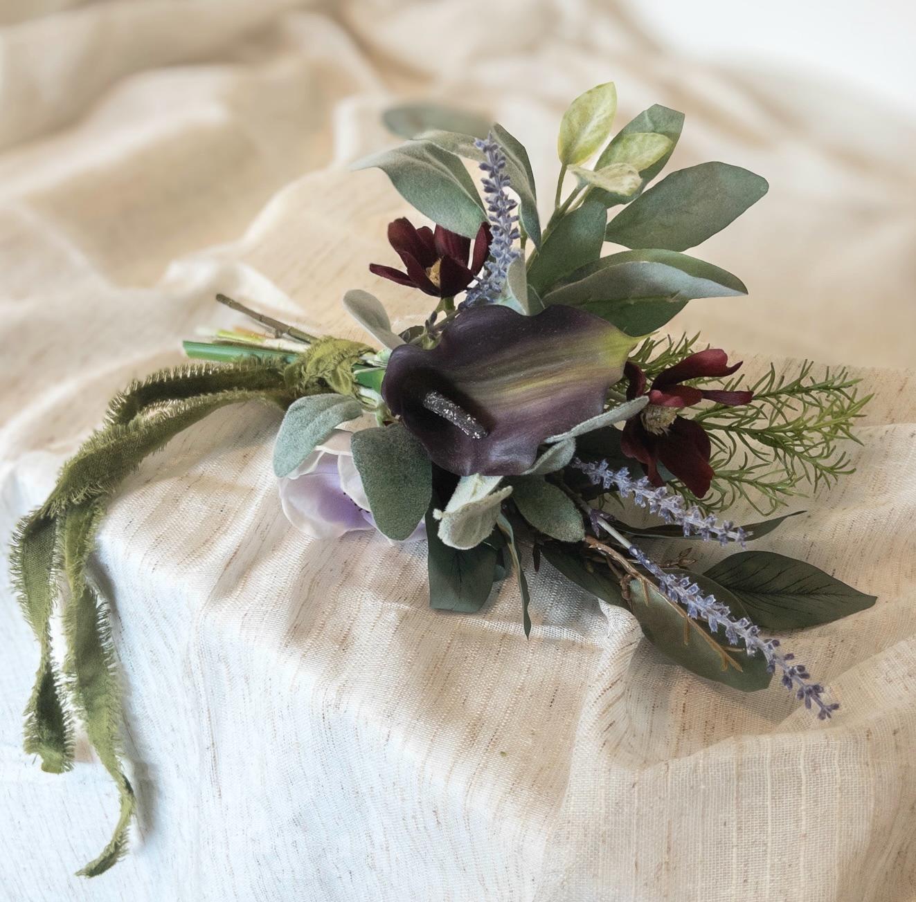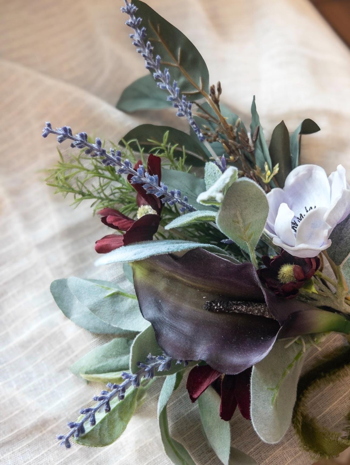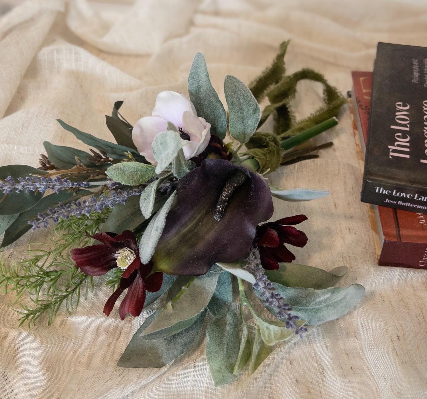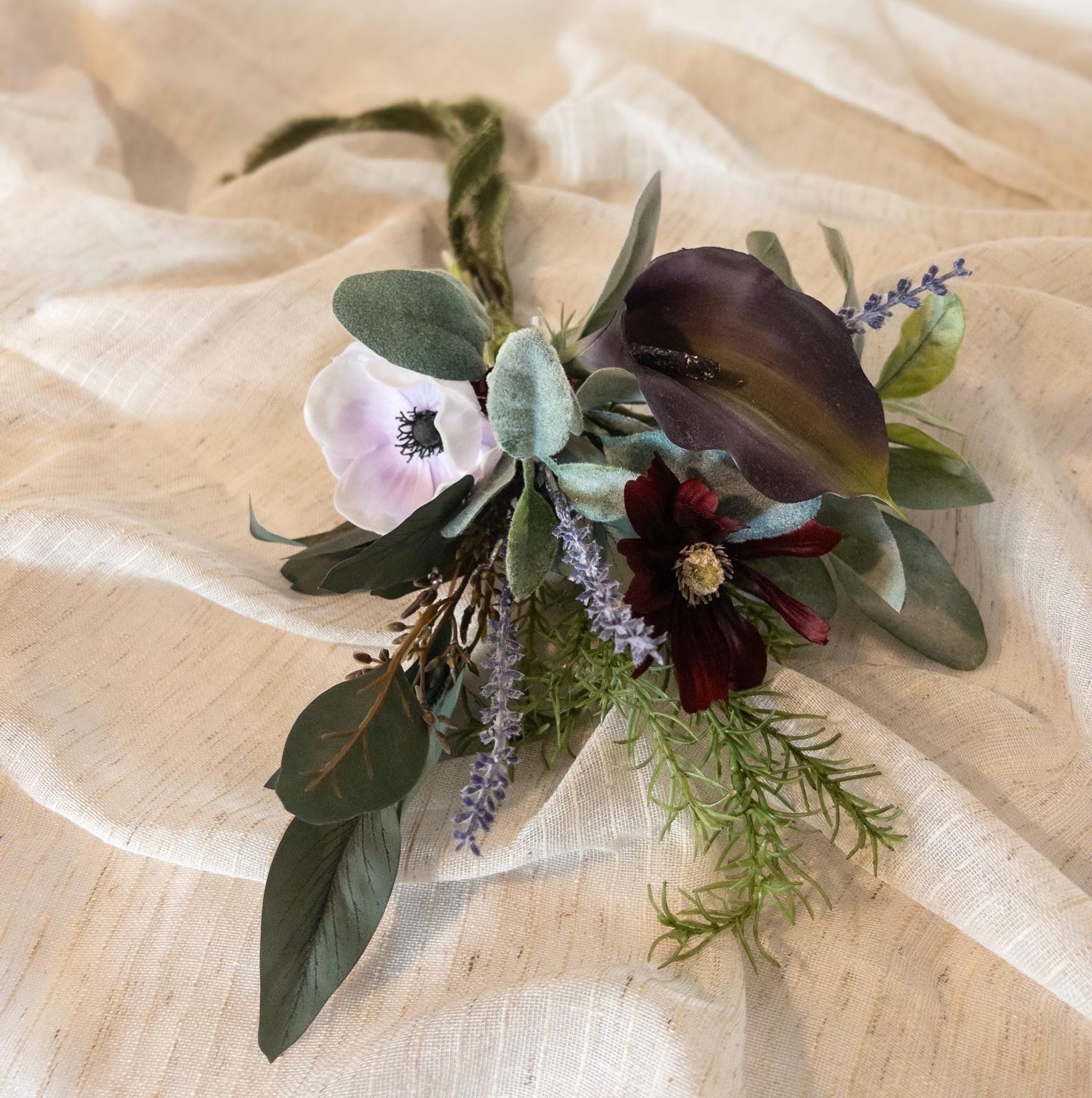 Inspired by soft countryside mornings and quiet refinement, this romantic bouquet features a plum calla lily, soft lavender anemone, and layered greenery. Airy yet dimensional, Colette carries depth through subtle burgundy accents — grounding the palette without overpowering its softness. Designed in a moody mauve color palette, this hand-tied bouquet brings depth, texture, and timeless elegance to shelves, tables, and small vases.