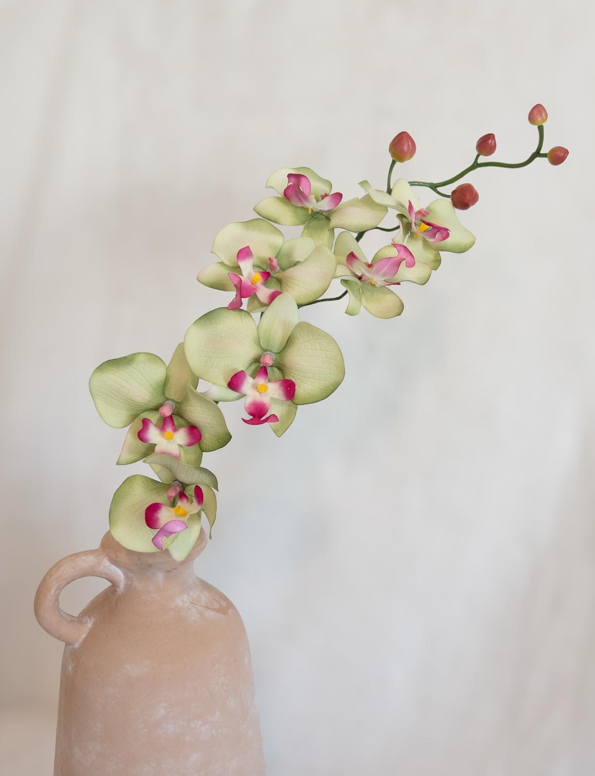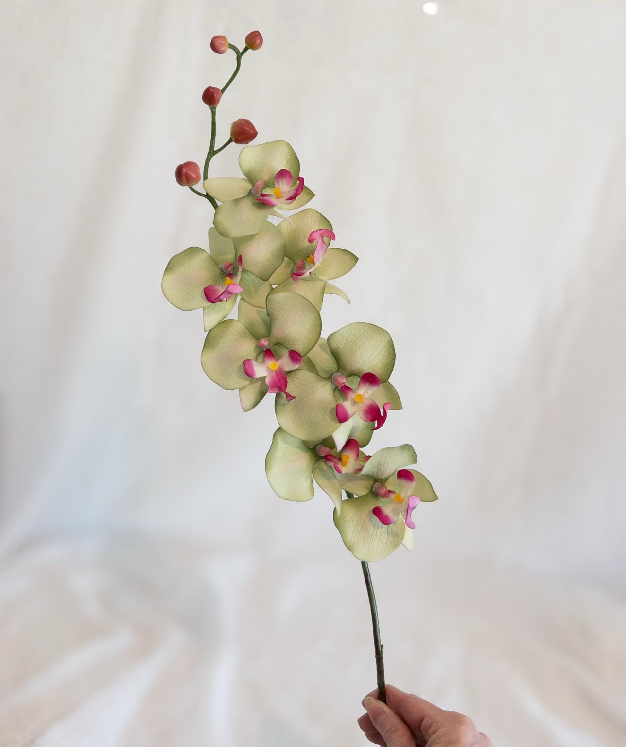 Bring a touch of tropical elegance to your floral arrangements with this 25-inch artificial orchid stem, featuring soft sage green orchid blooms with vibrant raspberry pink centers and delicate bud accents.