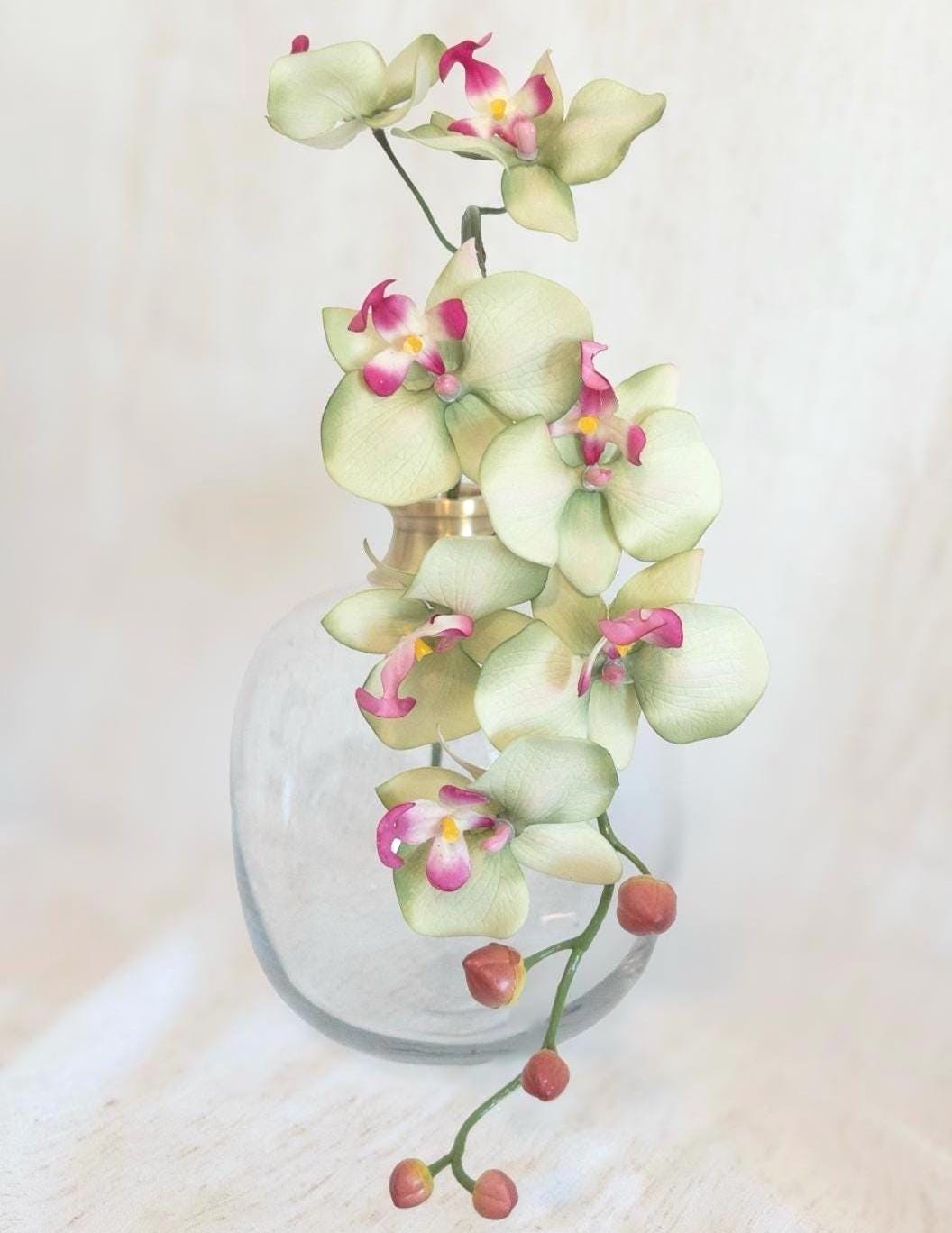 Bring a touch of tropical elegance to your floral arrangements with this 25-inch artificial orchid stem, featuring soft sage green orchid blooms with vibrant raspberry pink centers and delicate bud accents.