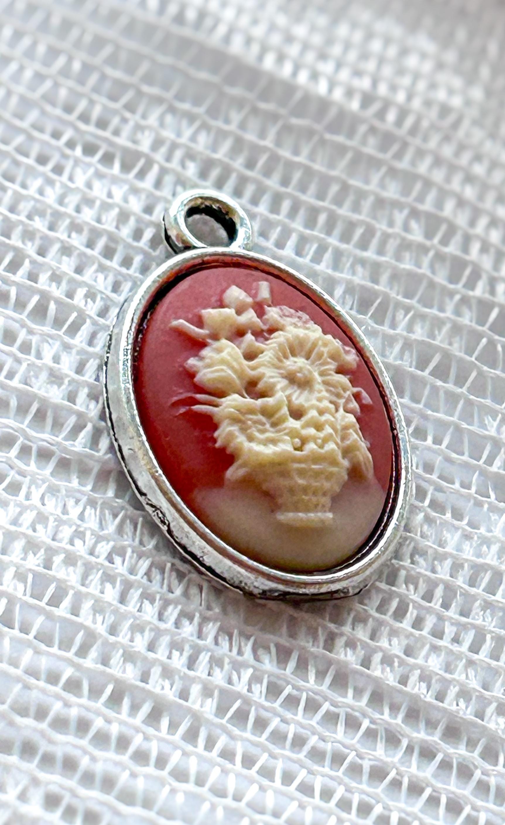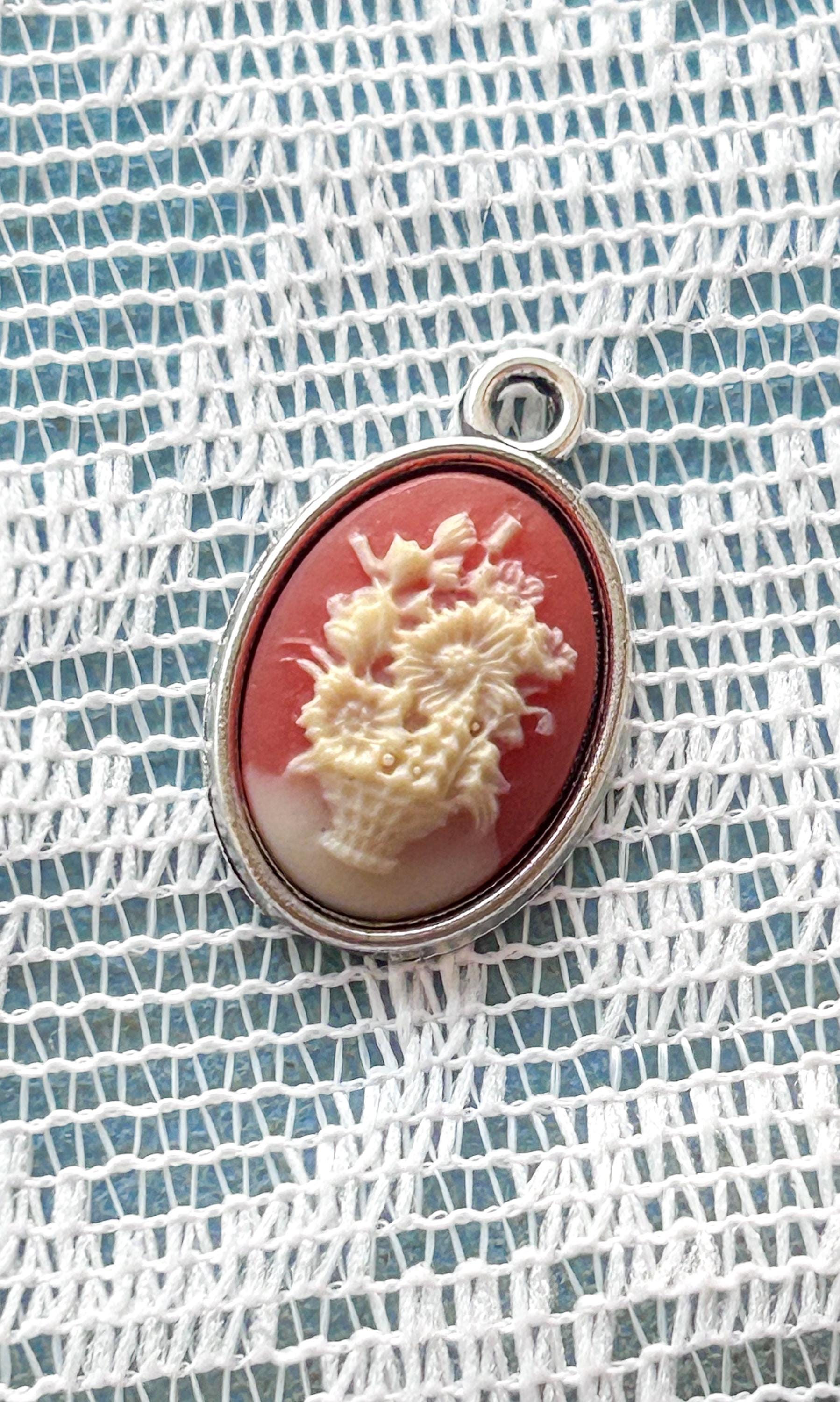 A charming vintage floral cameo pendant featuring a delicate basket of blooming flowers carved in ivory tones against a warm coral background.