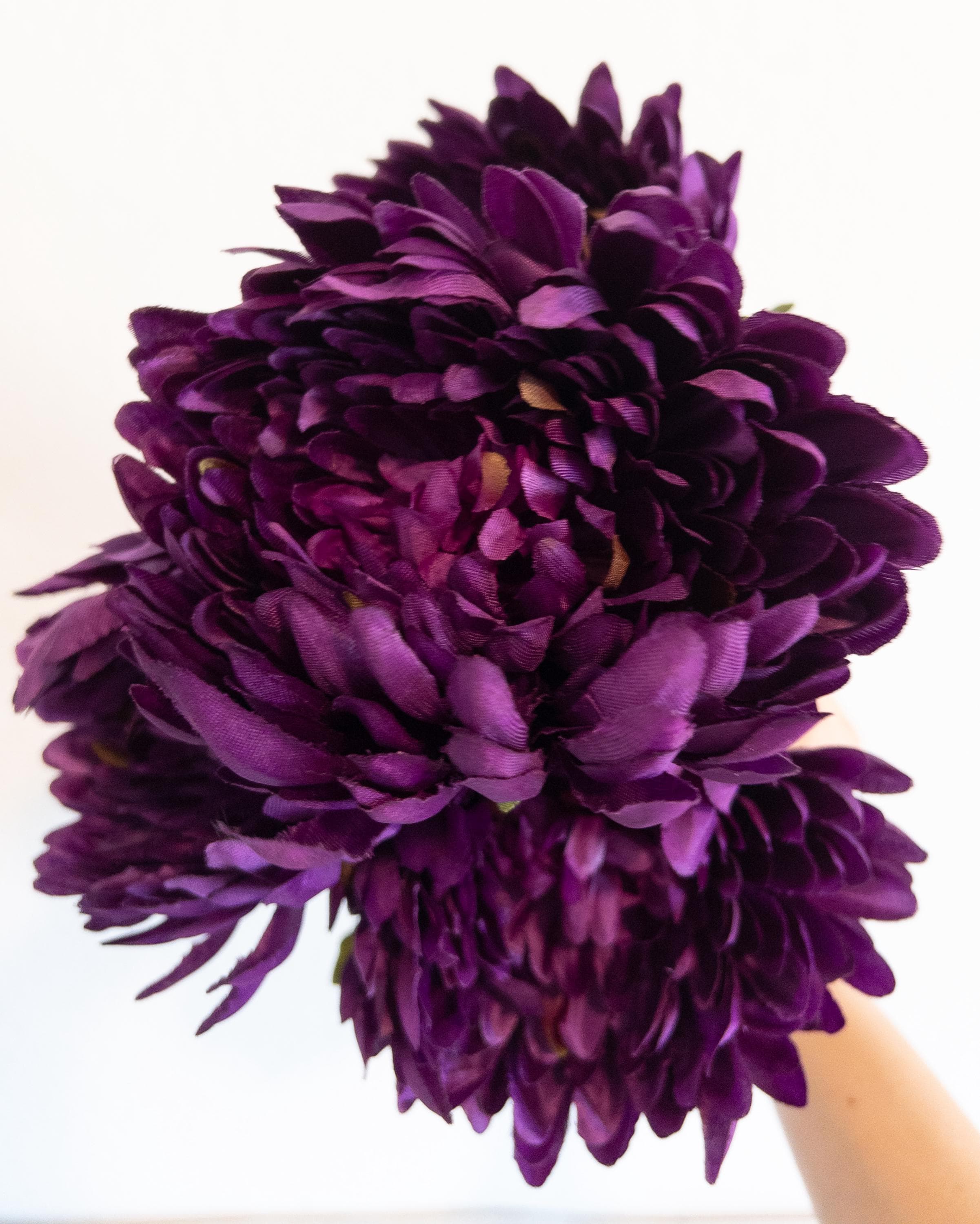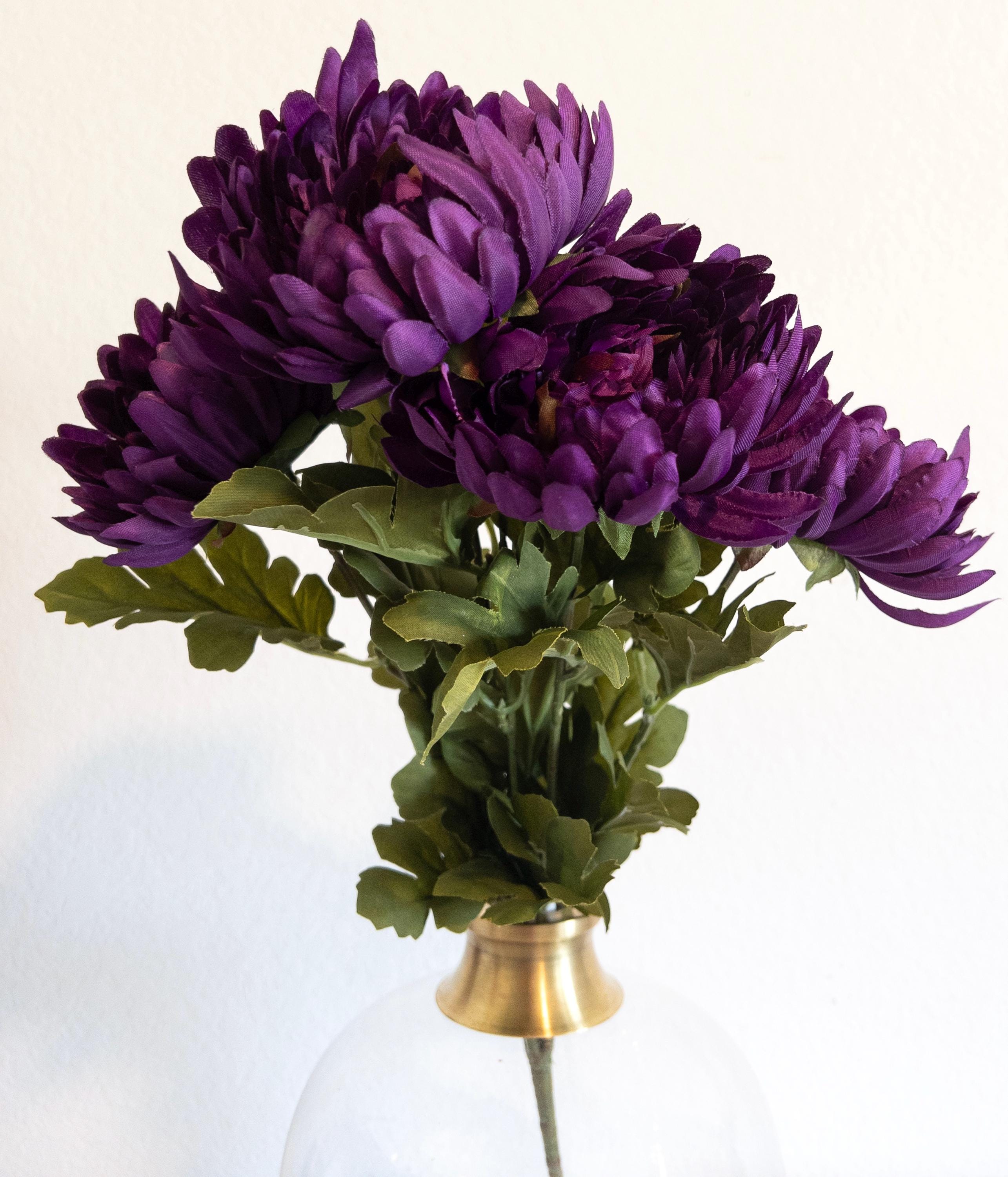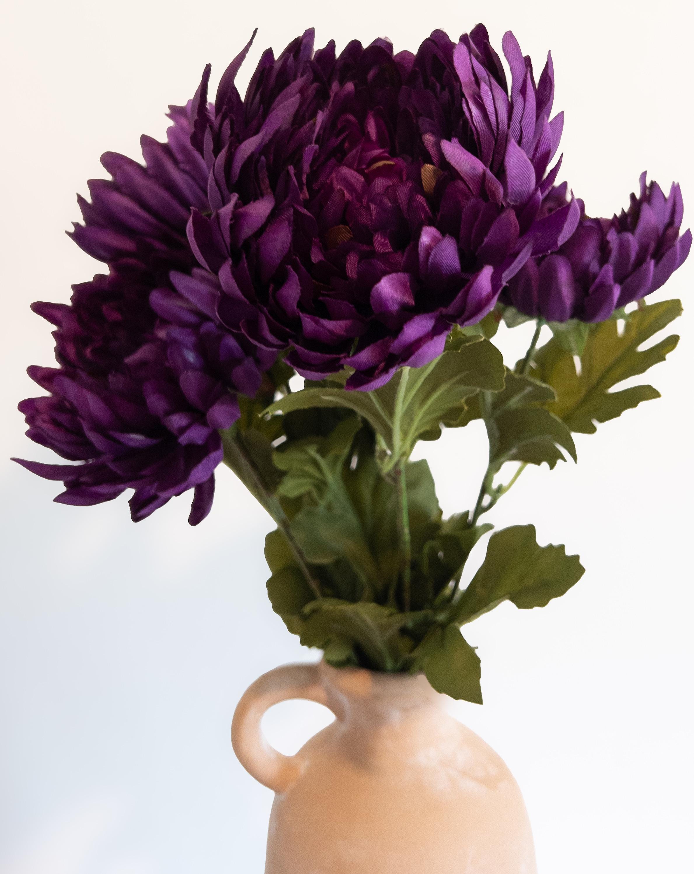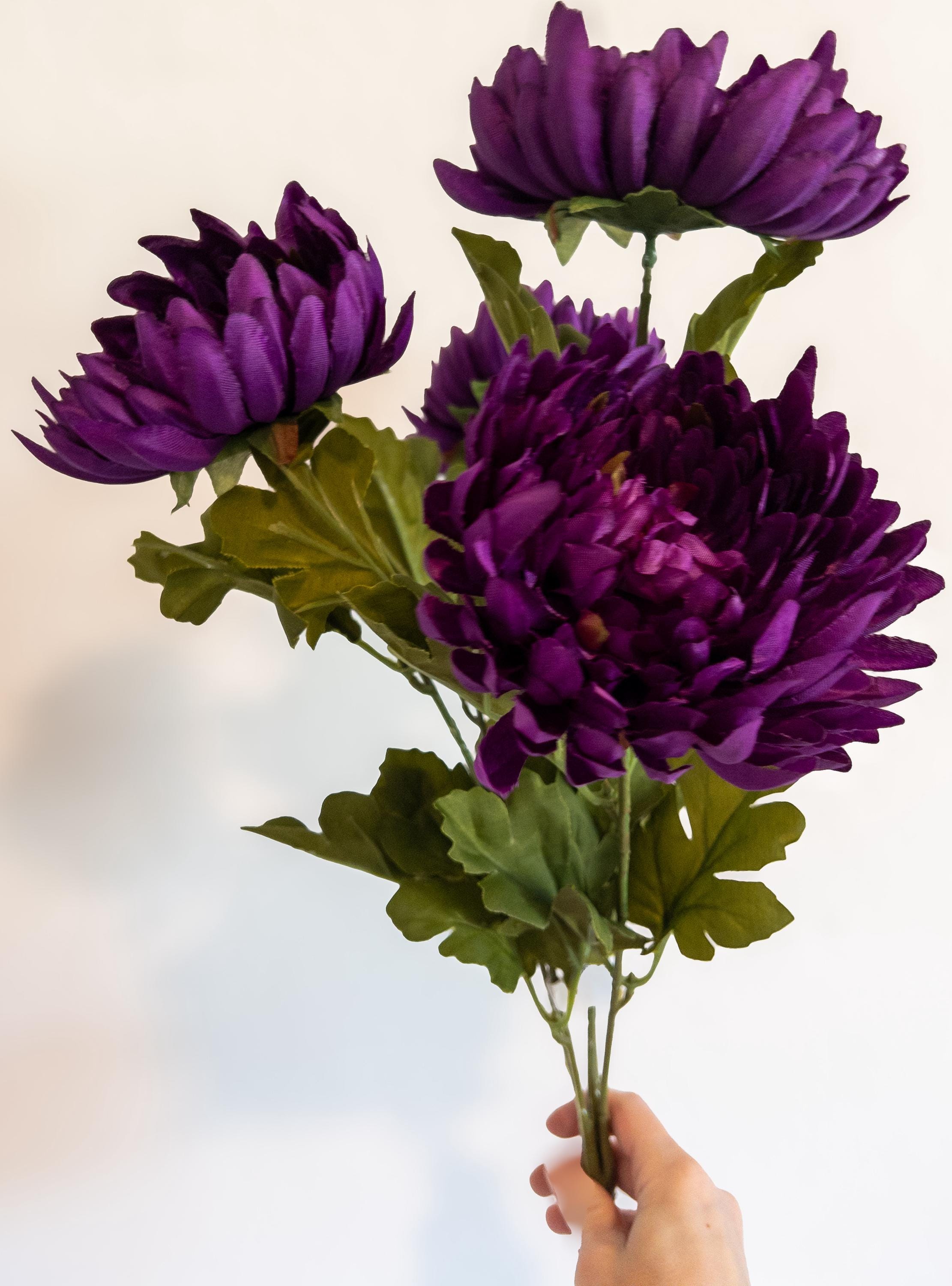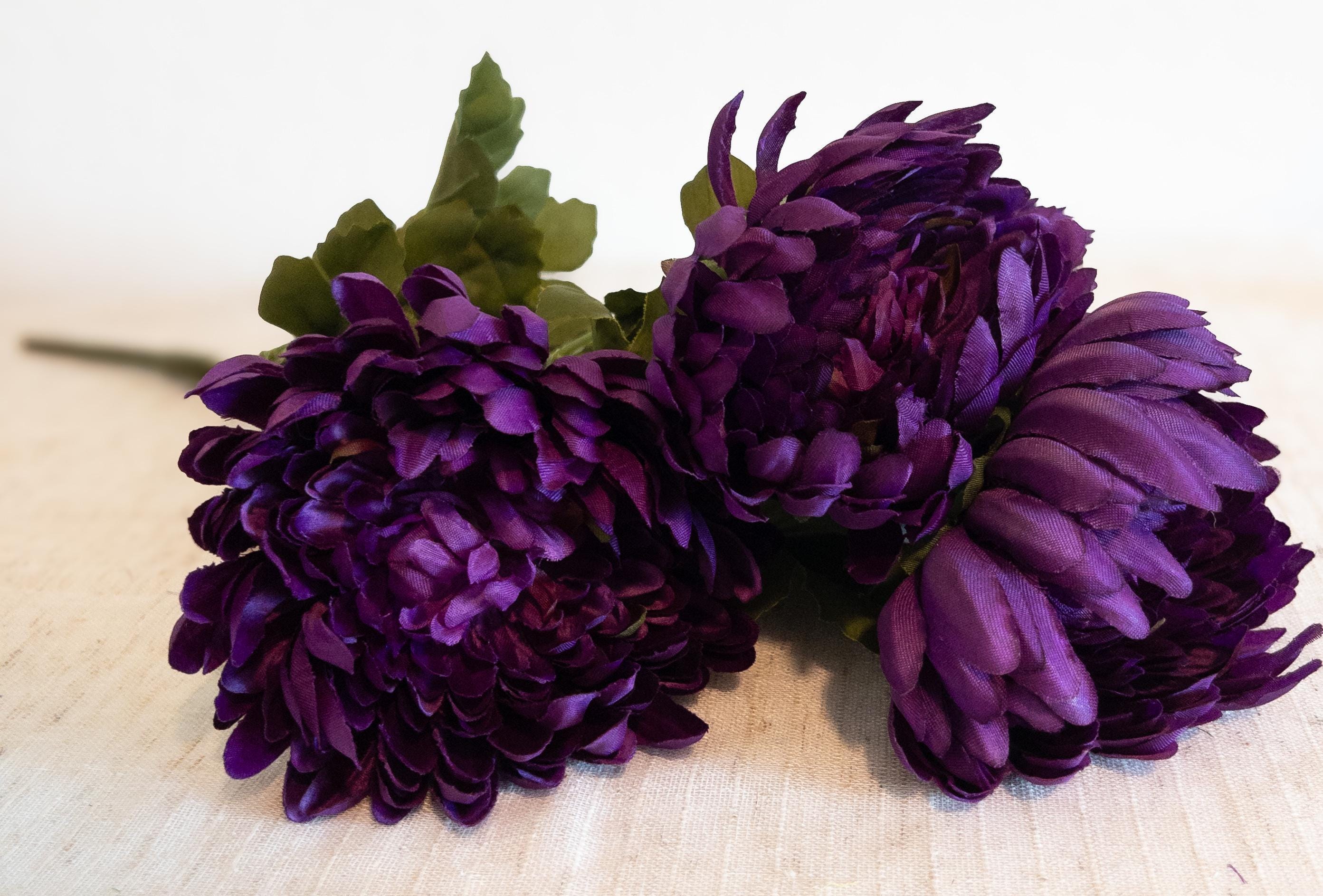 Featuring 4 full, lush blooms with layered petals in deep violet and wine-kissed hues, this stem adds instant drama to fall arrangements, weddings, or everyday styling.