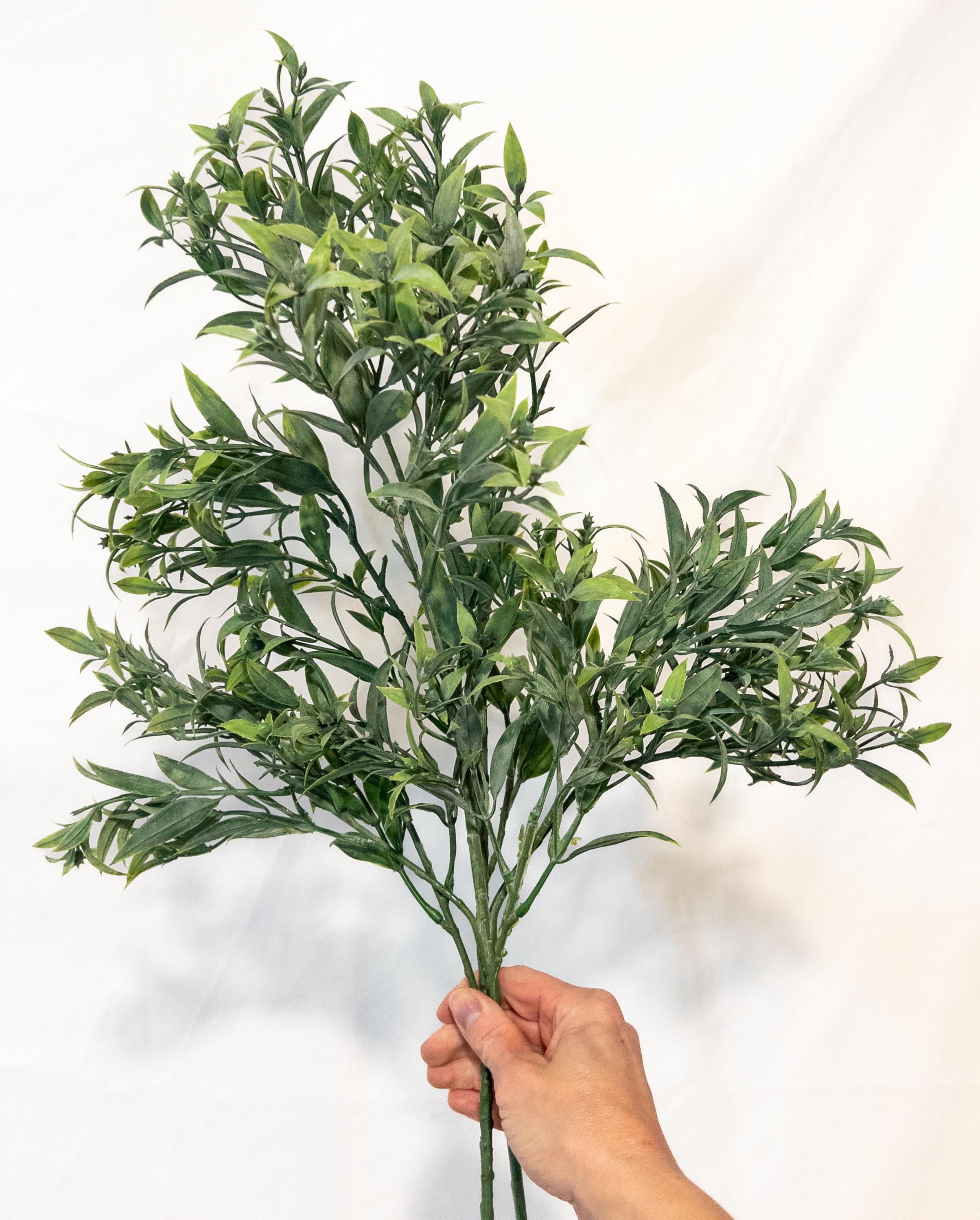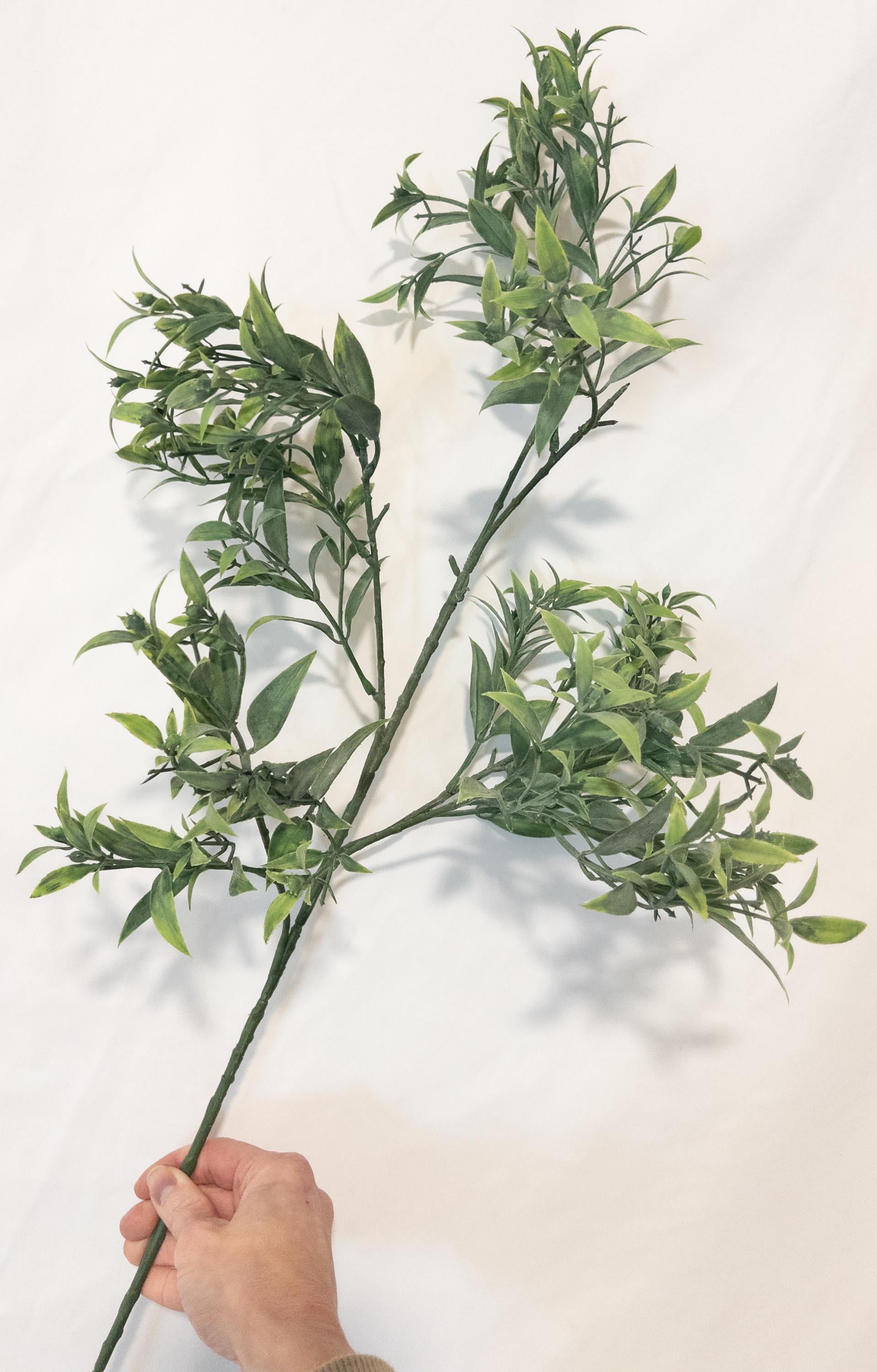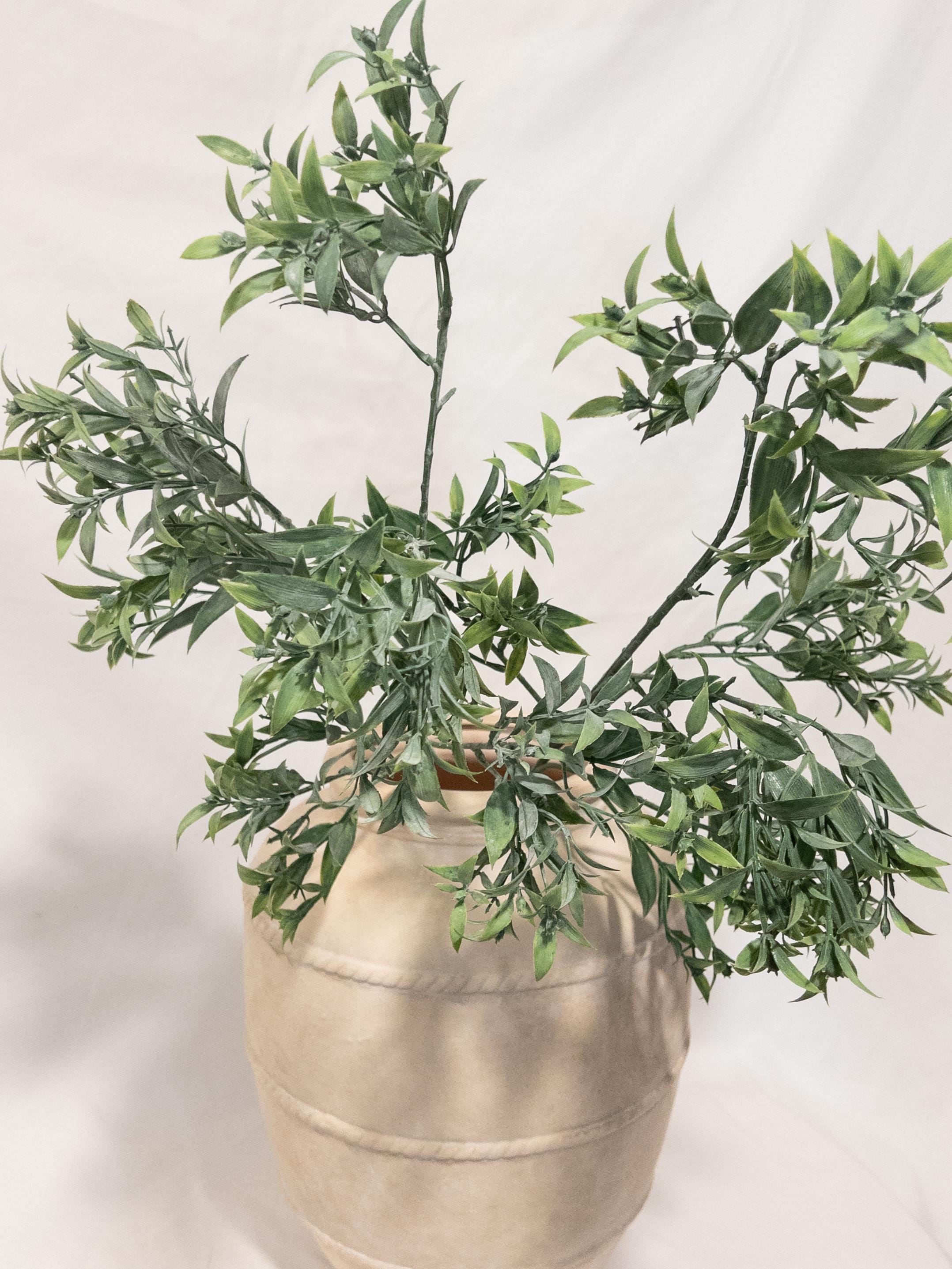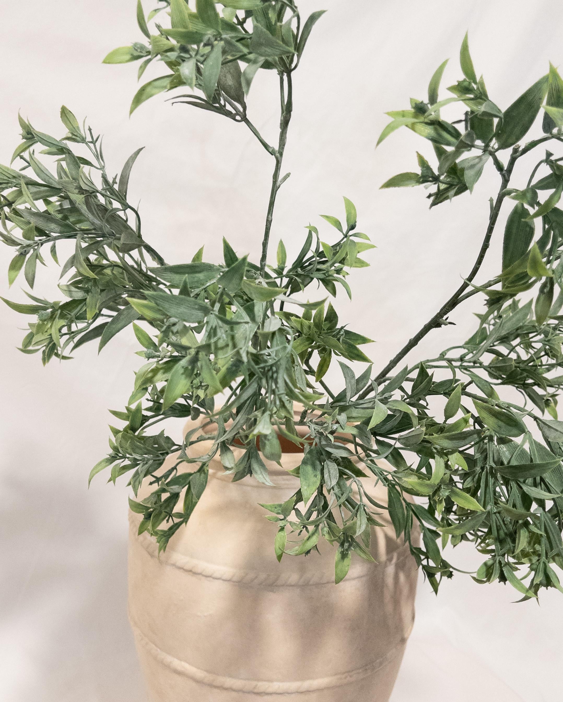 Bring effortless, airy greenery into your space with this beautifully realistic faux ruscus stem. Designed with layered, slender leaves in soft tonal greens, this piece adds natural movement and a relaxed Mediterranean feel to any arrangement.