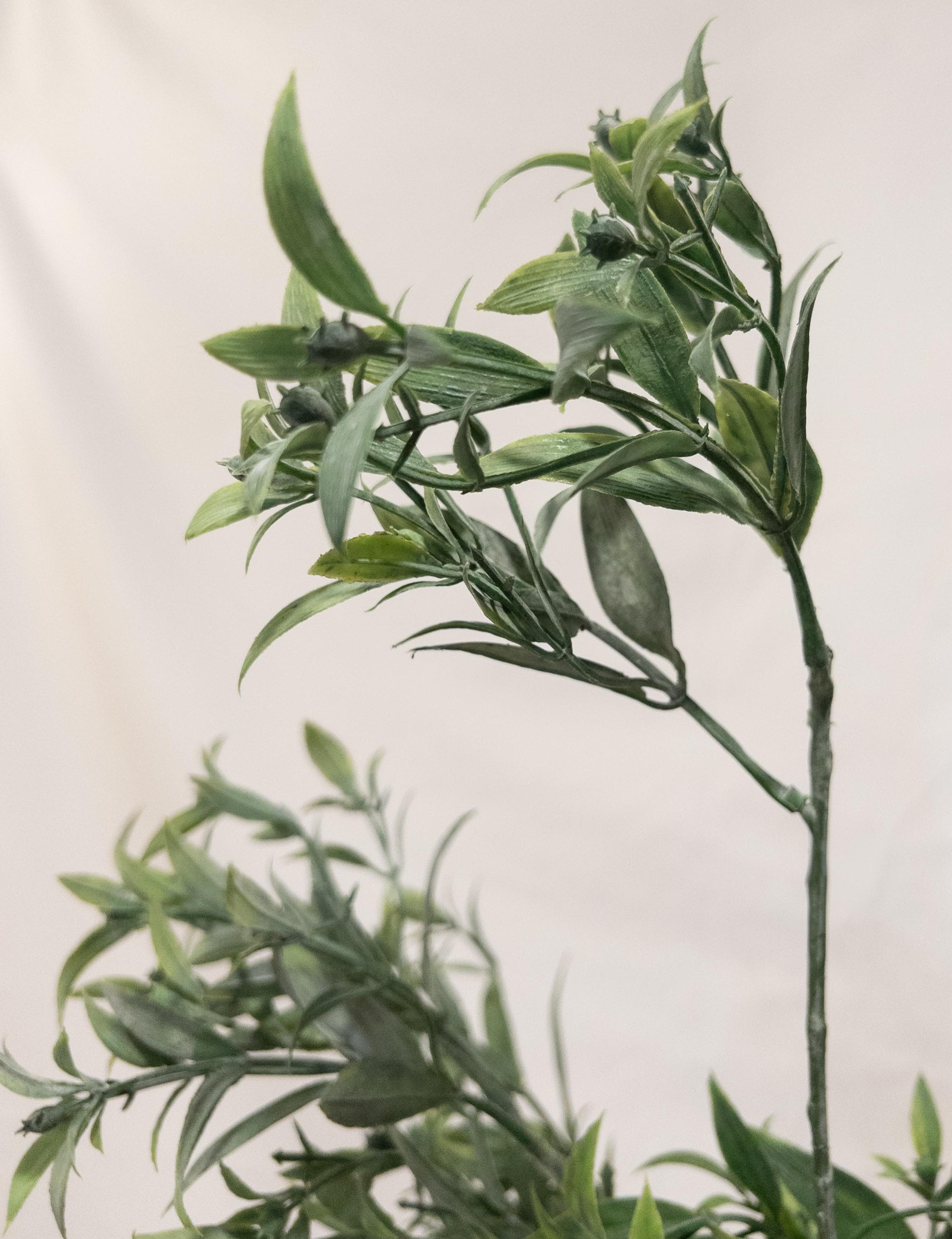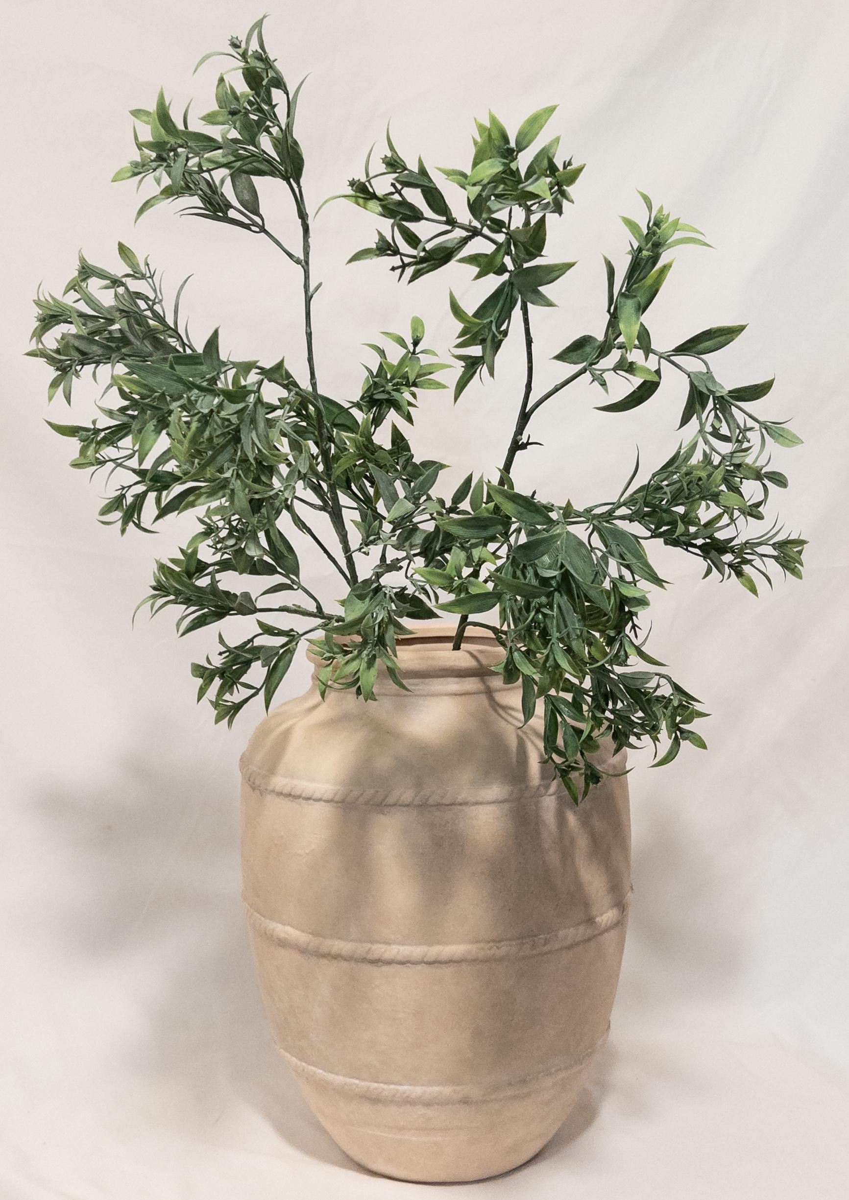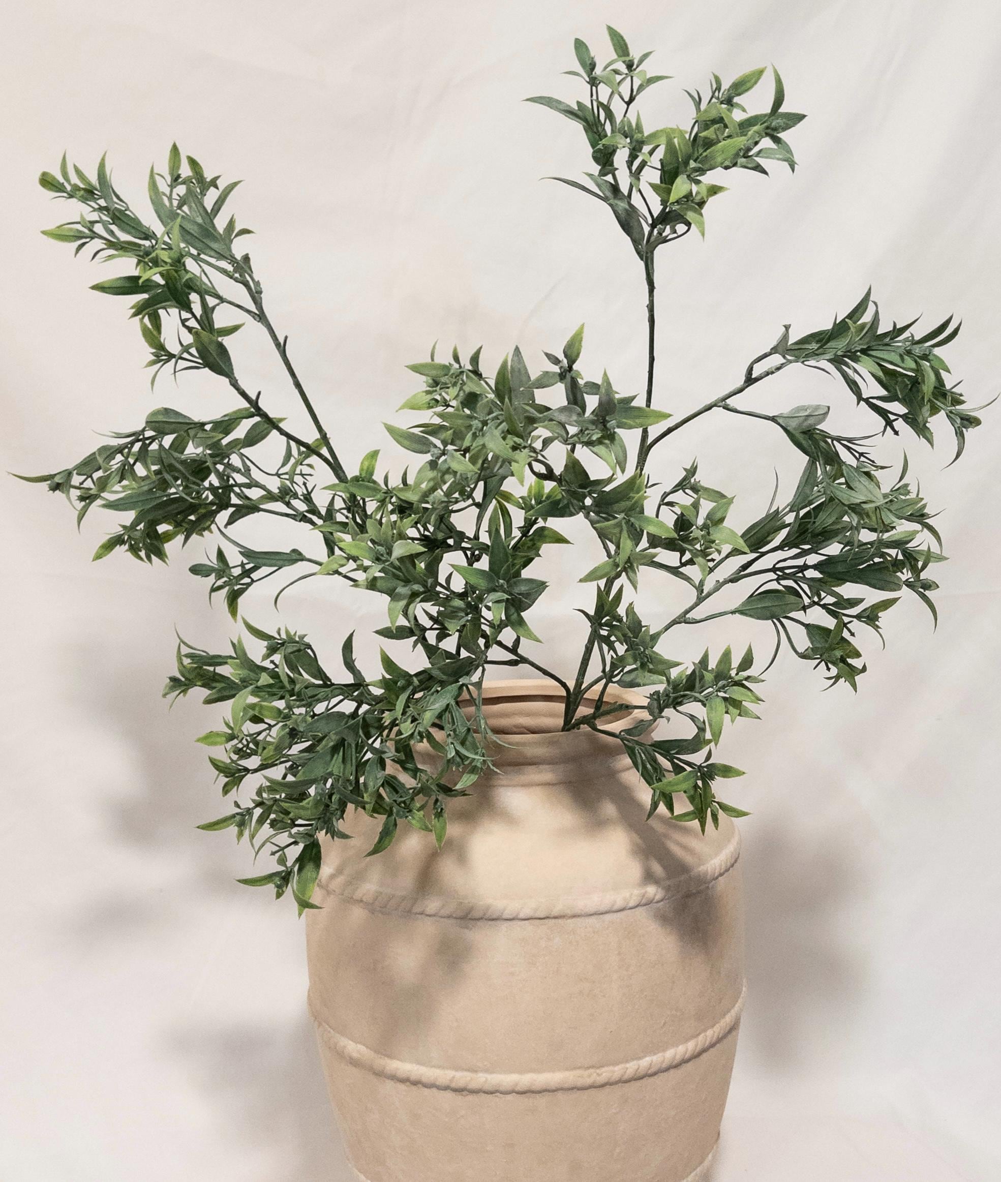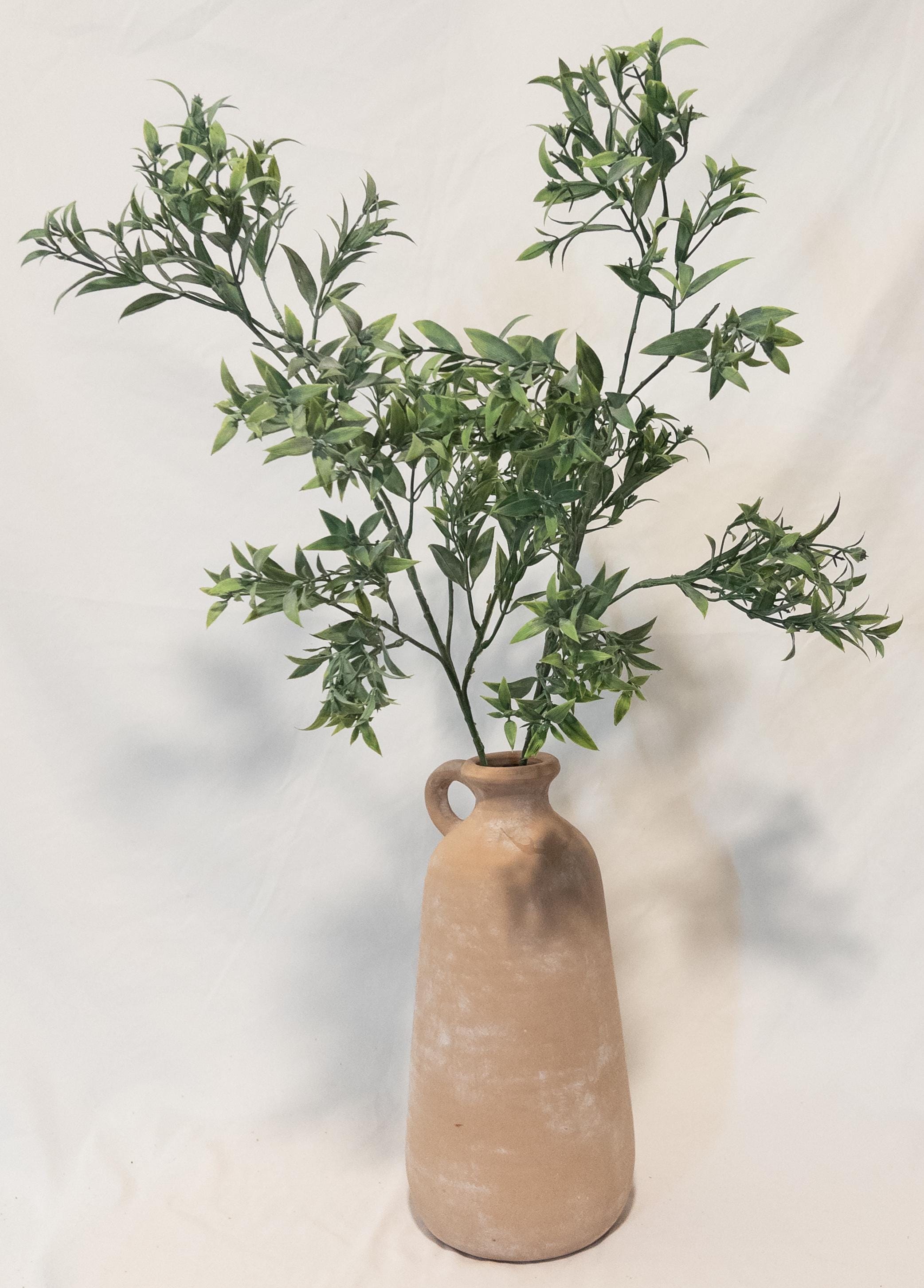 Bring effortless, airy greenery into your space with this beautifully realistic faux ruscus stem. Designed with layered, slender leaves in soft tonal greens, this piece adds natural movement and a relaxed Mediterranean feel to any arrangement.