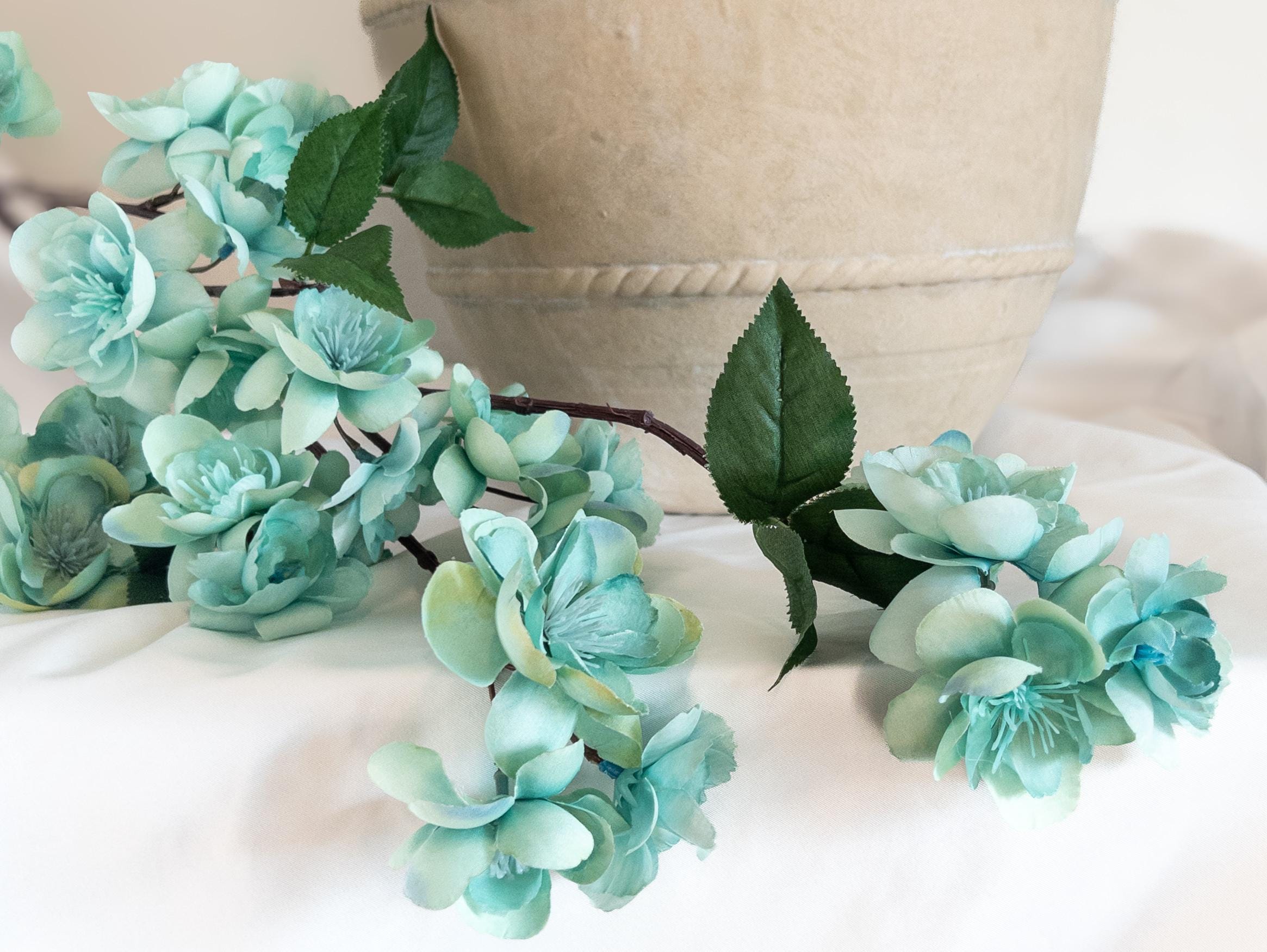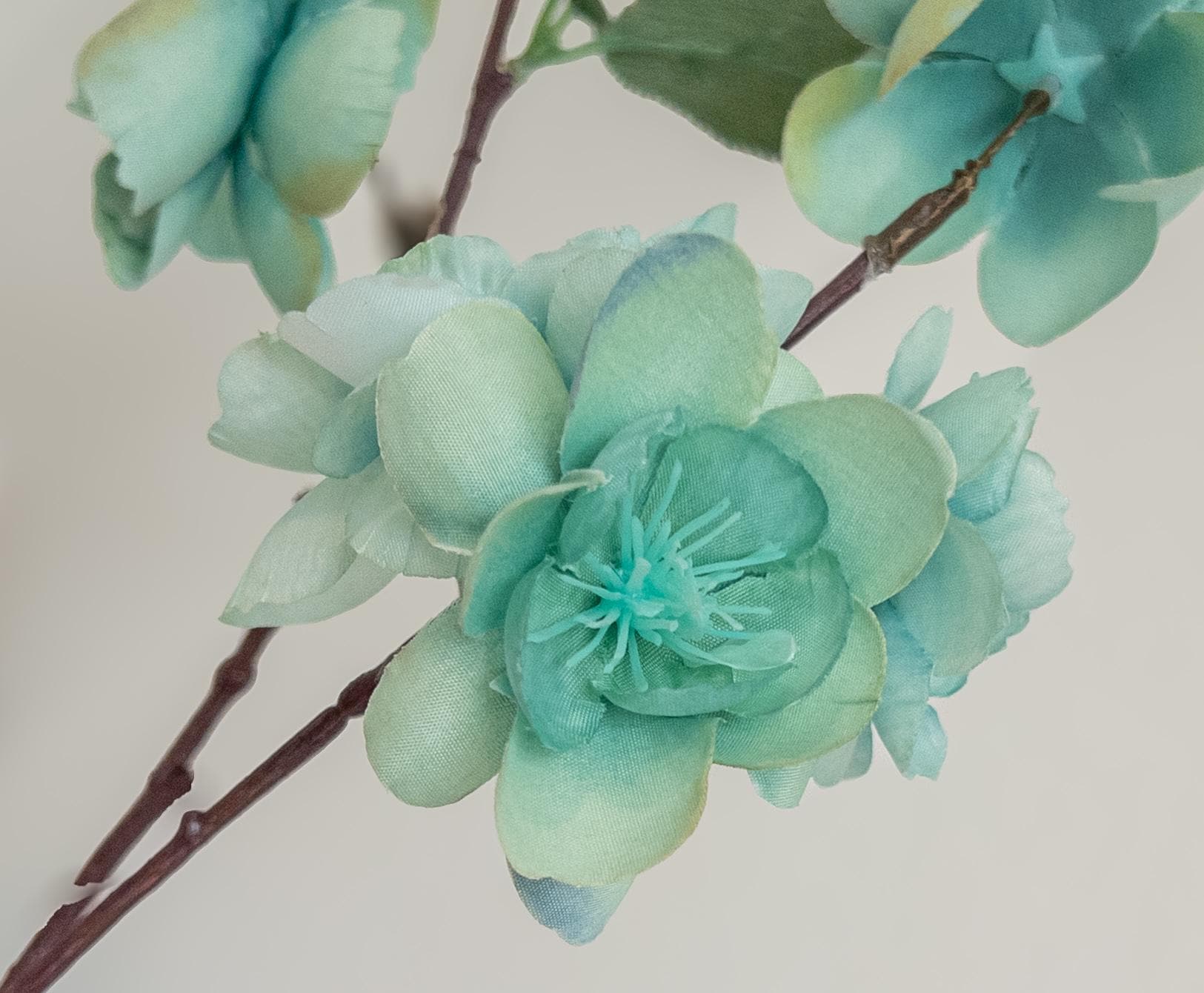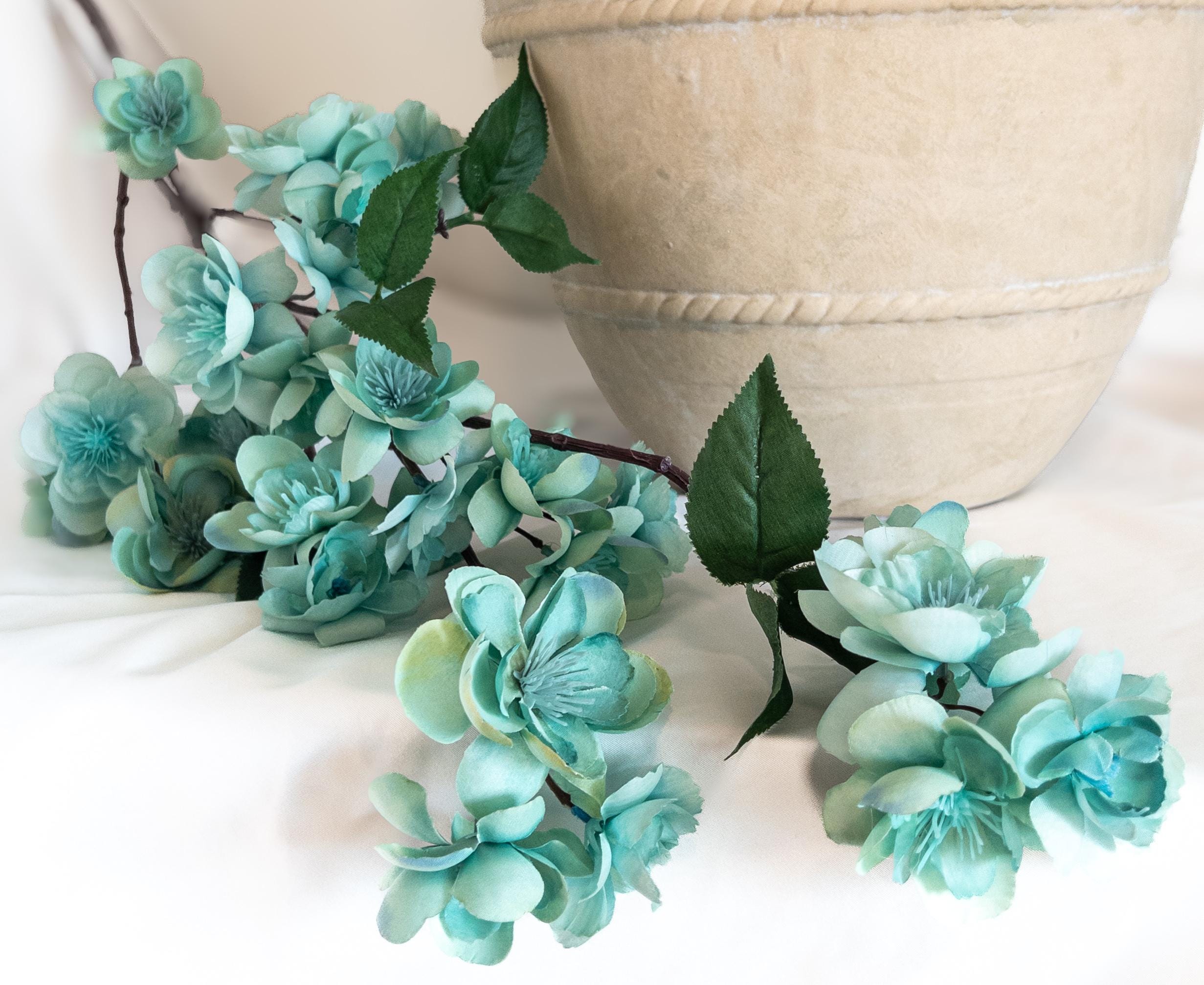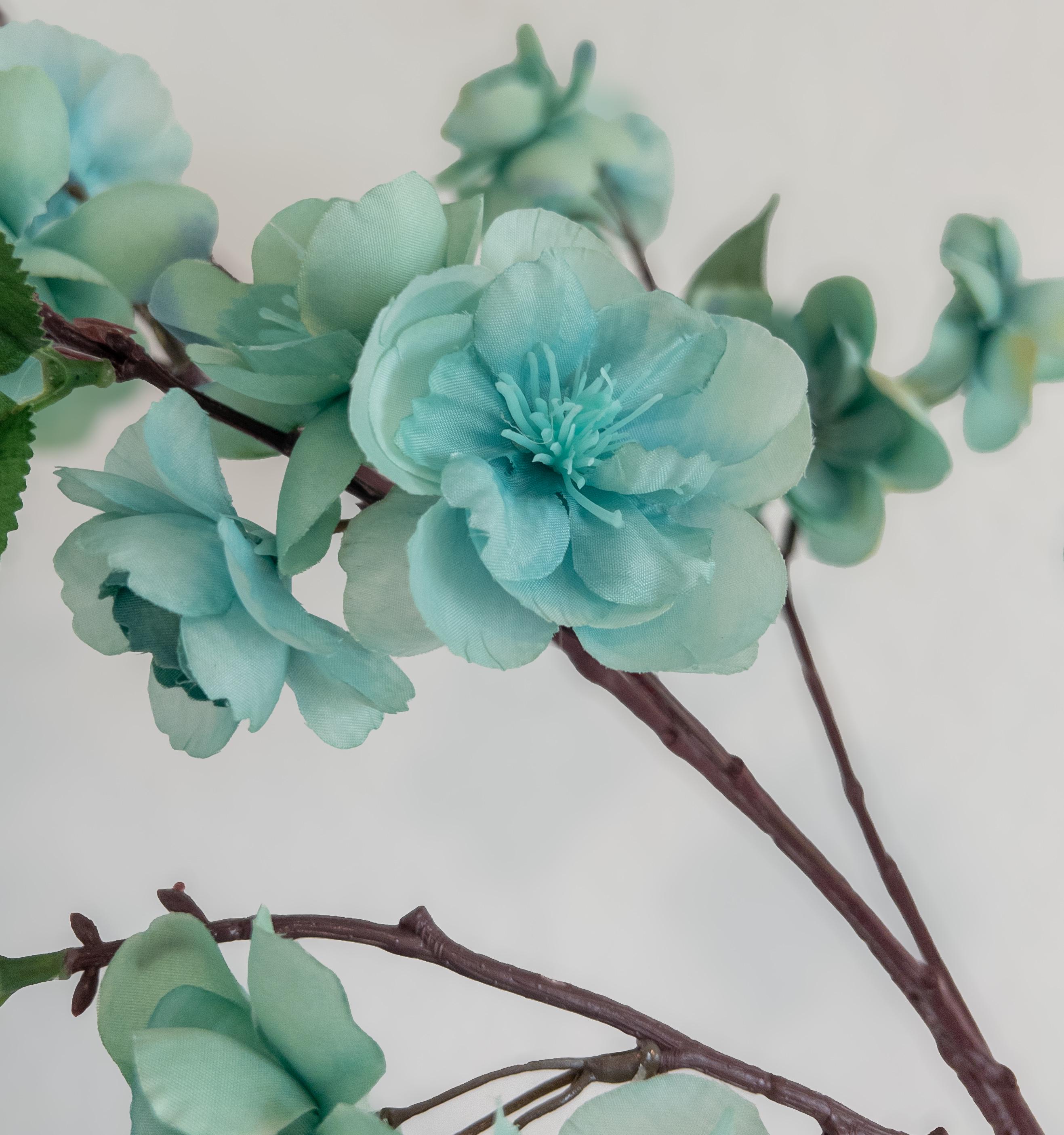 Bring a breath of soft color into your space with this pale turquoise blossom branch stem, featuring delicate aqua-toned blooms with subtle seafoam undertones.