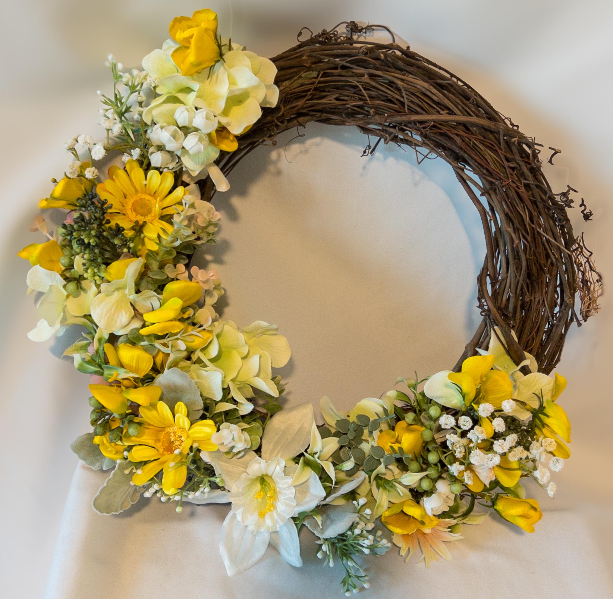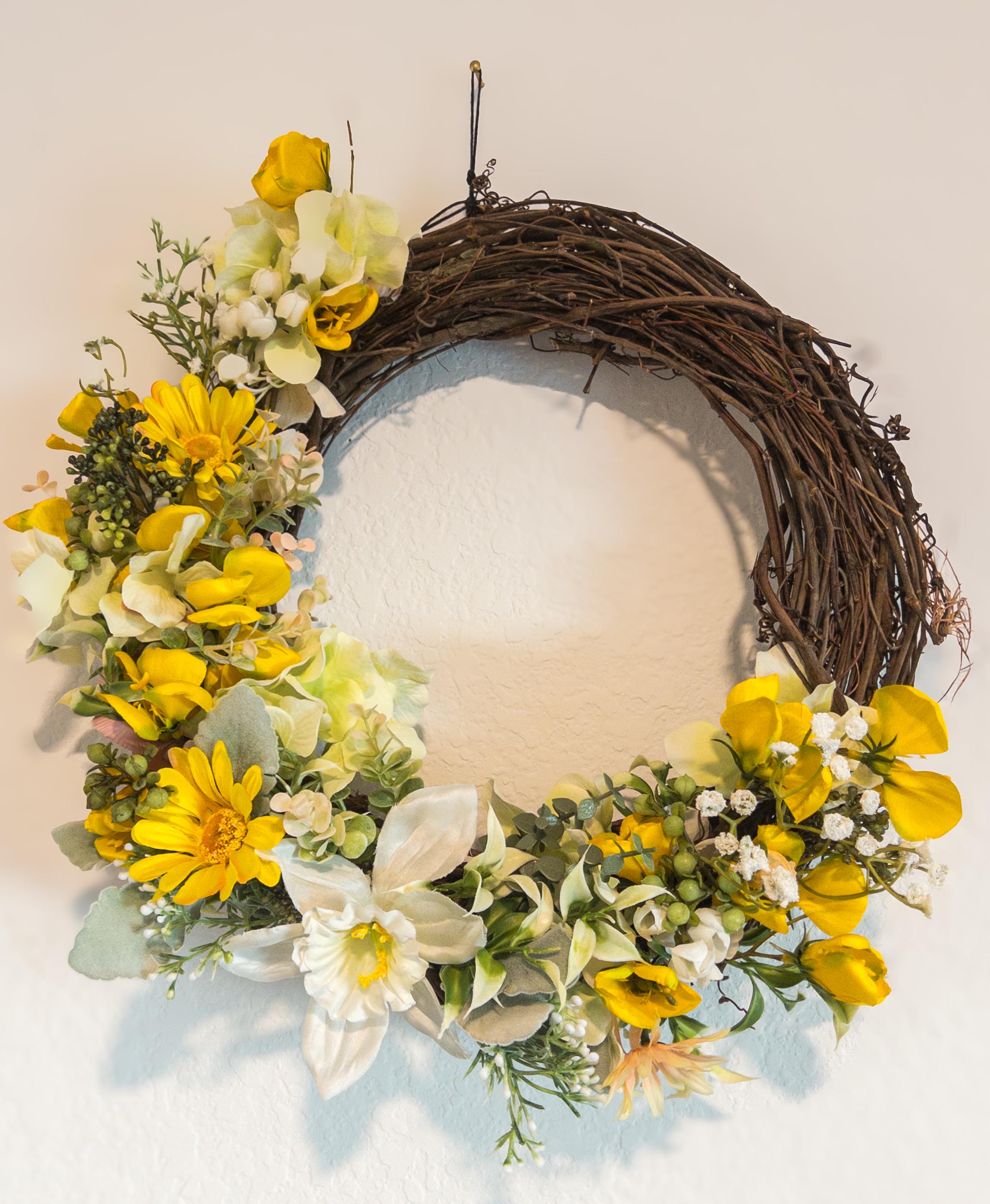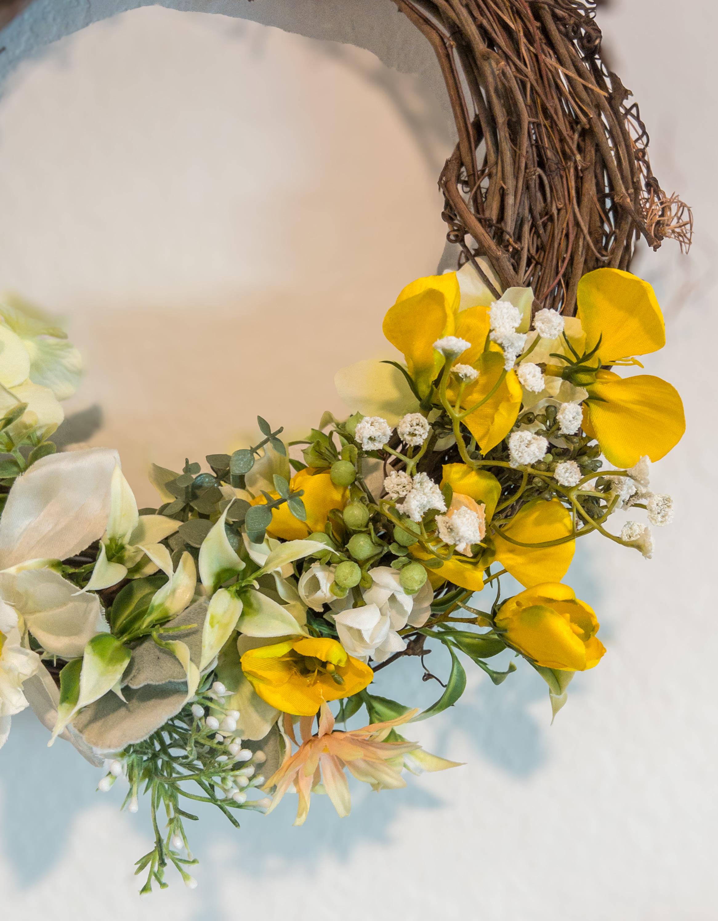 A cheerful burst of golden blooms, gathered on a natural grapevine base - this wreath brings a warm, sunlit charm to your home.