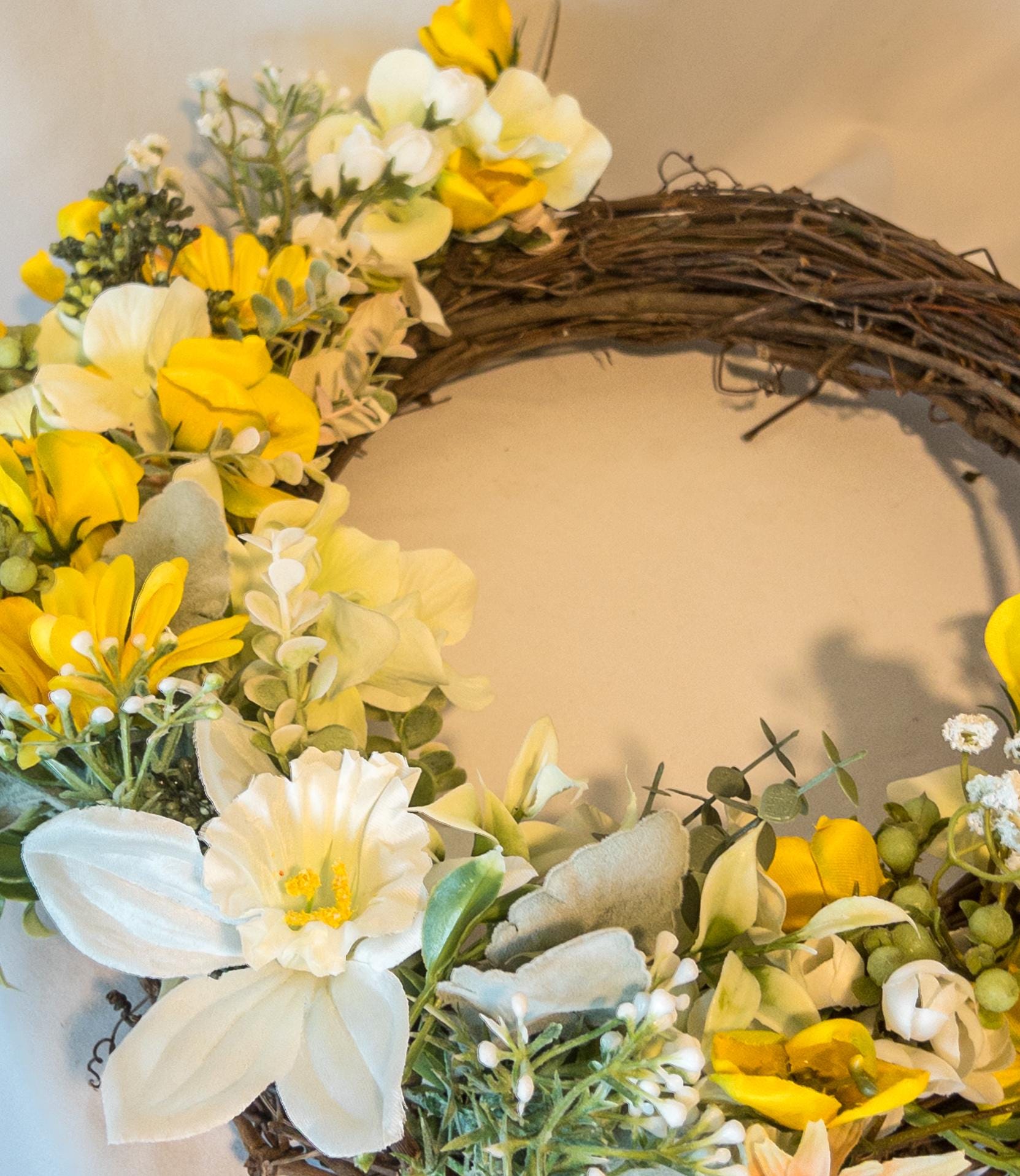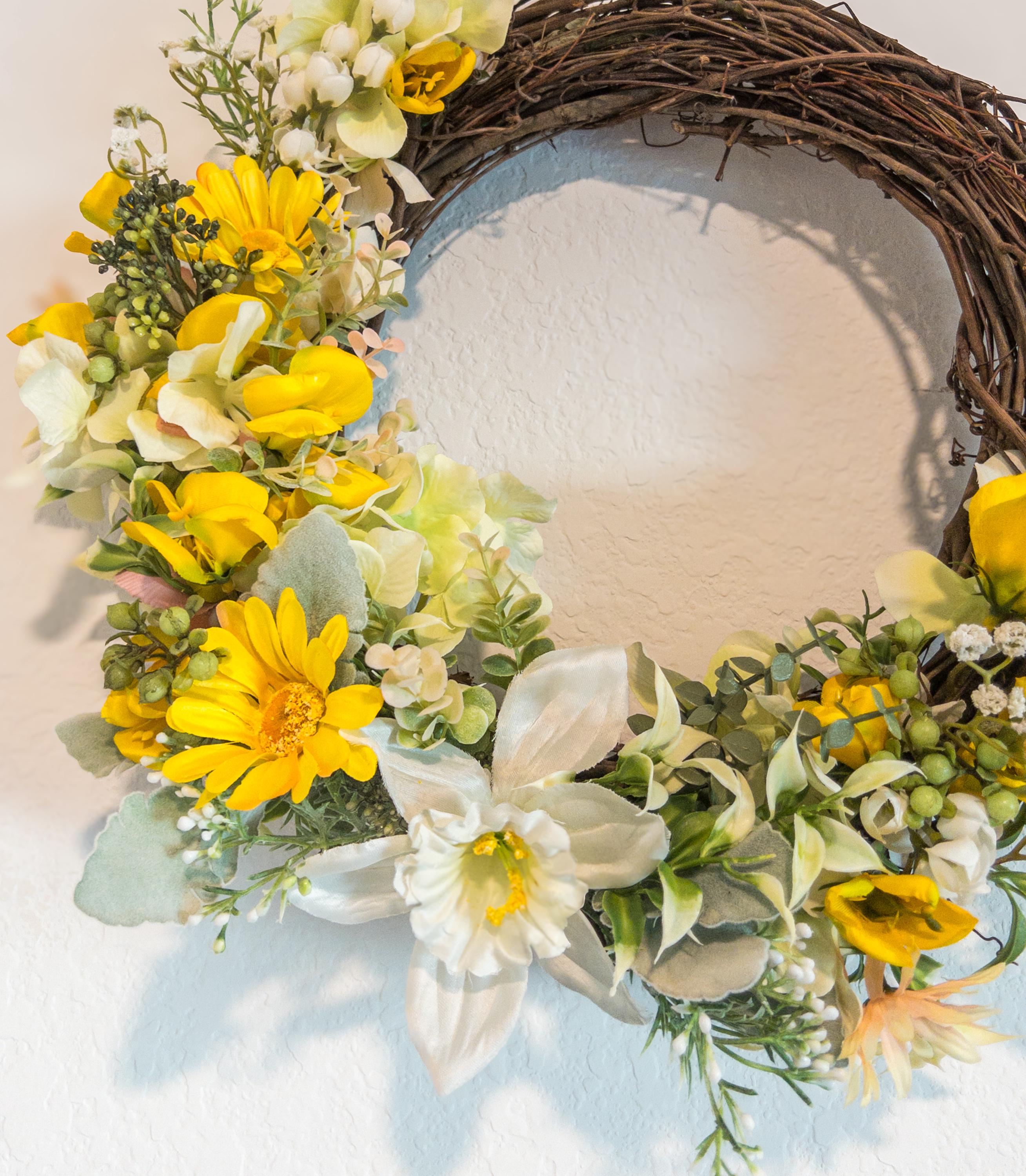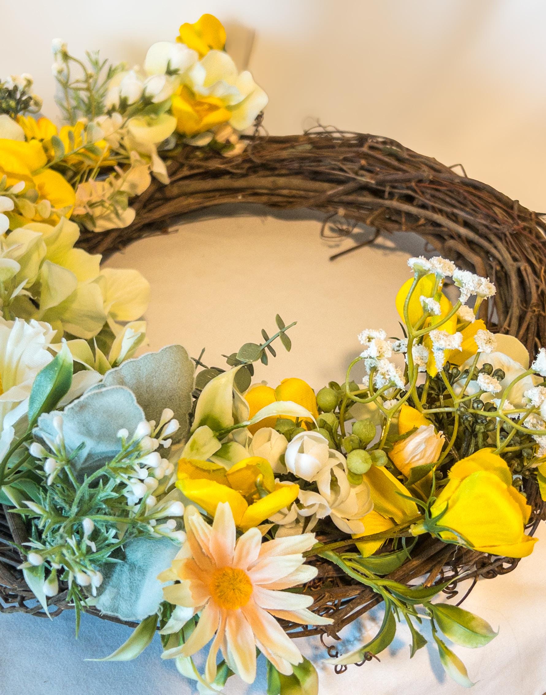 A cheerful burst of golden blooms, gathered on a natural grapevine base - this wreath brings a warm, sunlit charm to your home.