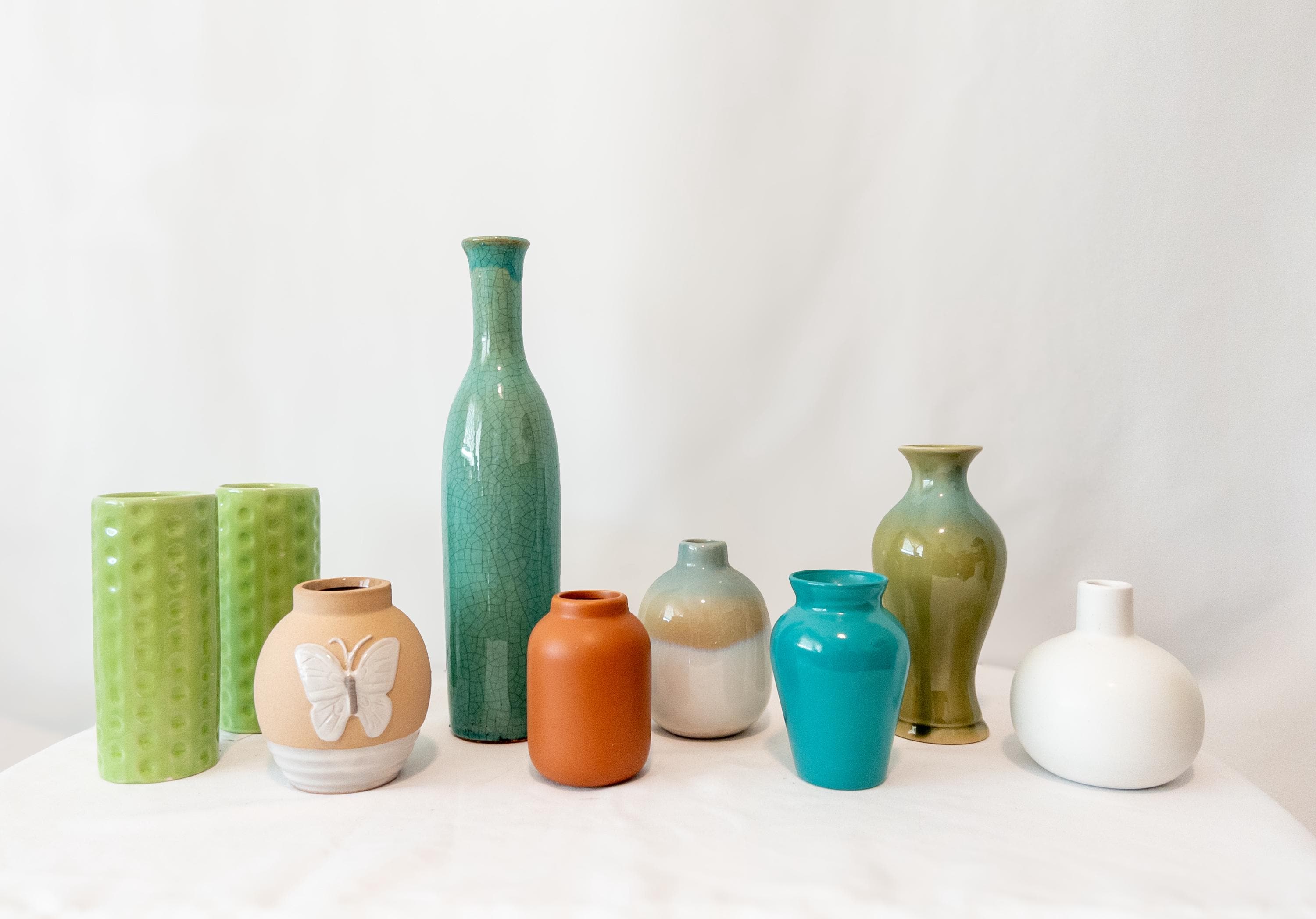 From mid-century apple green textures to crackled turquoise glaze and a delicate butterfly detail, these petite vases are perfect for styling shelves, creating layered tablescapes, or holding a single stem.