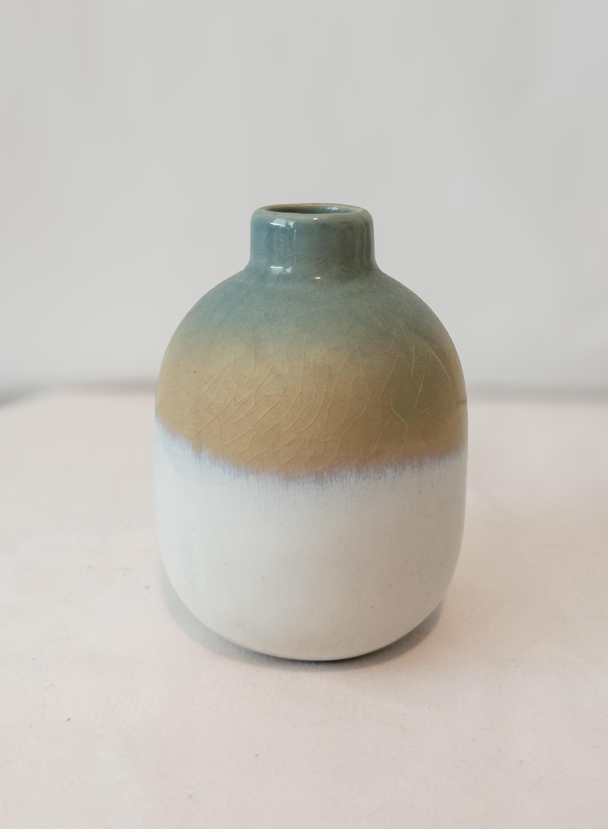 5. Blue / Cream / Tan Glazed Vase – 4” H x 3” W x 0.75” opening