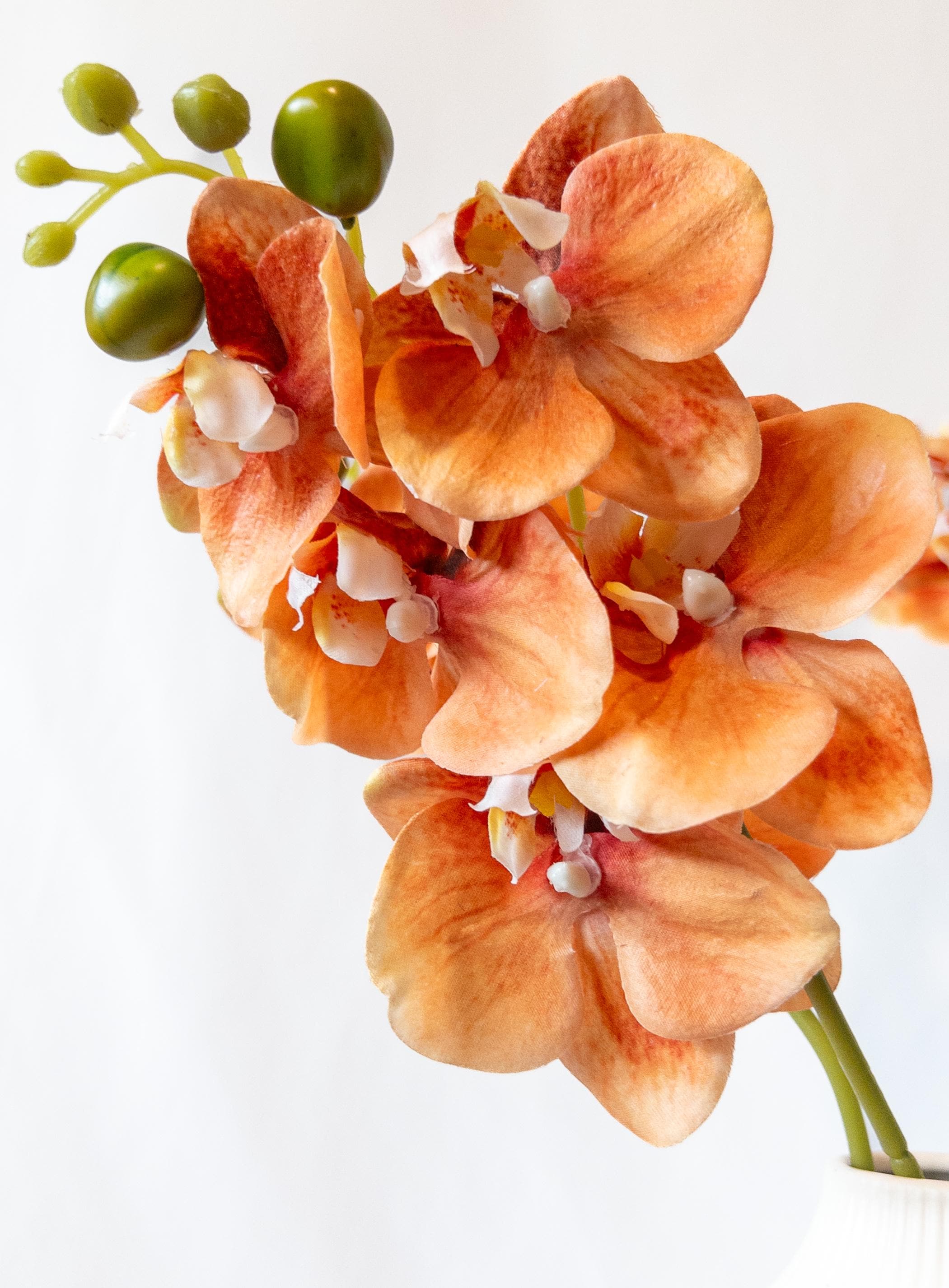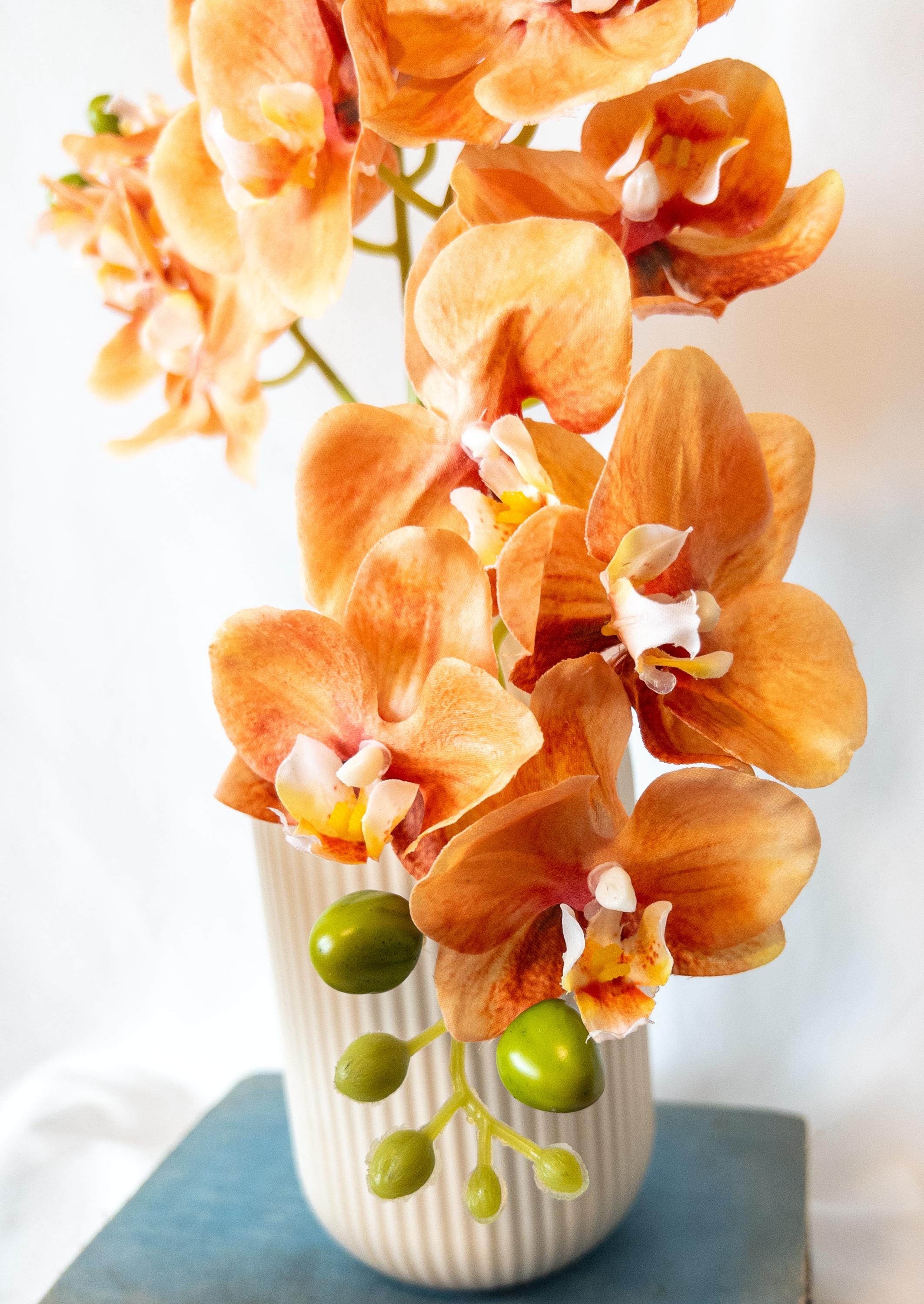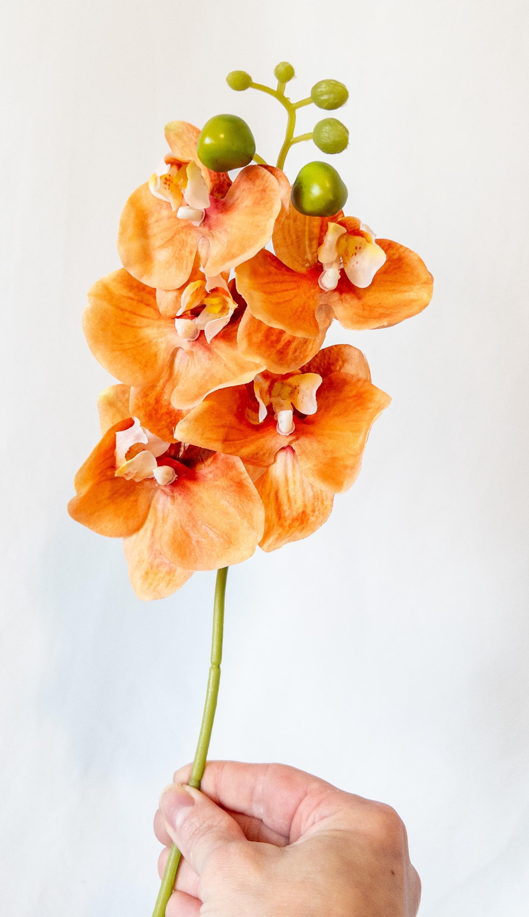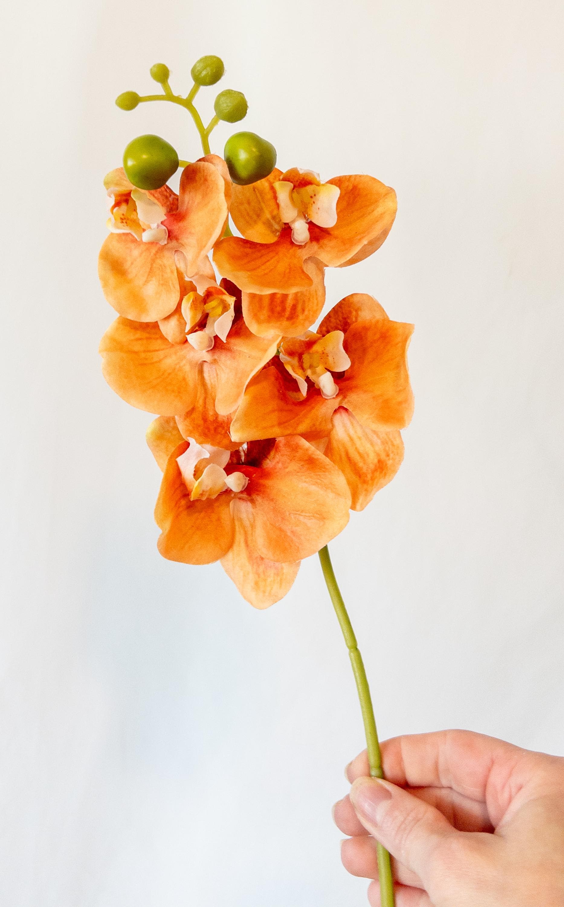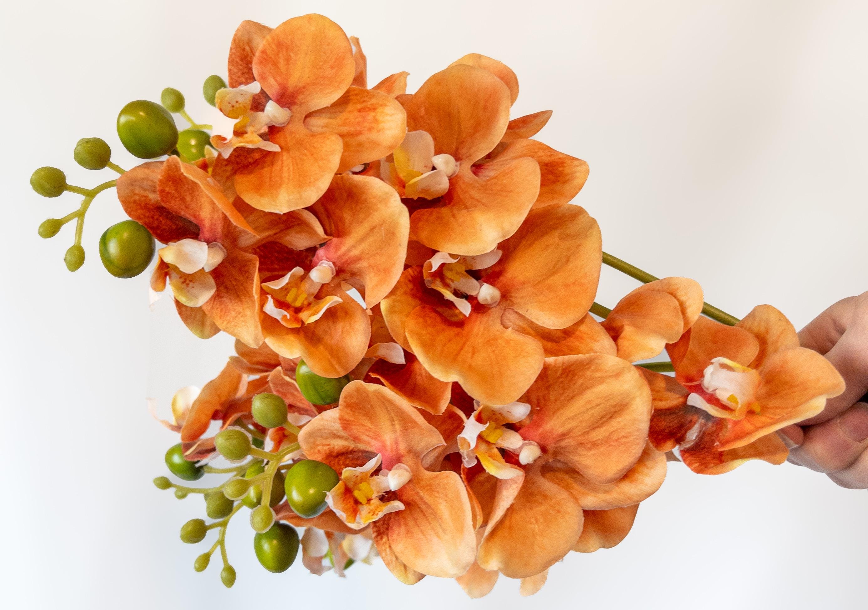 A warm, sunlit take on a classic orchid - this real touch Phalaenopsis-style orchid stem features rich orange petals with soft golden undertones and delicate white centers for a beautifully natural look.