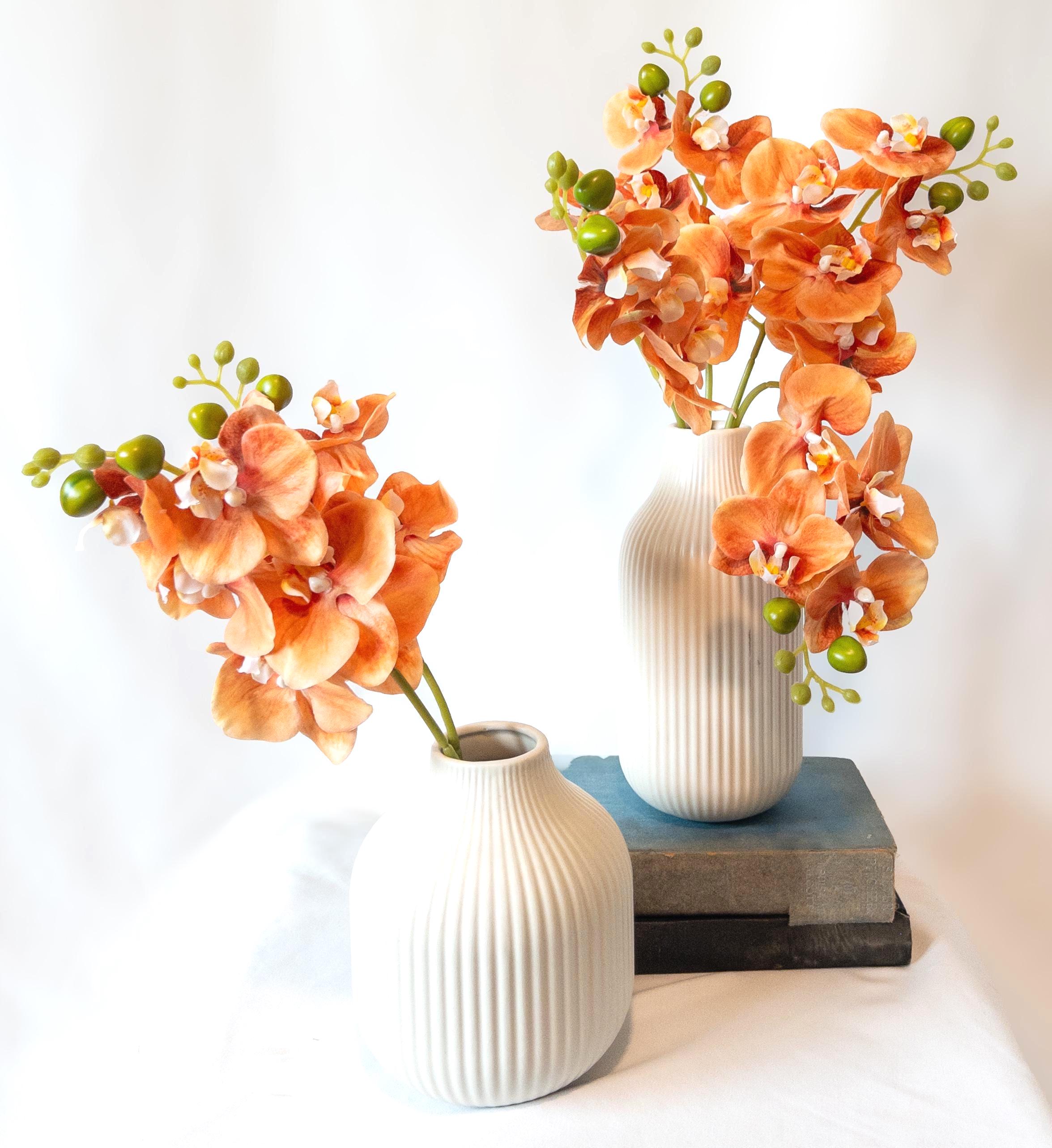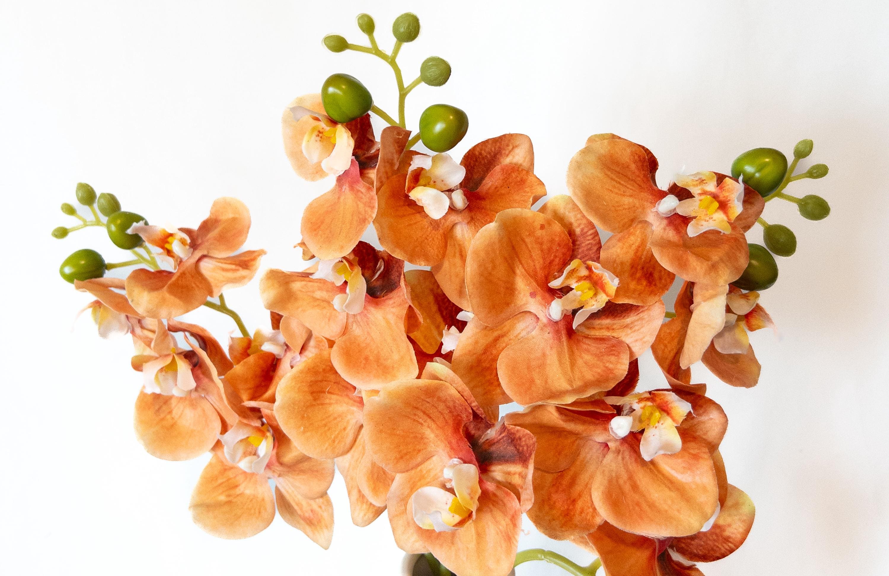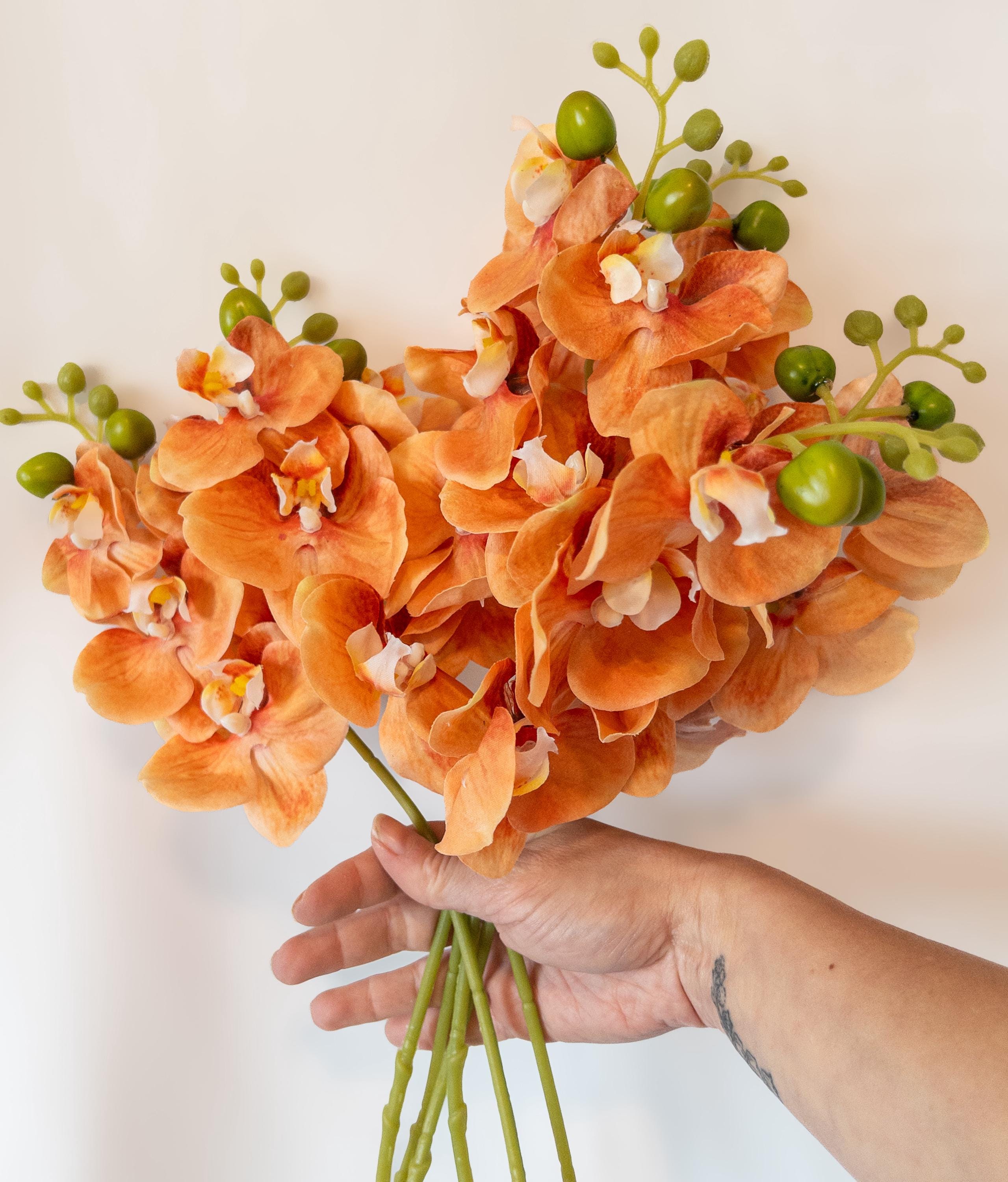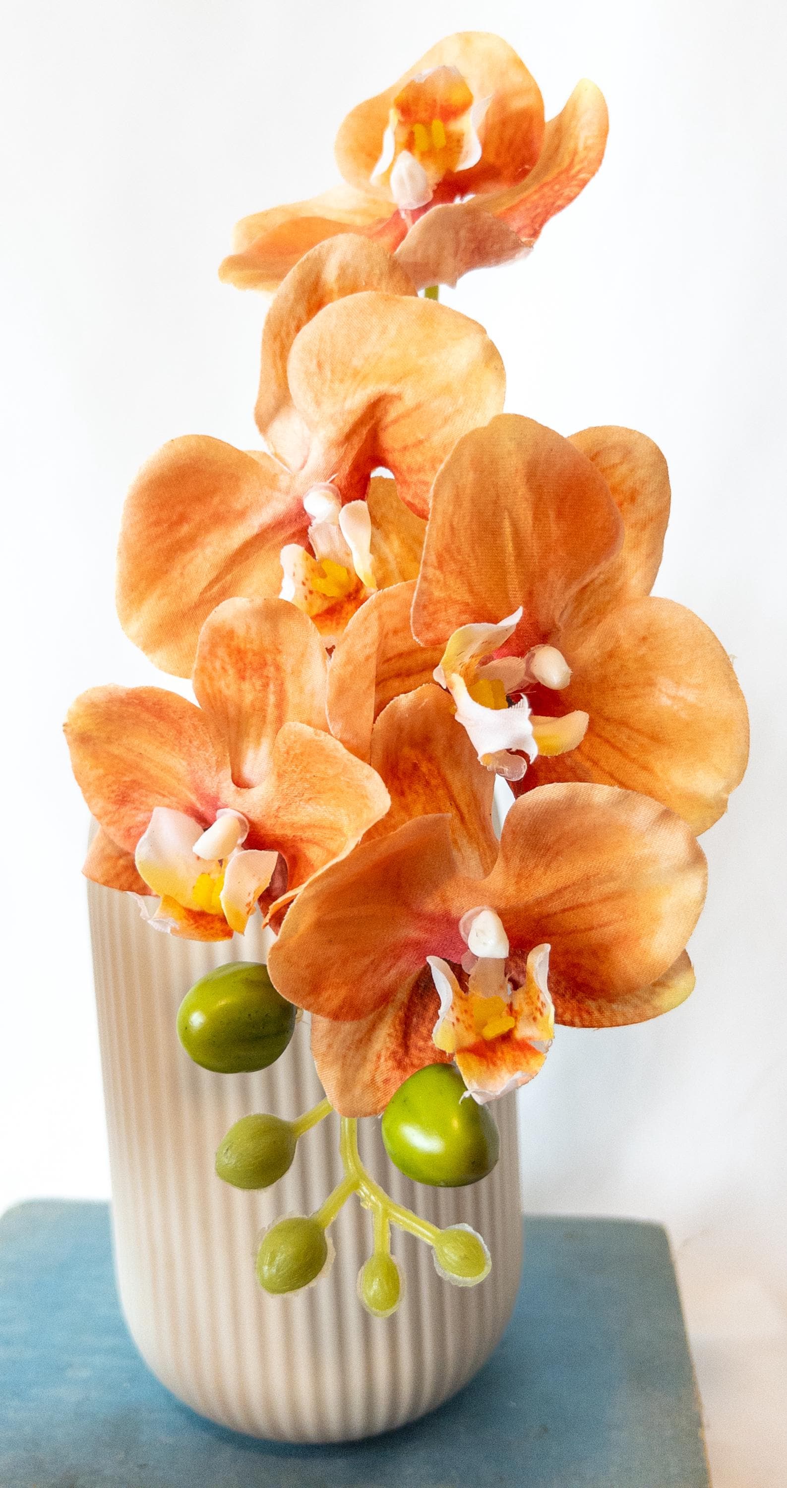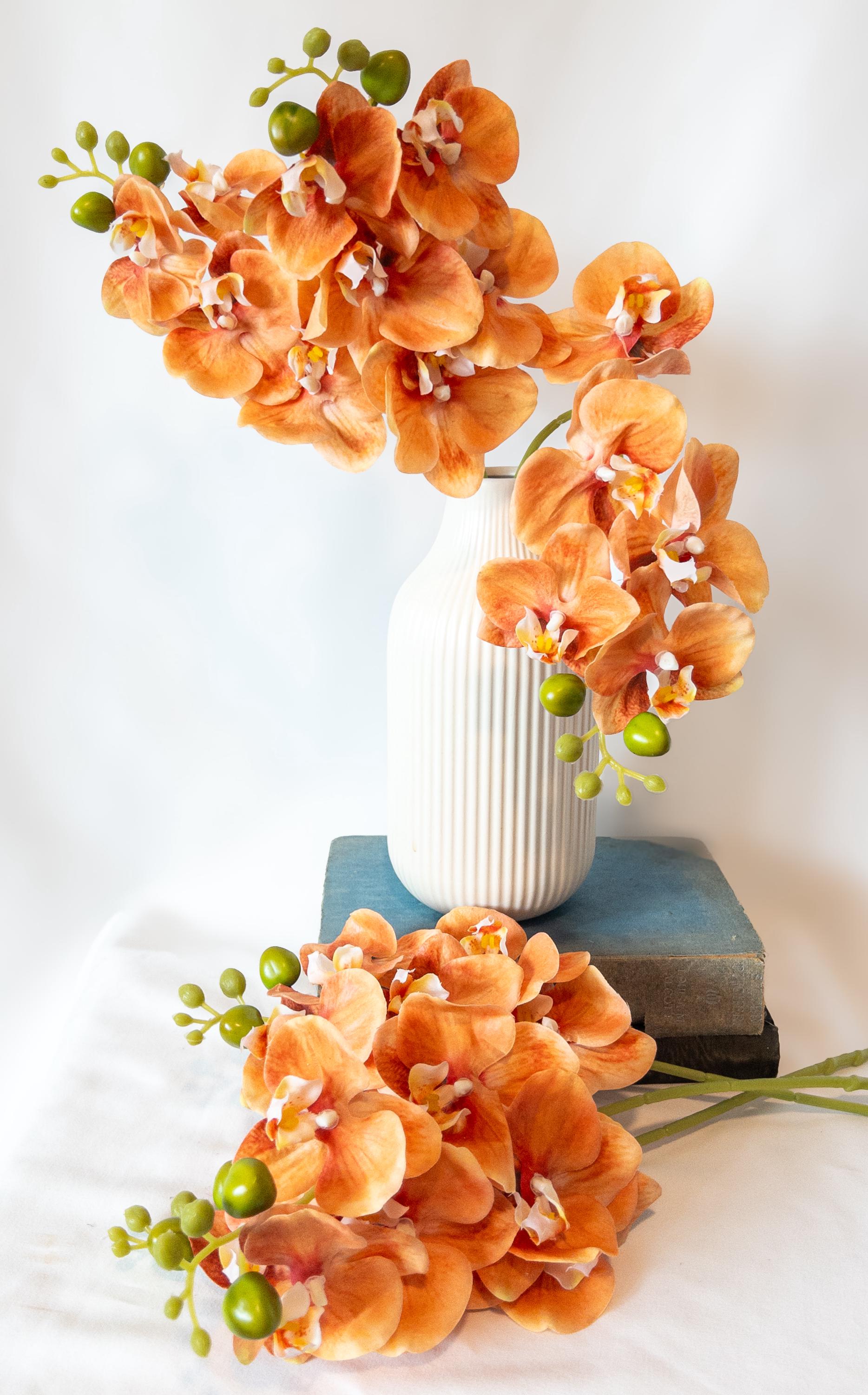 A warm, sunlit take on a classic orchid - this real touch Phalaenopsis-style orchid stem features rich orange petals with soft golden undertones and delicate white centers for a beautifully natural look.
