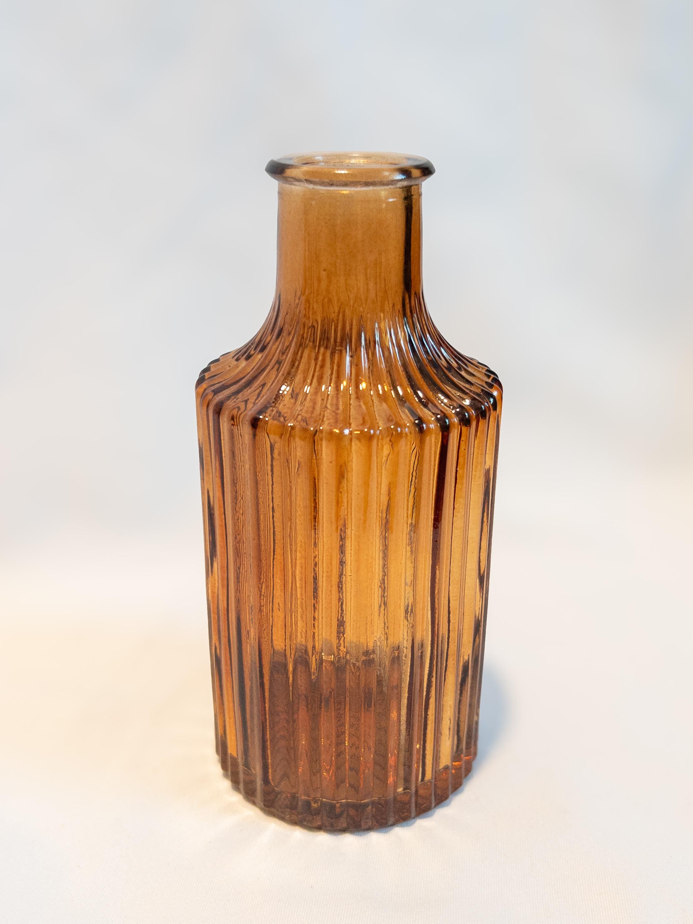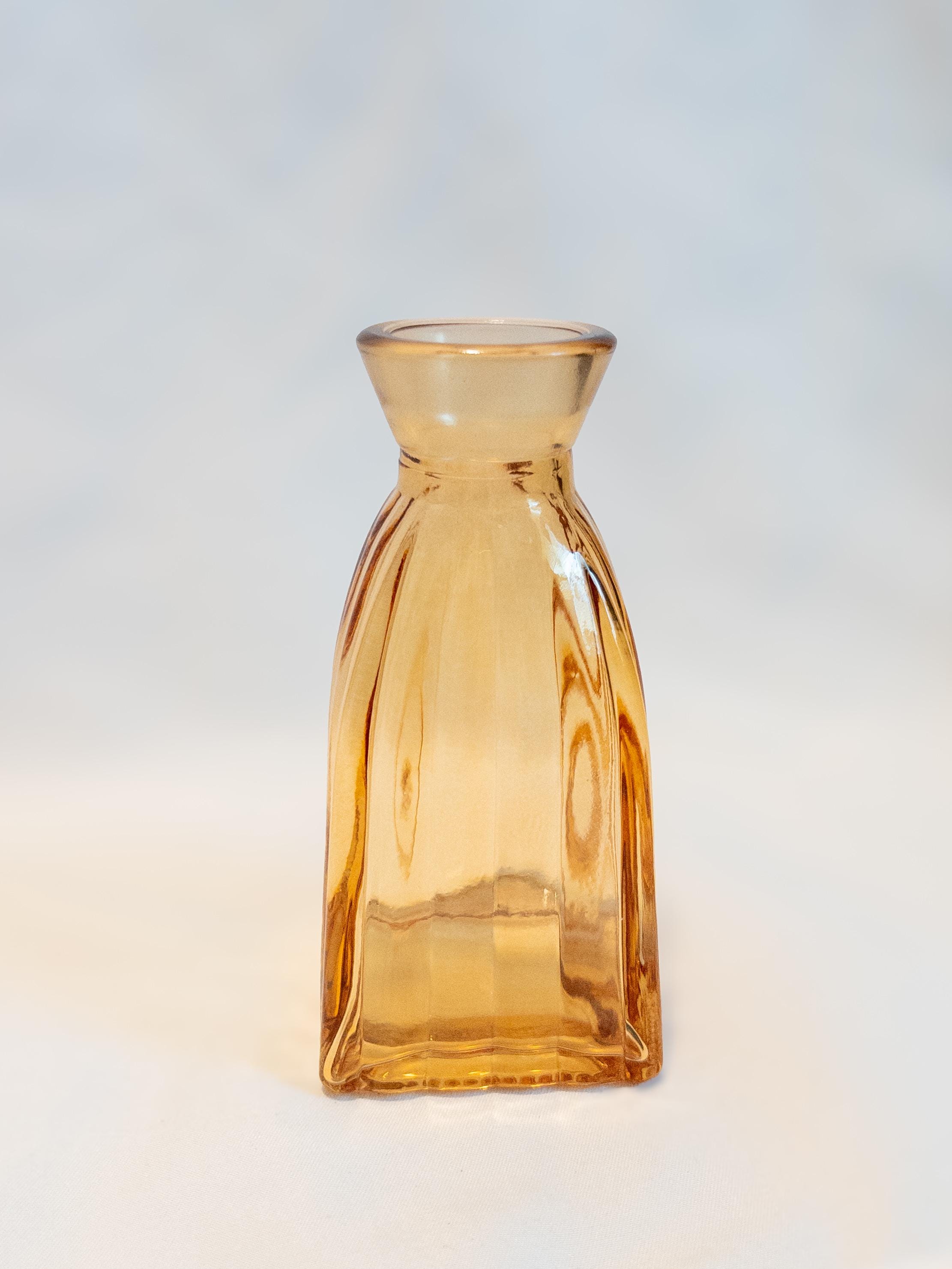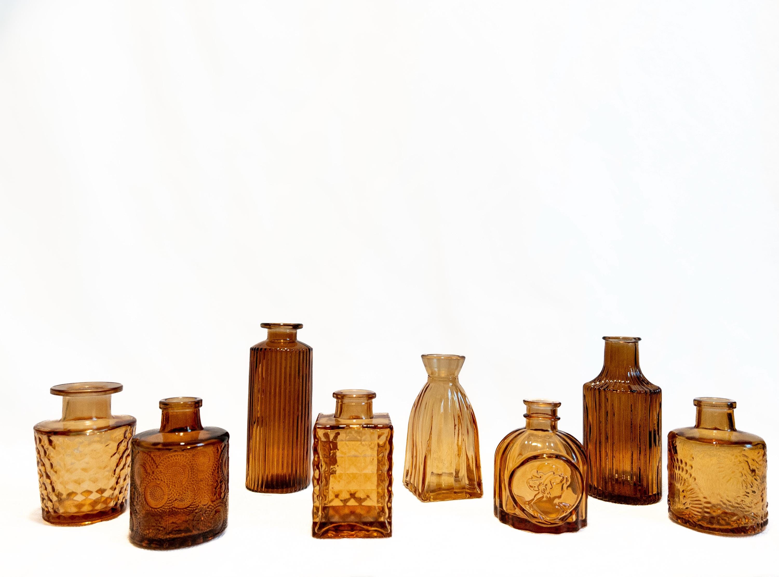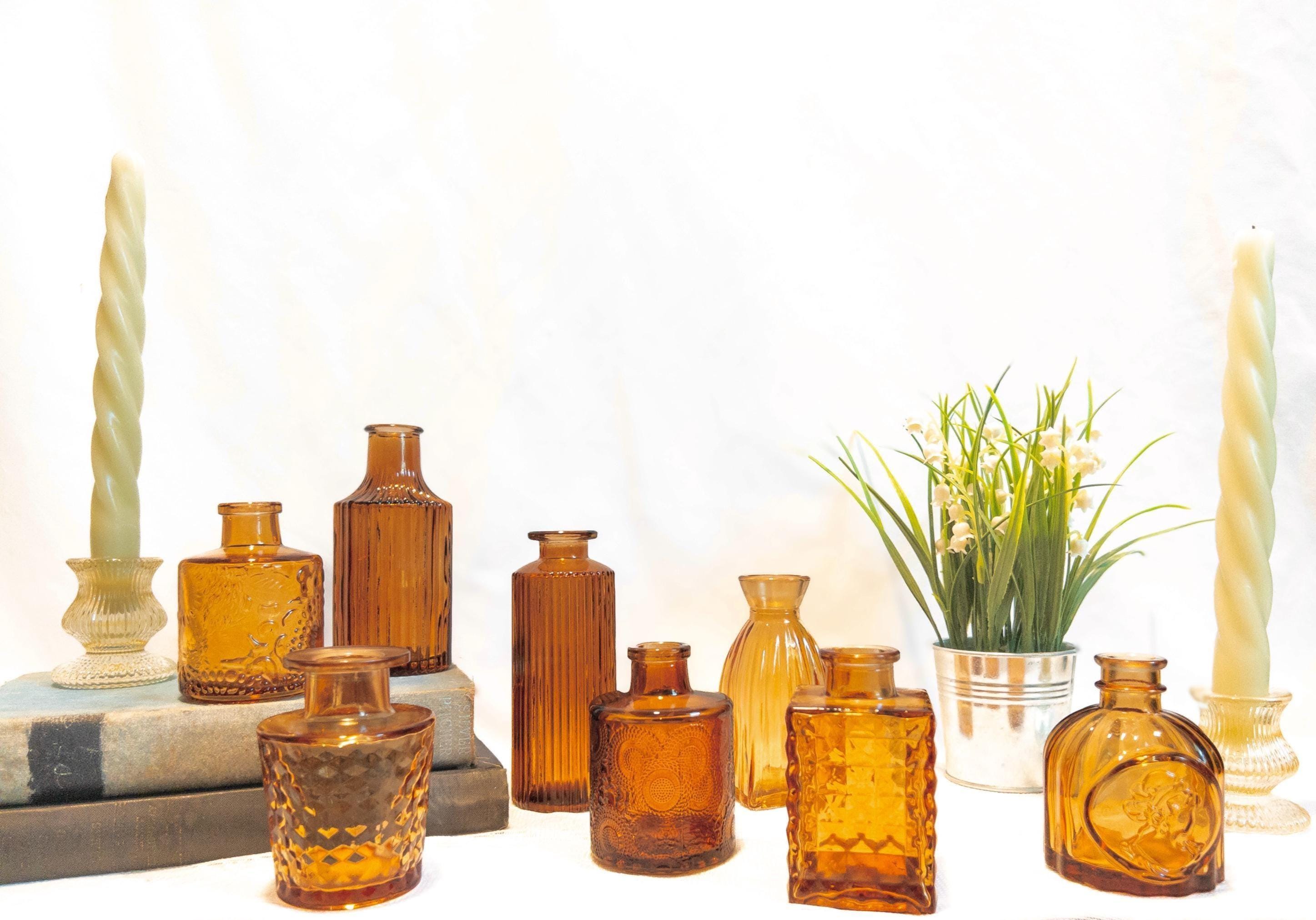 A curated collection of honey amber glass bud vases with vintage-inspired texture and glow.