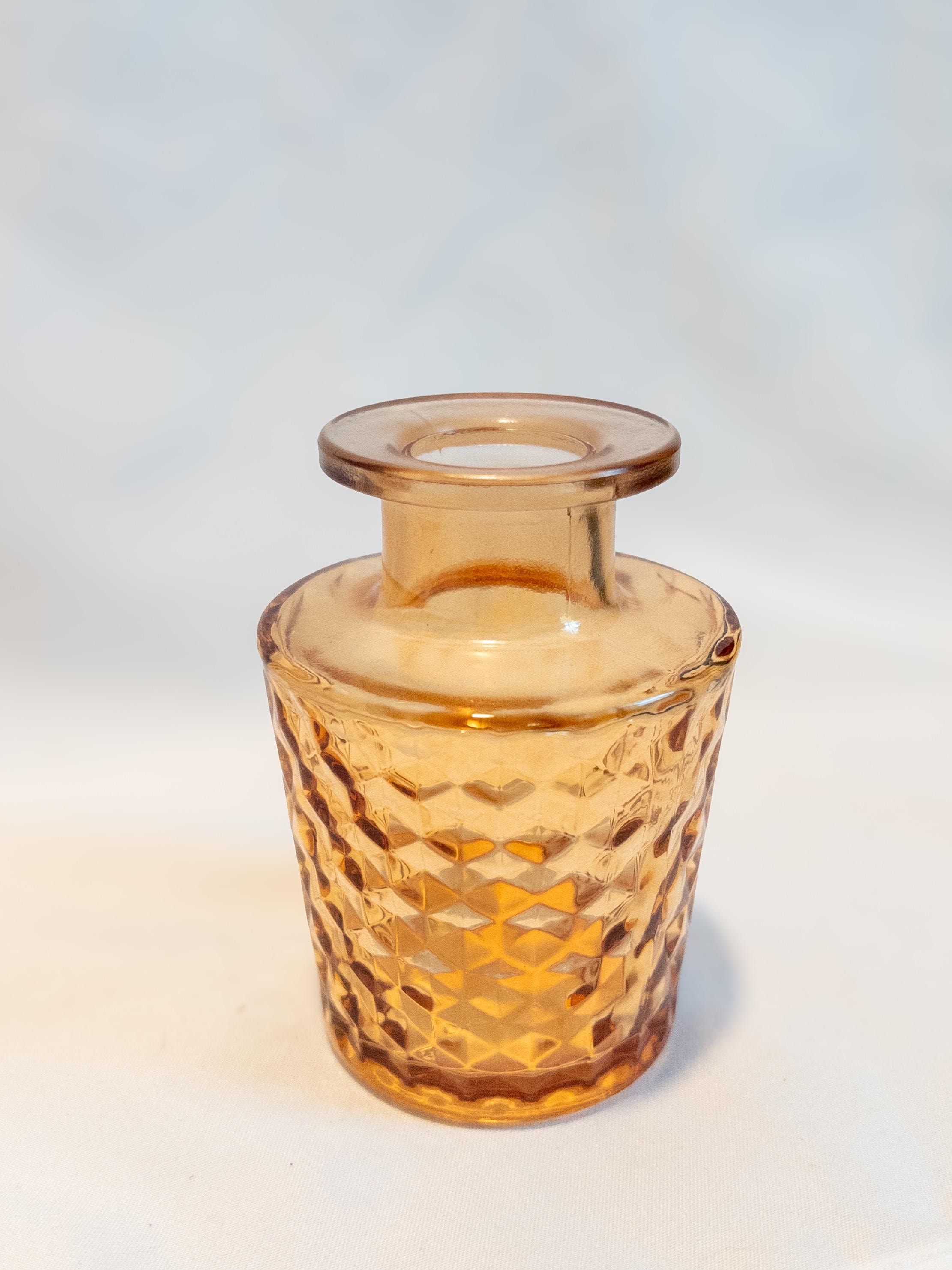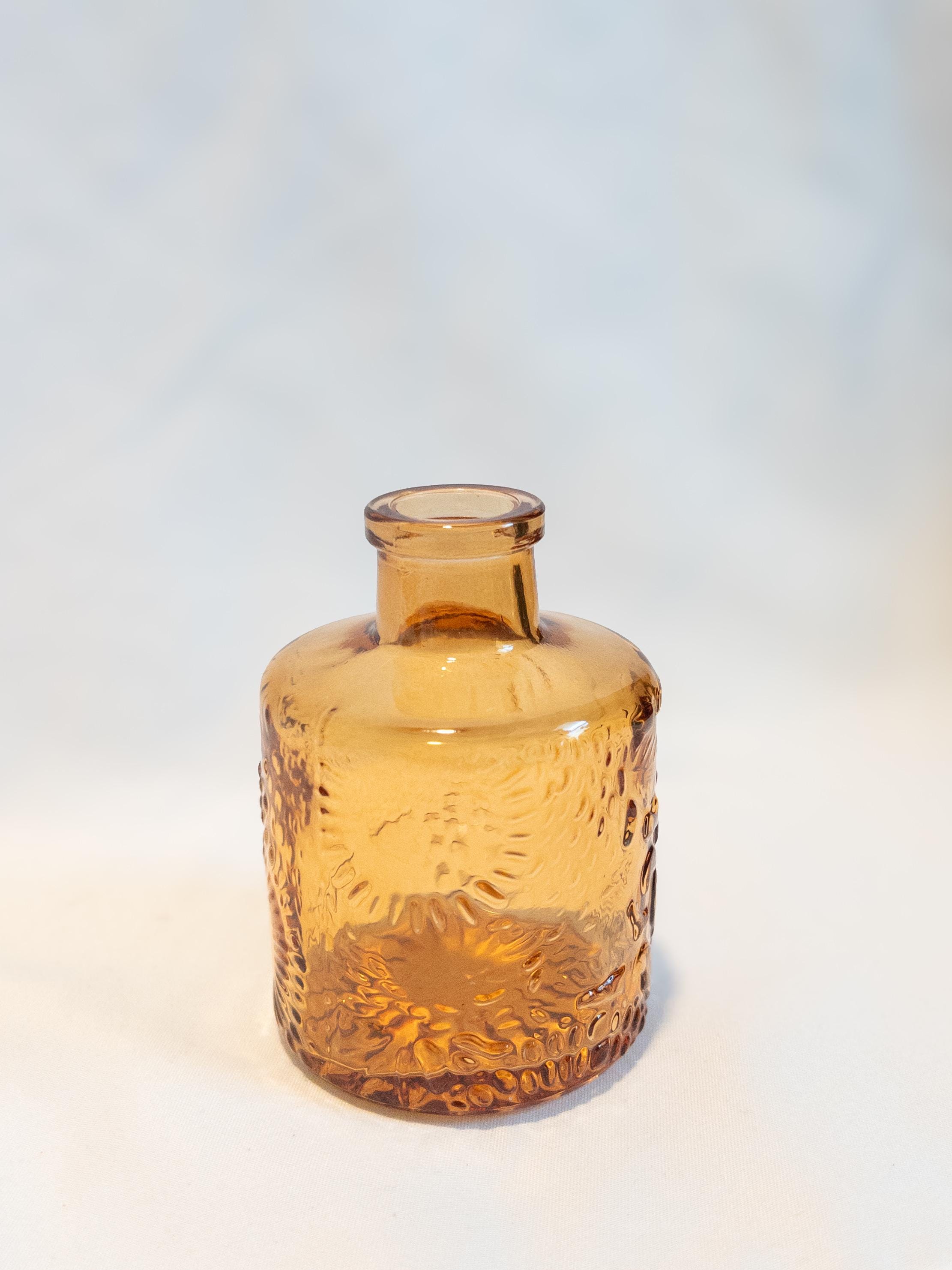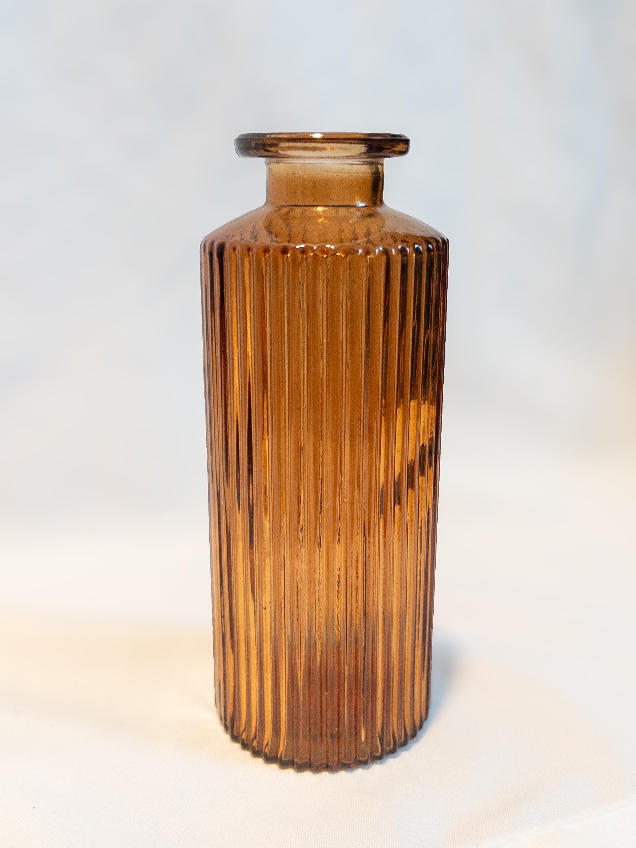 A curated collection of honey amber glass bud vases with vintage-inspired texture and glow.