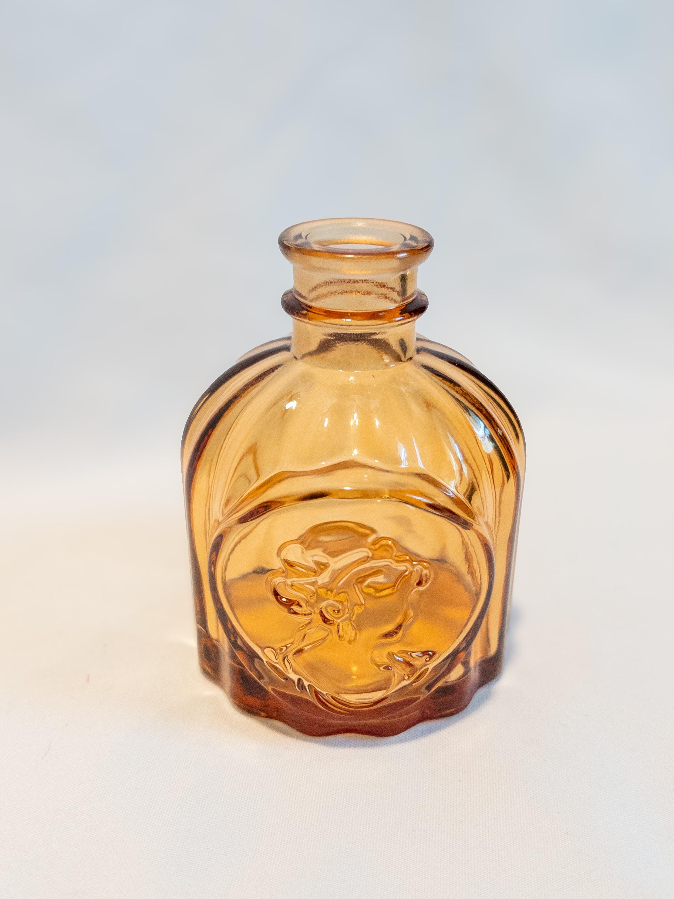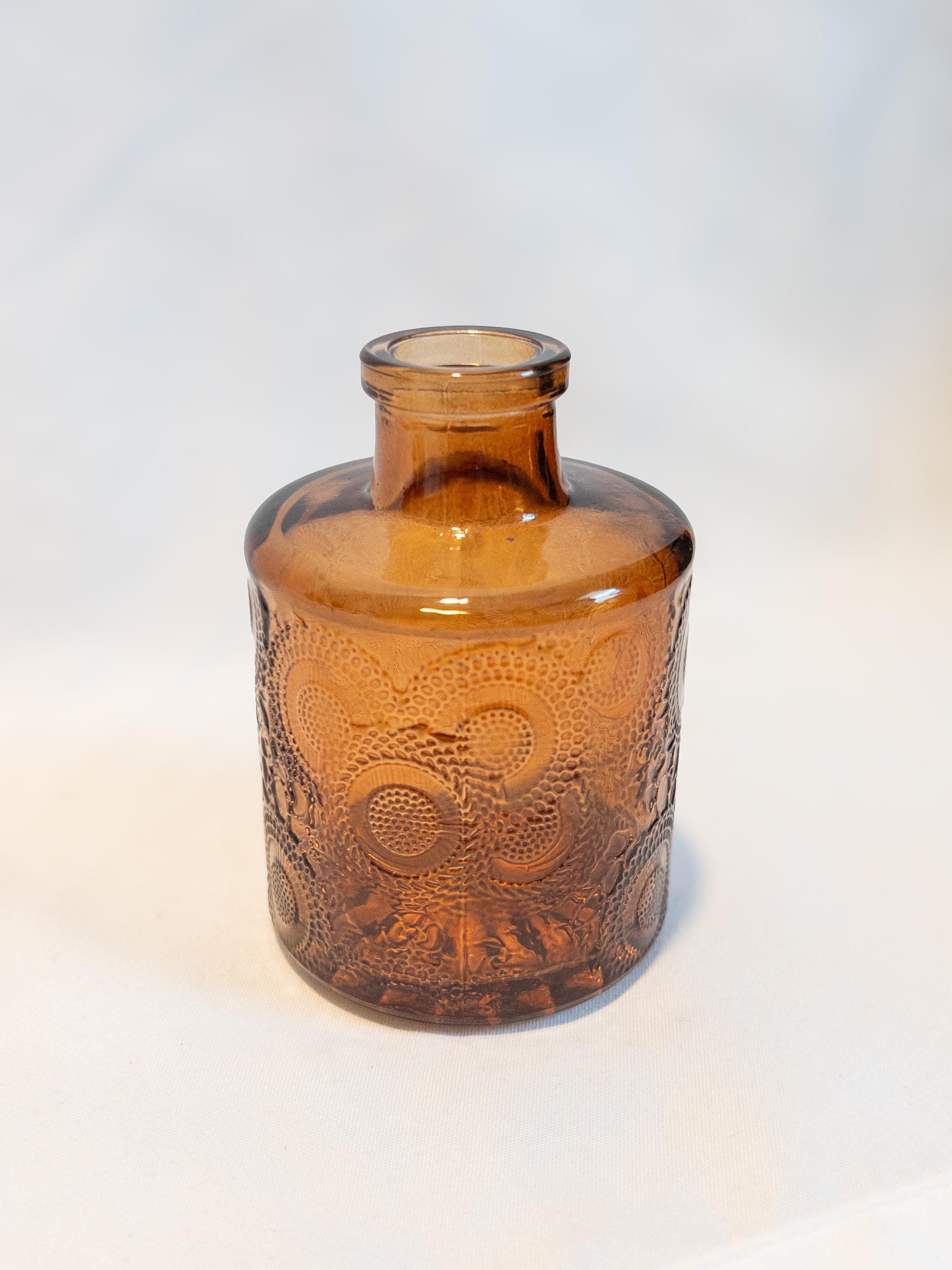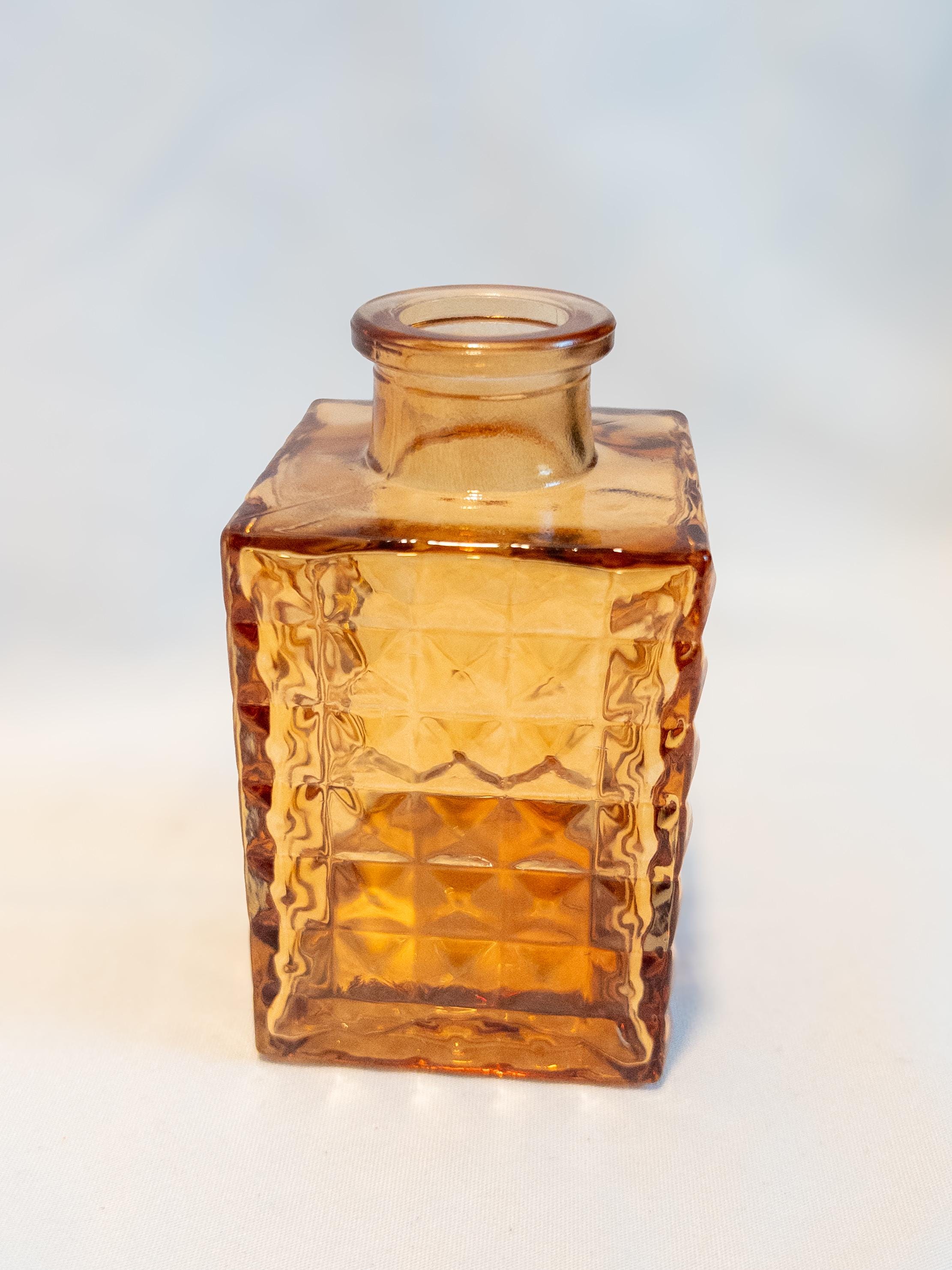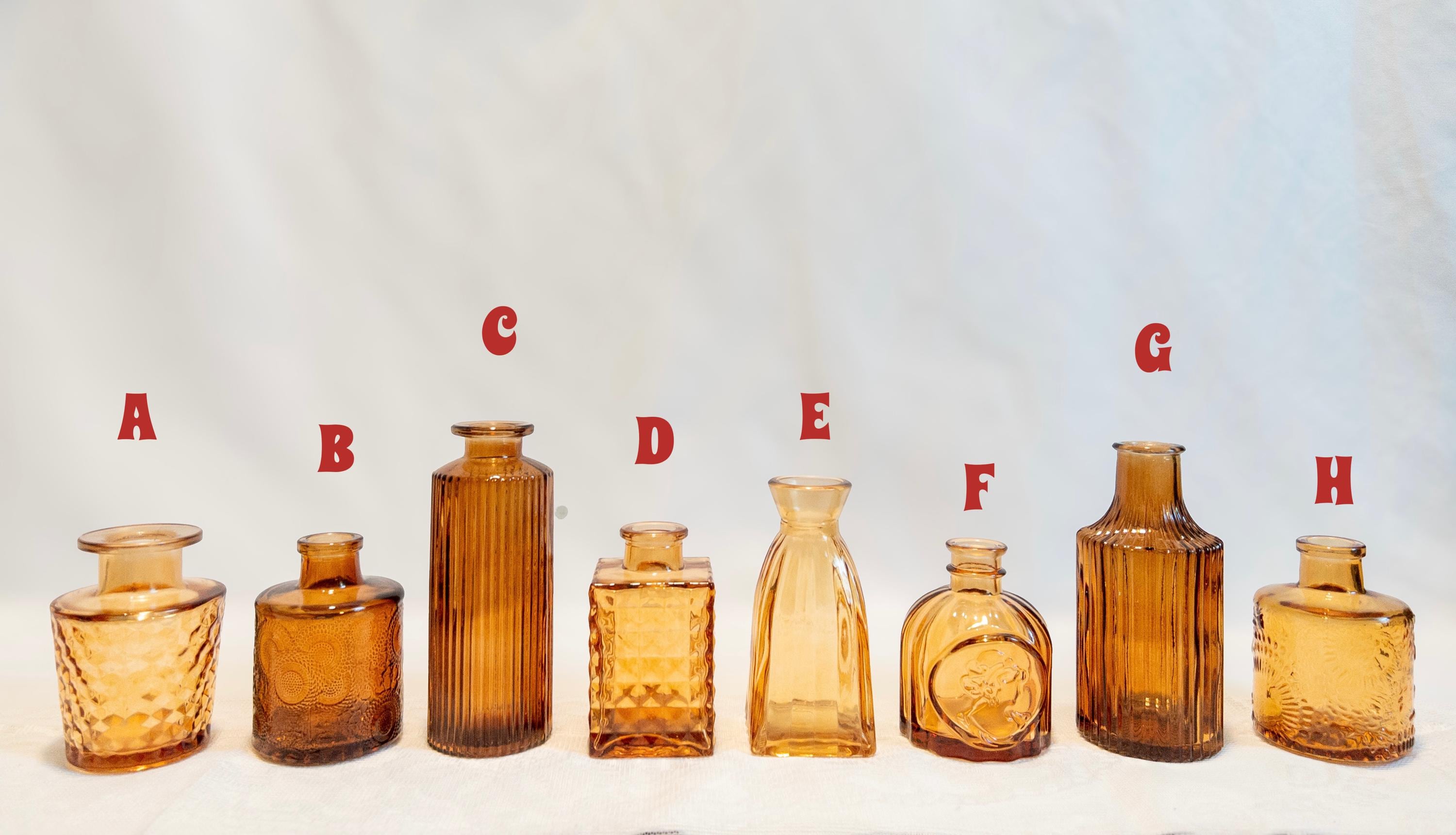 A curated collection of honey amber glass bud vases with vintage-inspired texture and glow.