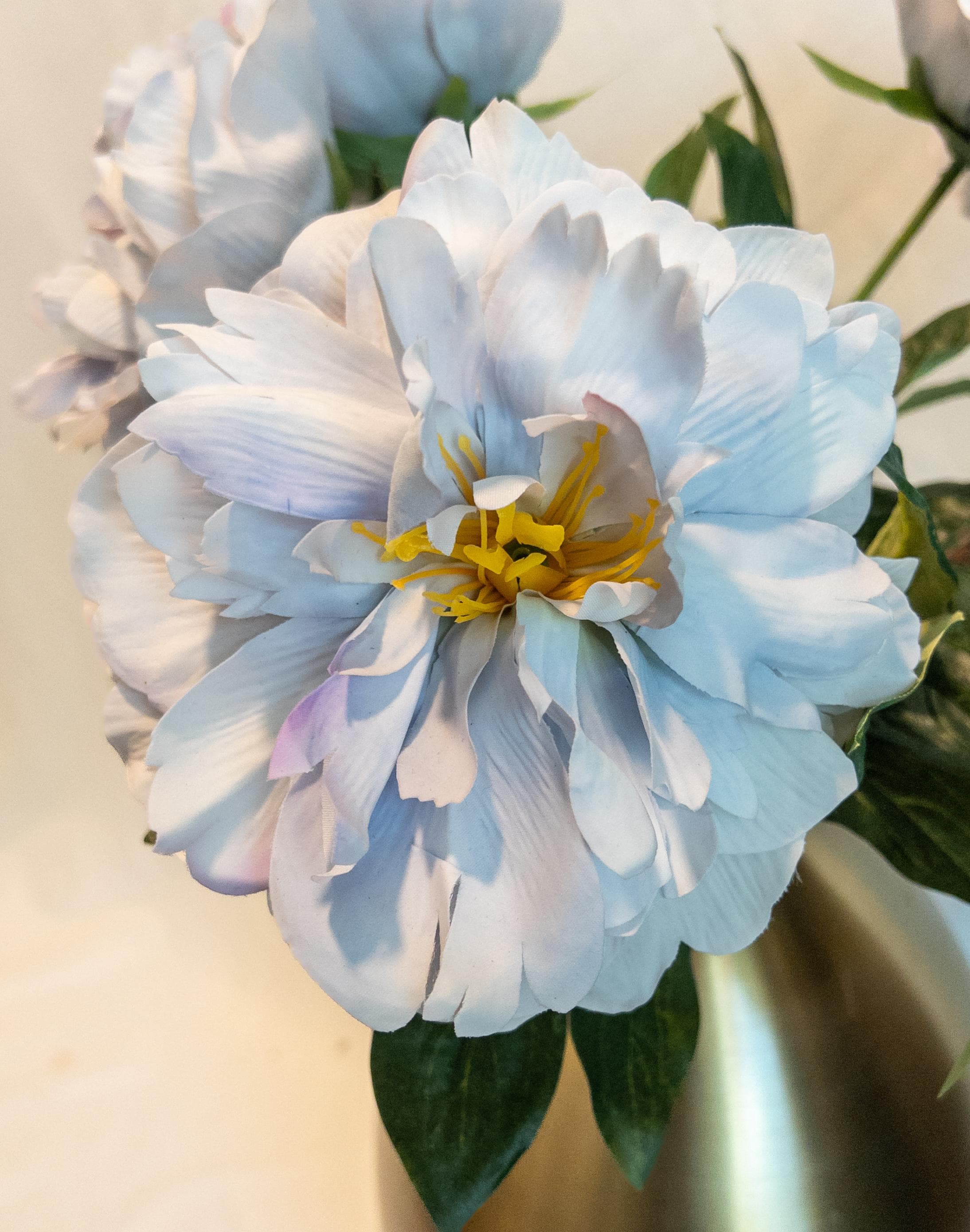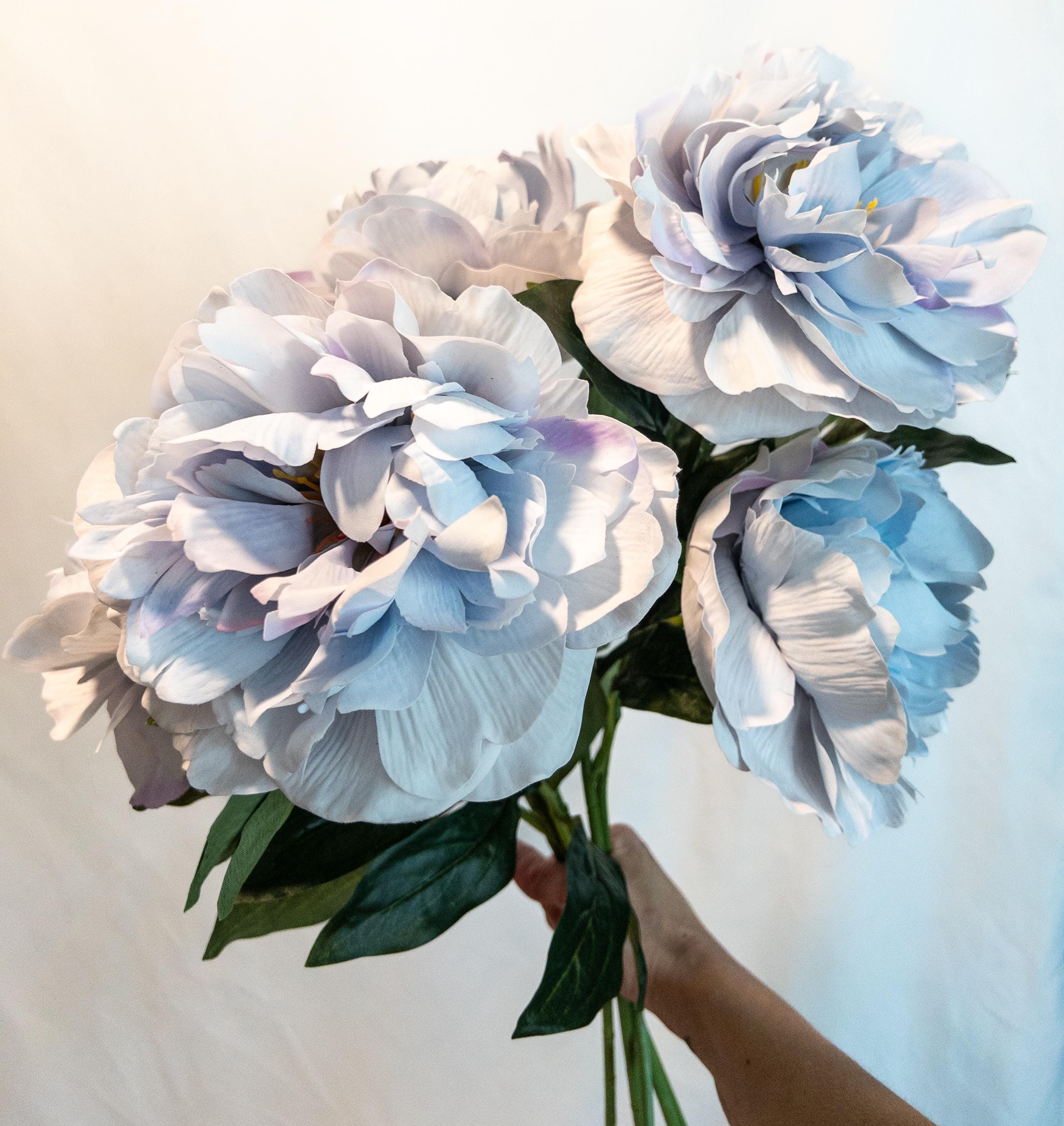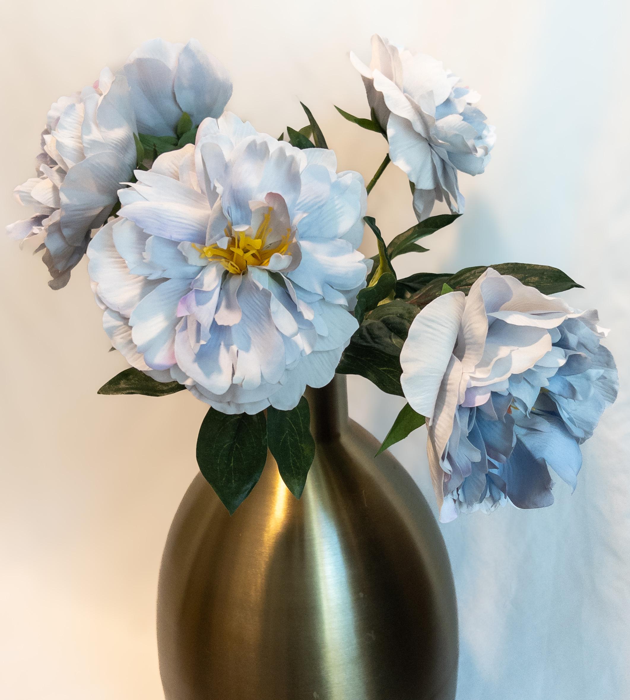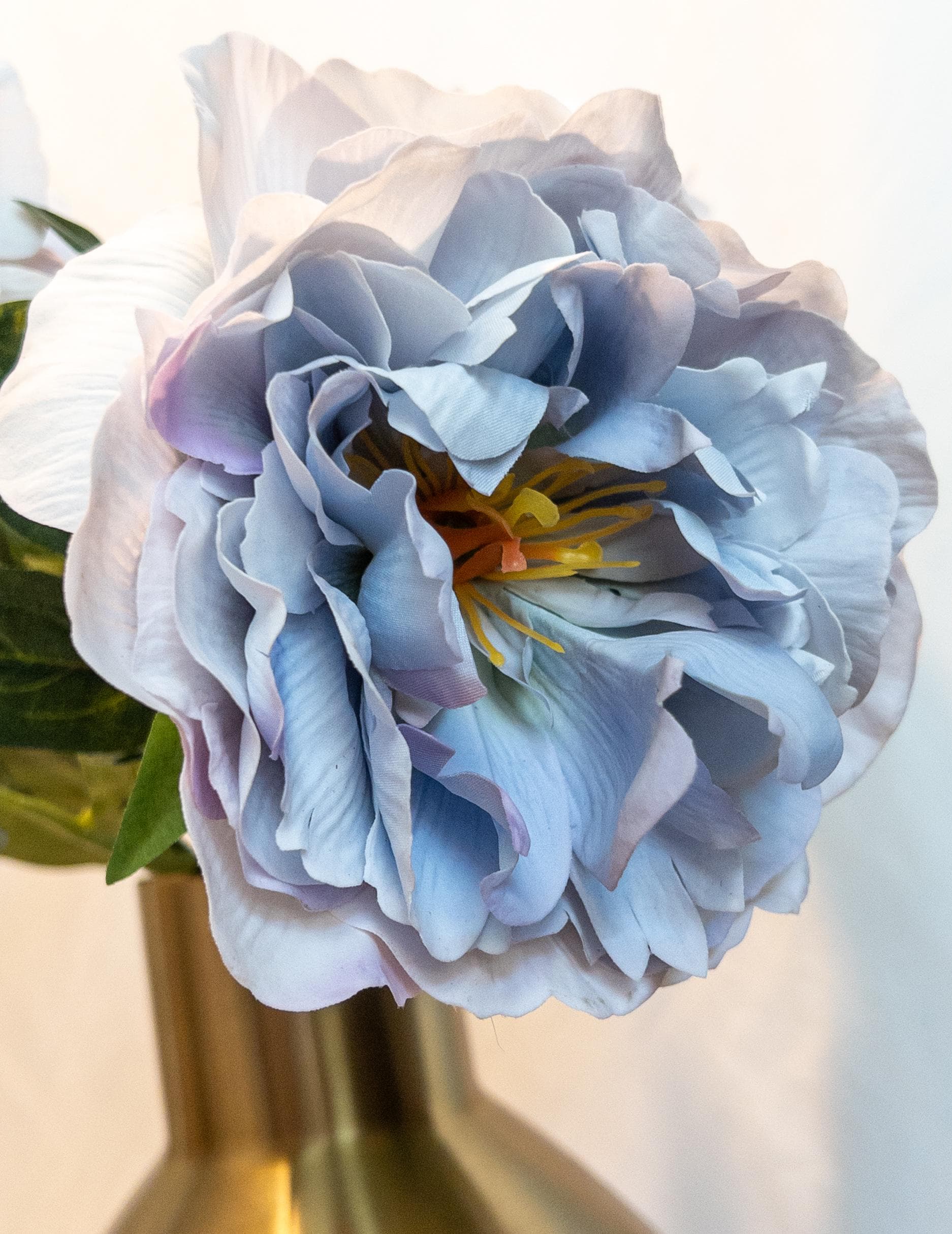This real touch peony features a dreamy powder blue hue with the faintest whisper of lavender, giving it that perfectly faded, old-world garden feel. The petals are full, delicate, and beautifully layered with a natural movement that feels freshly gathered.