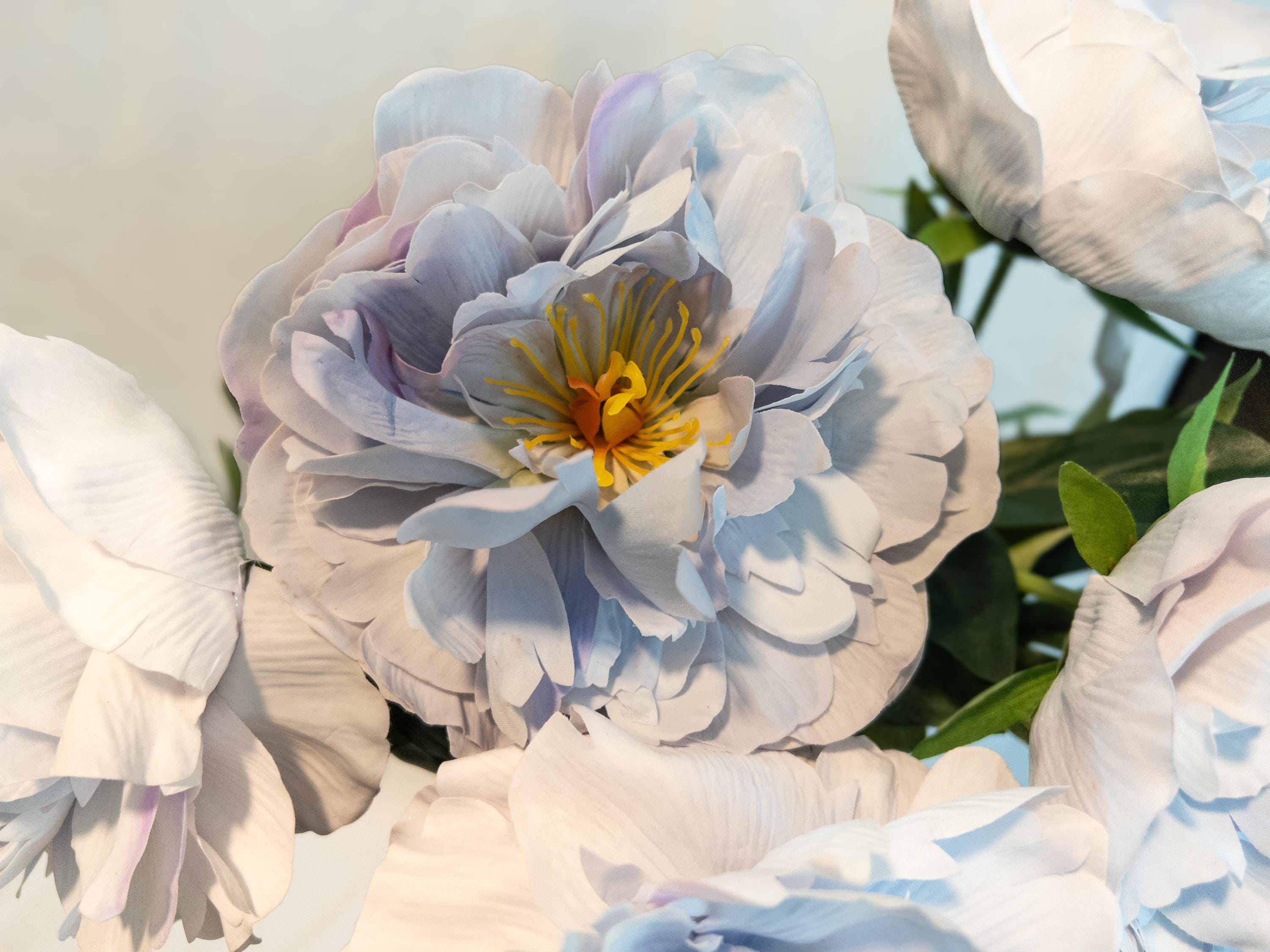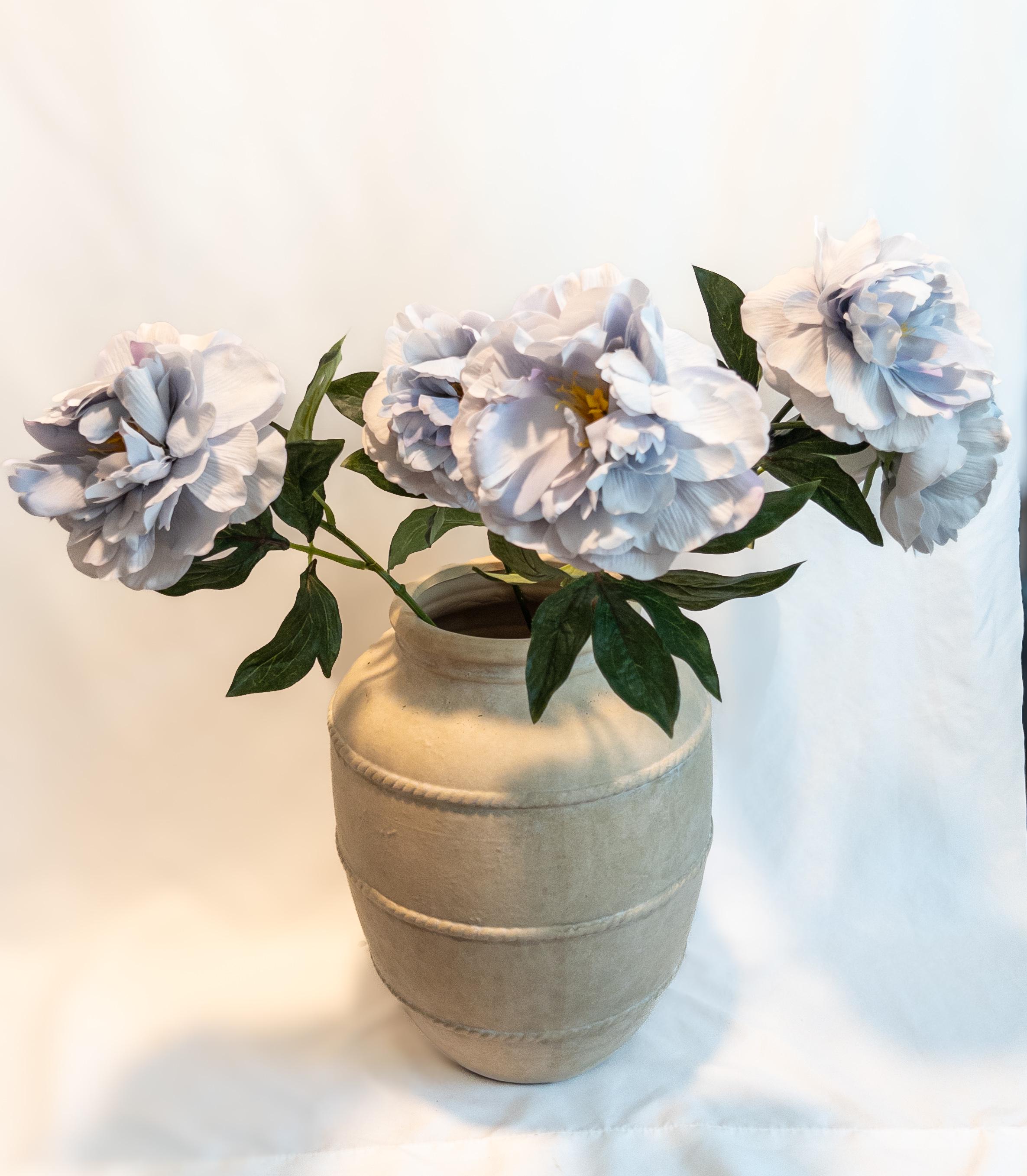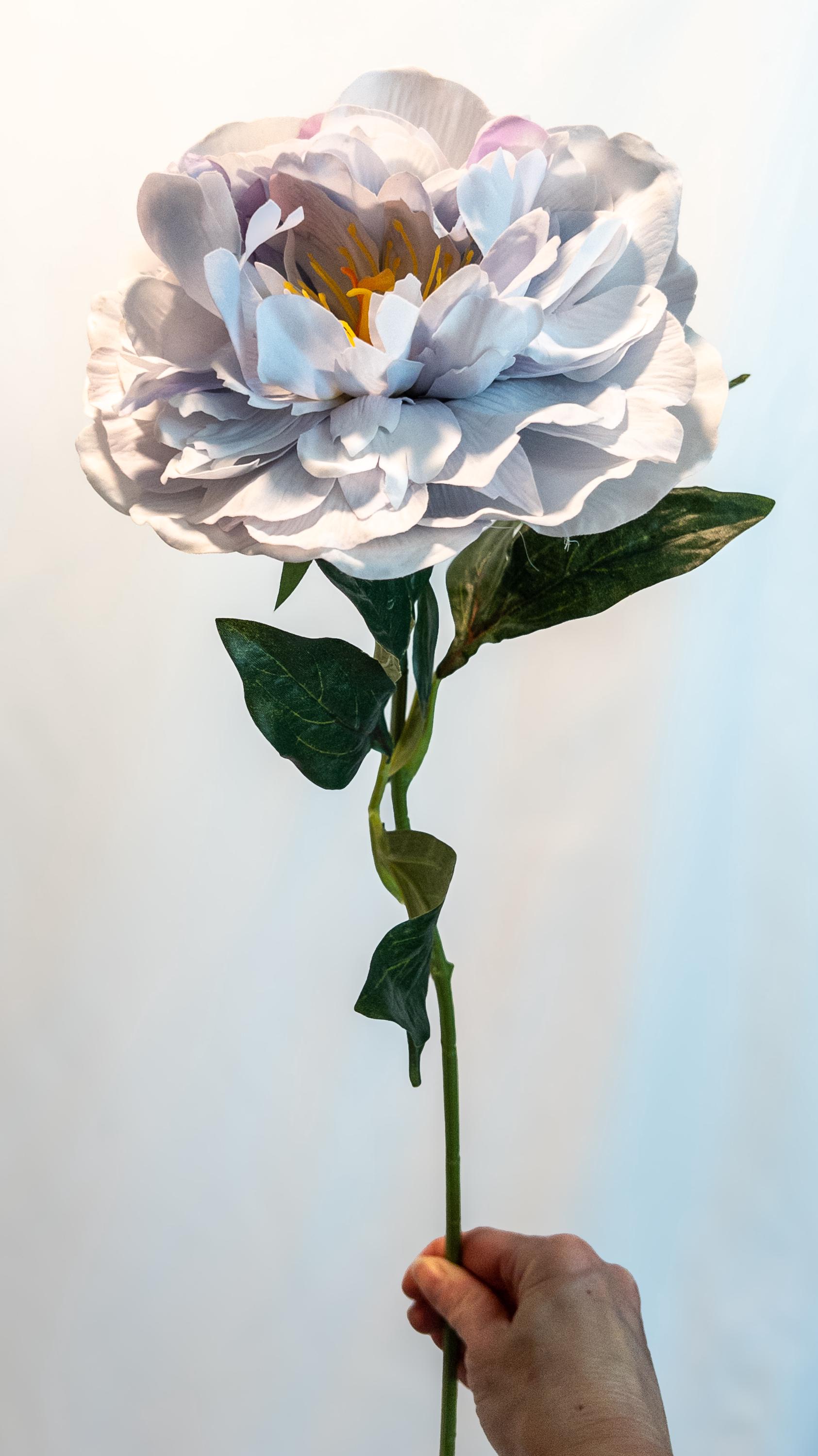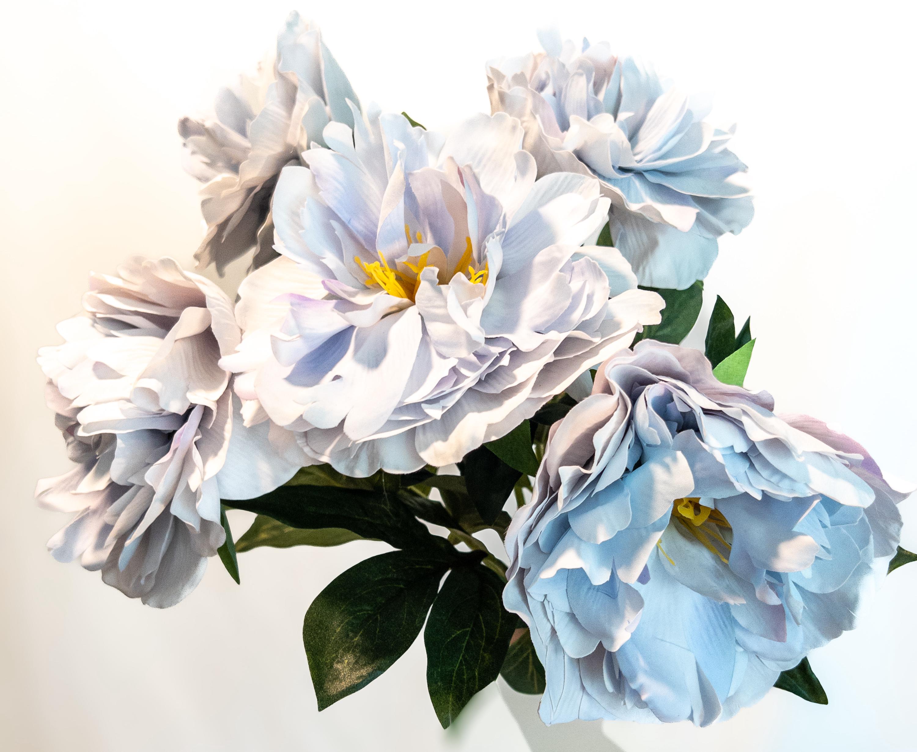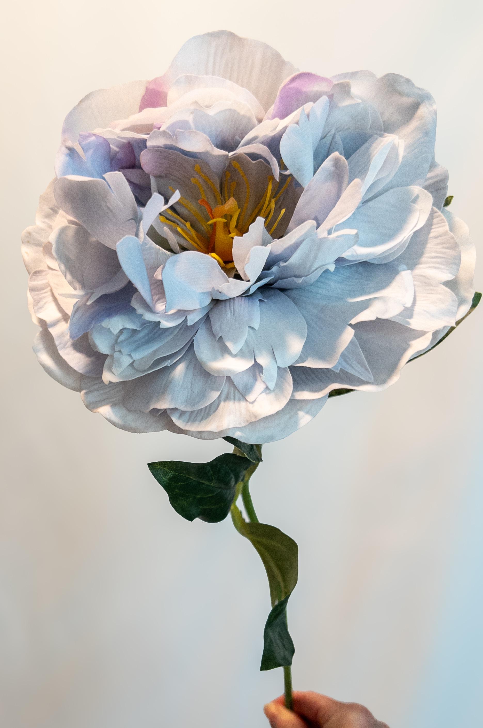 This real touch peony features a dreamy powder blue hue with the faintest whisper of lavender, giving it that perfectly faded, old-world garden feel. The petals are full, delicate, and beautifully layered with a natural movement that feels freshly gathered.
