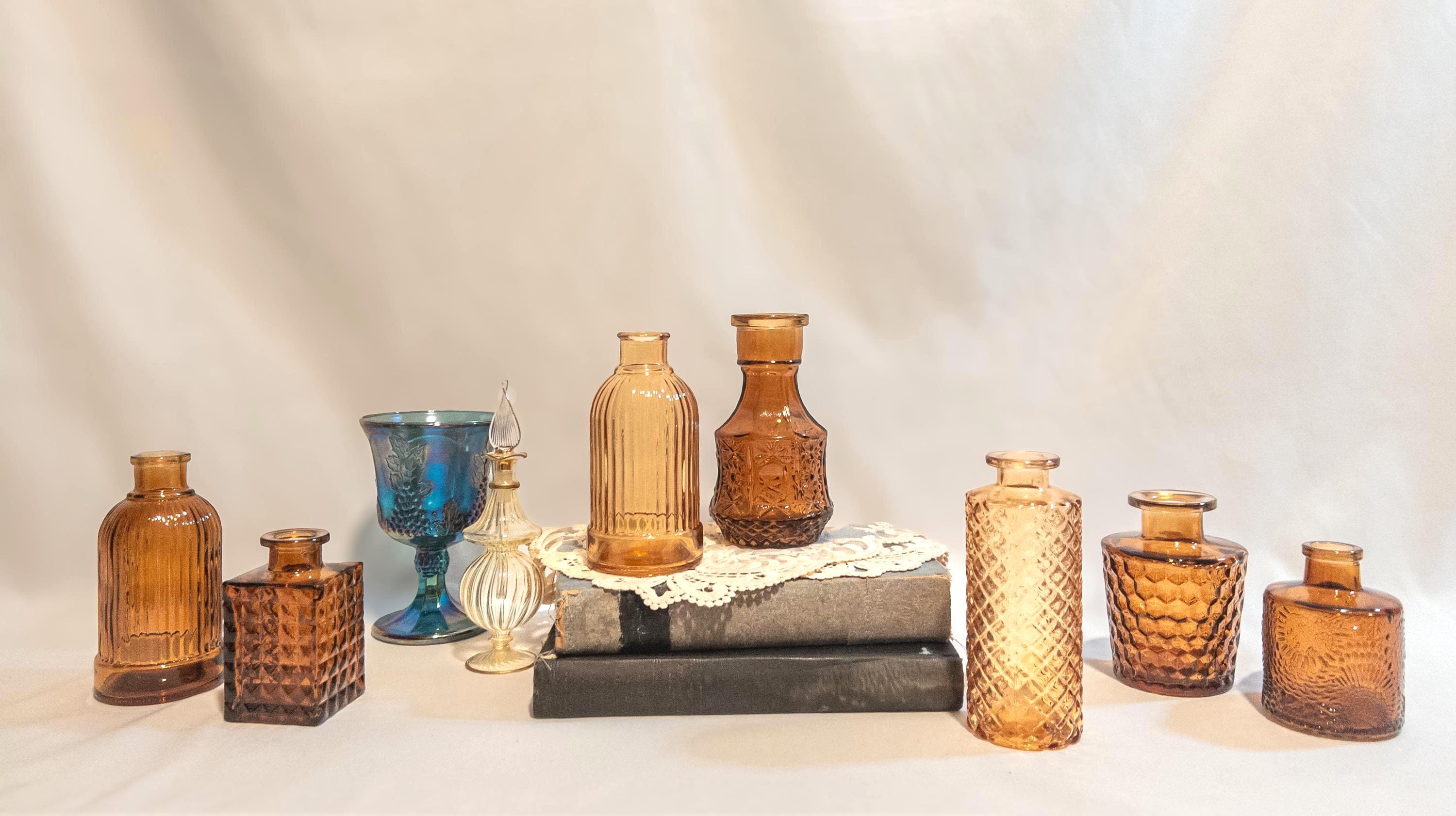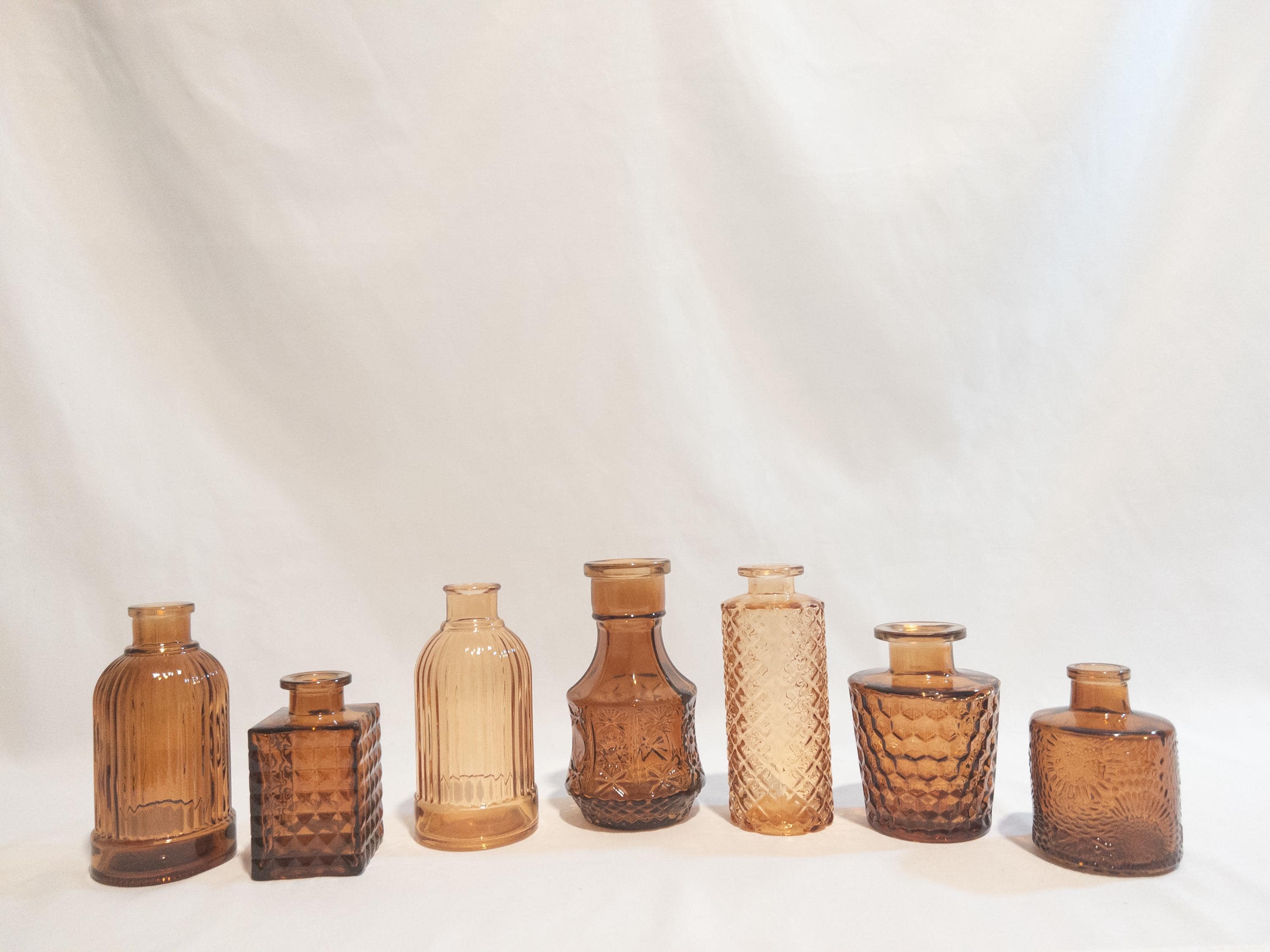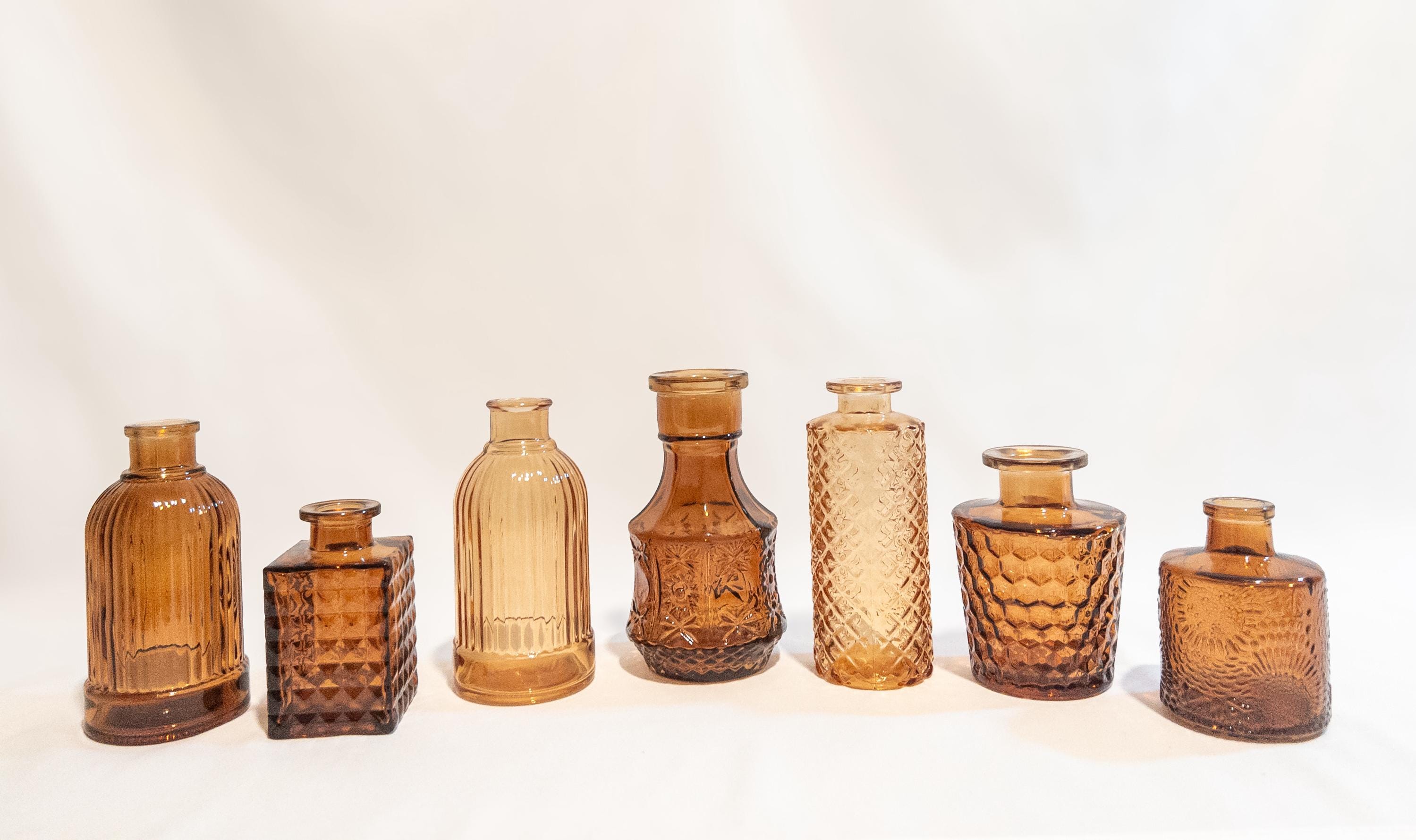 • Sold individually • Vintage-inspired amber glass in varying tones • Approximate dimensions listed per style • Ideal for single stems, small posies, or styling shelves & tablescapes • Color tones may vary slightly due to lighting and screen settings