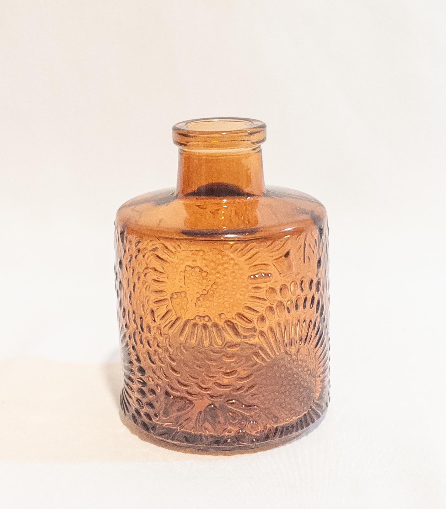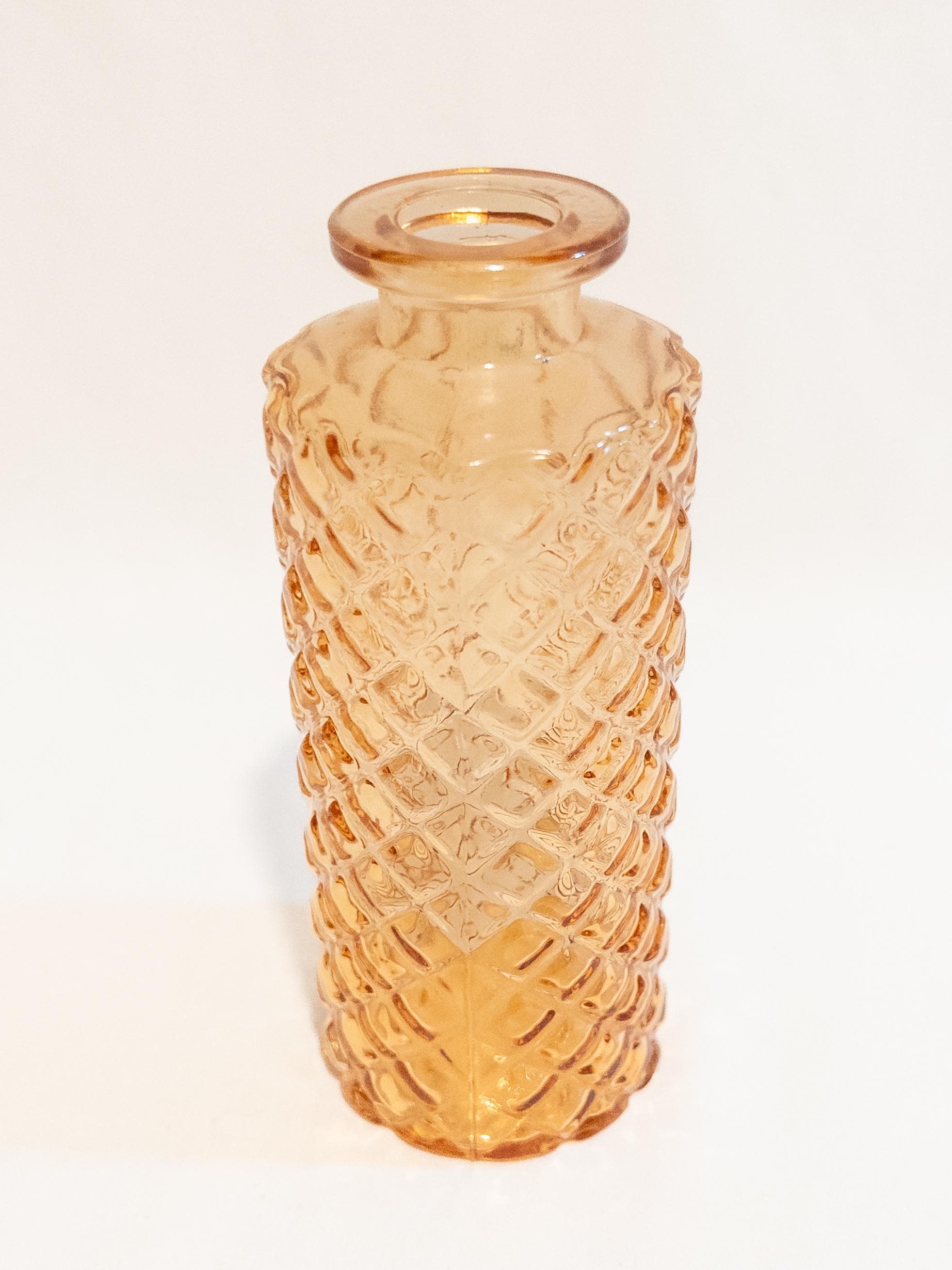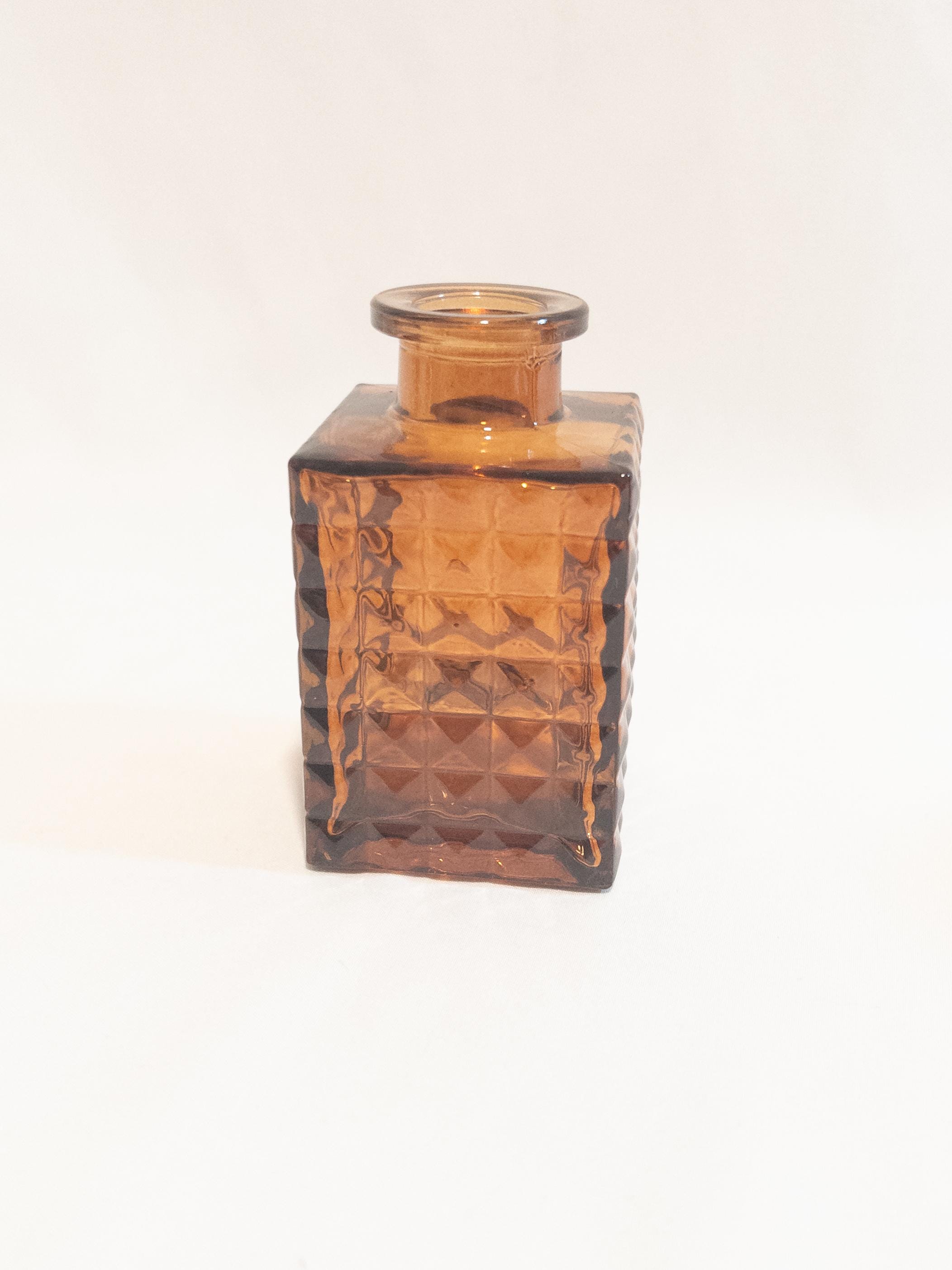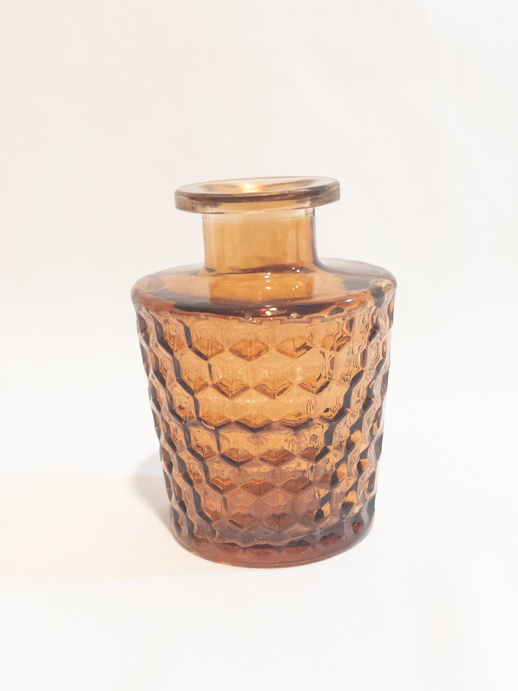 Tall Ribbed Bottle (5” x 2.5”) Petite Geometric Block (3.5” x 2”) Light Honey Ribbed Bottle (5” x 2.5”) Etched Floral Decanter (5.5” x 3”) Tall Diamond Column (5” x 2”) Honeycomb Rounded Vase (3.7” x 3”) Sunburst Bottle (3.25” x 2.5”)