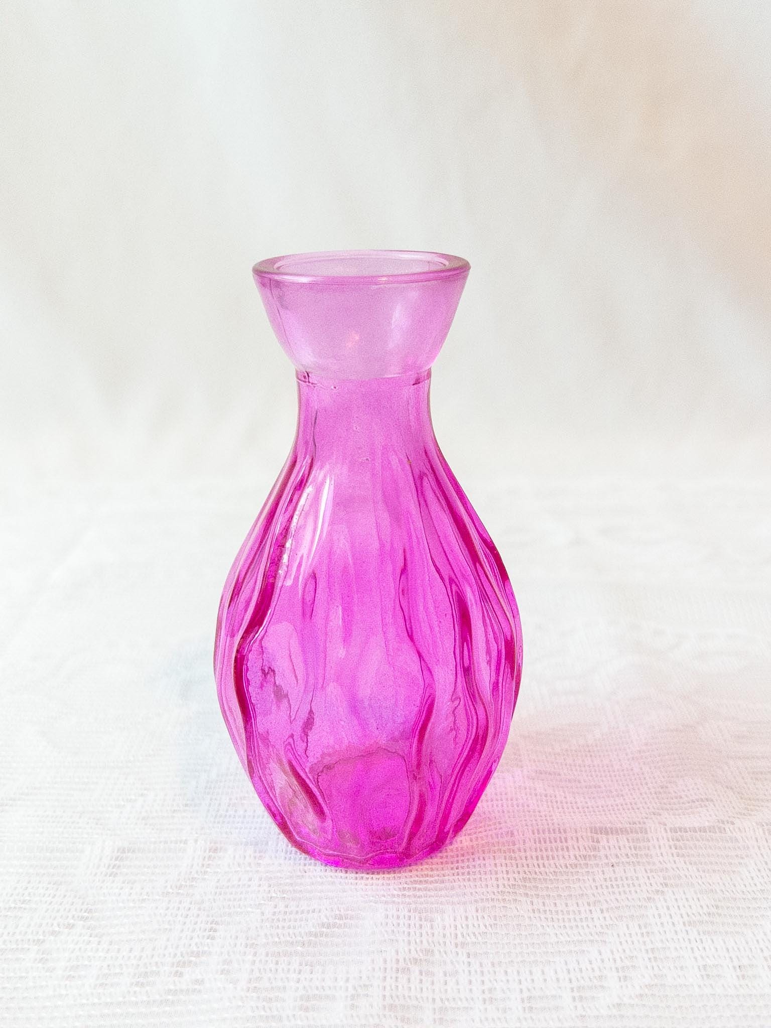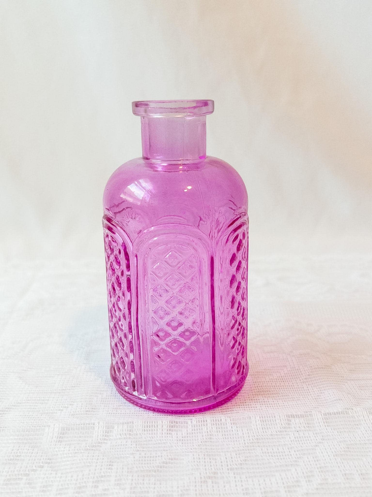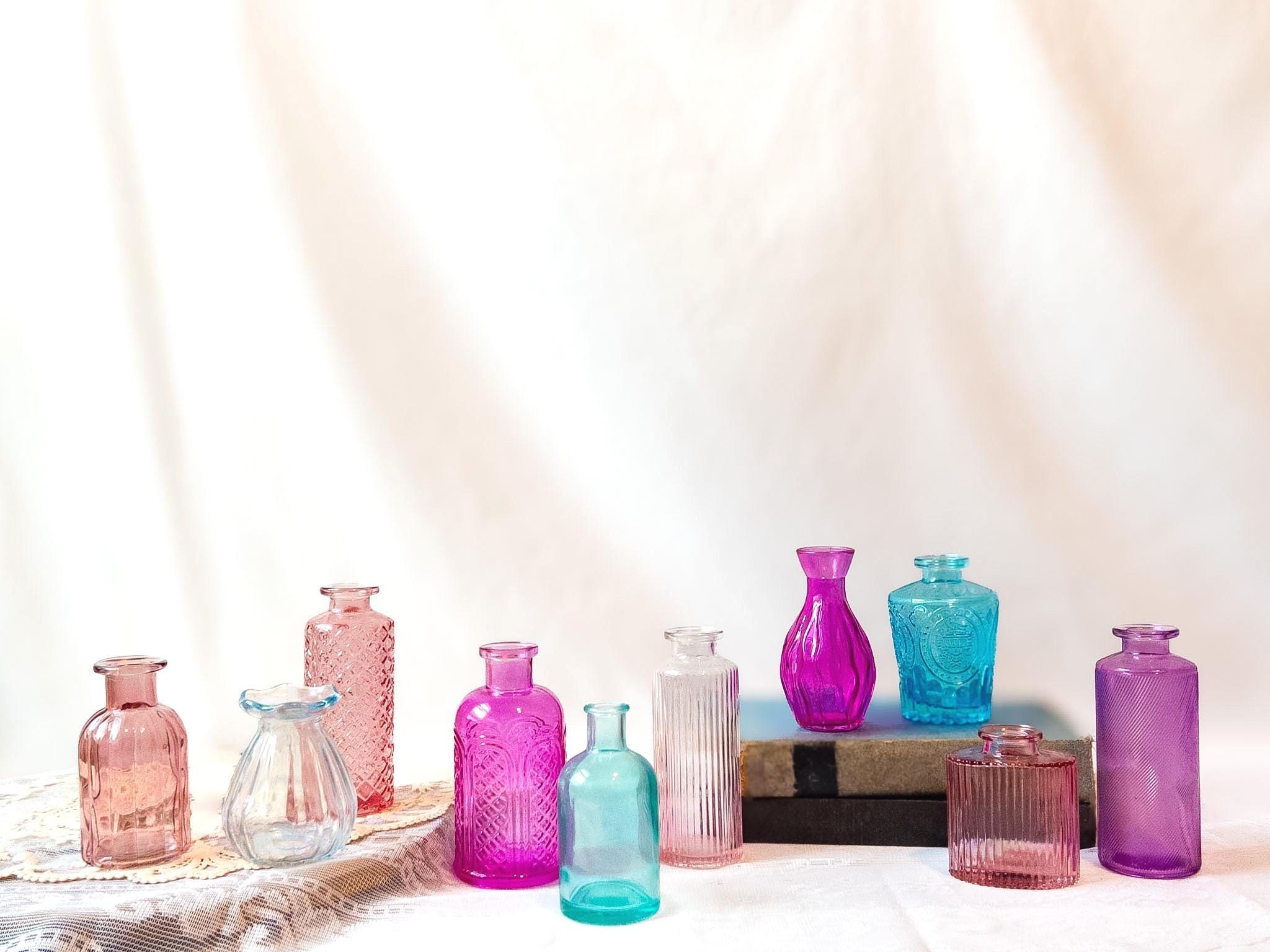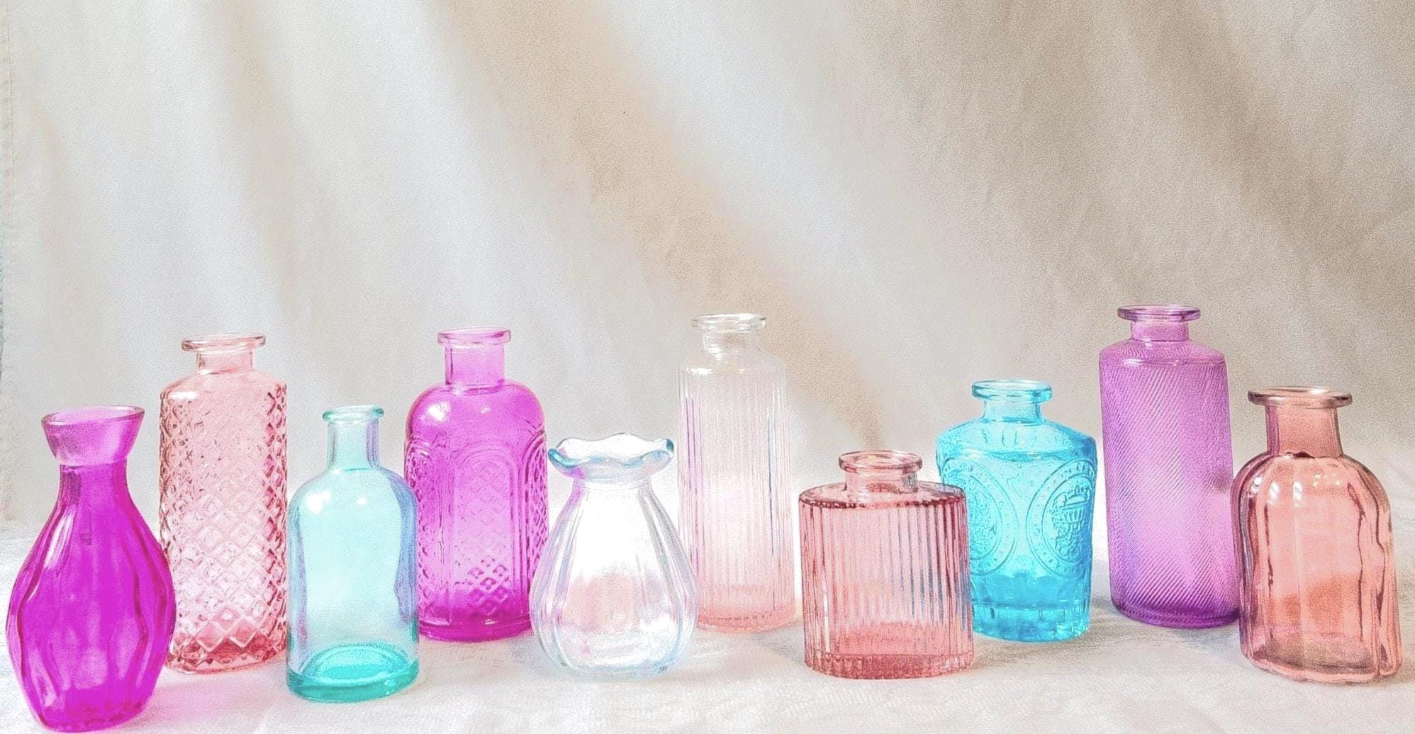 Sweet, whimsical, and wonderfully romantic - this collection of vintage-style glass bud vases feels like something straight out of a fairy tale. Each one is crafted with beautifully textured pressed glass in a dreamy palette of fuchsia, blush pink, mint teal, icy clear, soft lavender, and rich violet. With their varied silhouettes - from curvy apothecary bottles to delicate scallop-rimmed carafes - every piece has its own personality while feeling perfectly at home alongside the others.