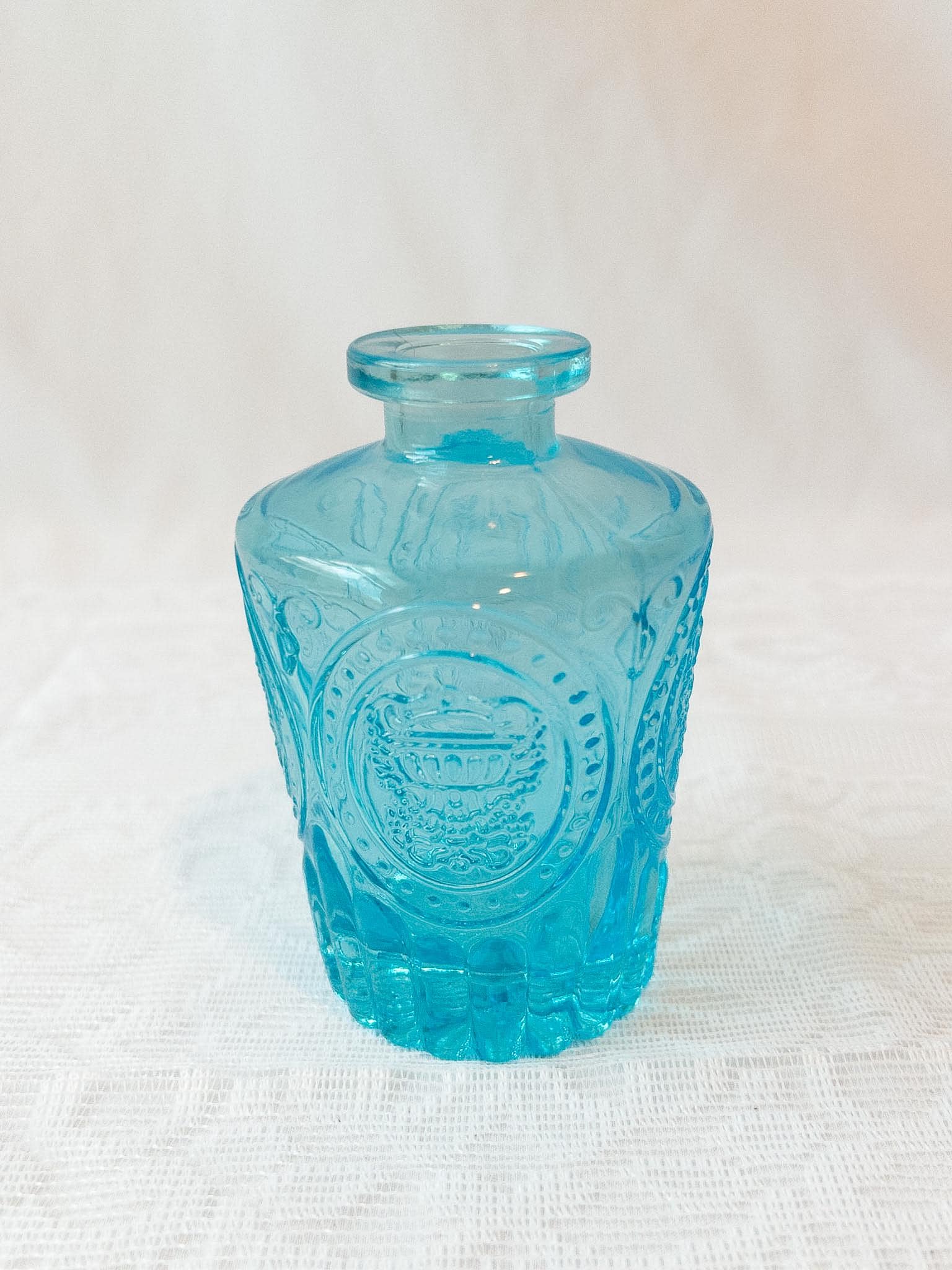 • Cerulean Blue — Rounded bottle with embossed medallion cartouche detail | 4"H x 2.5"W